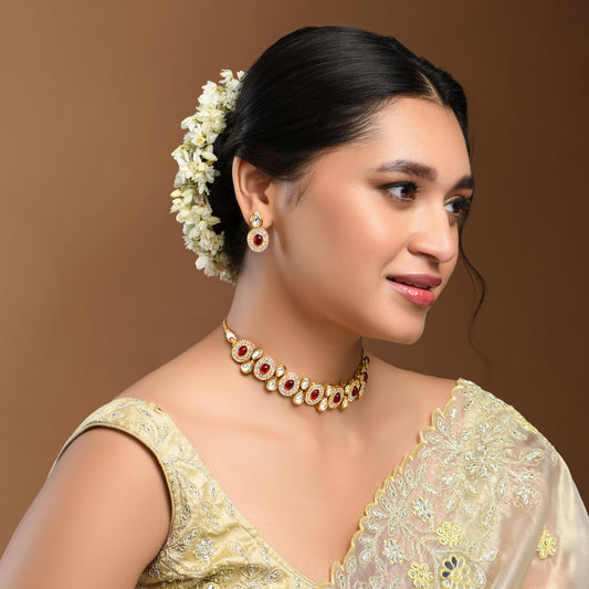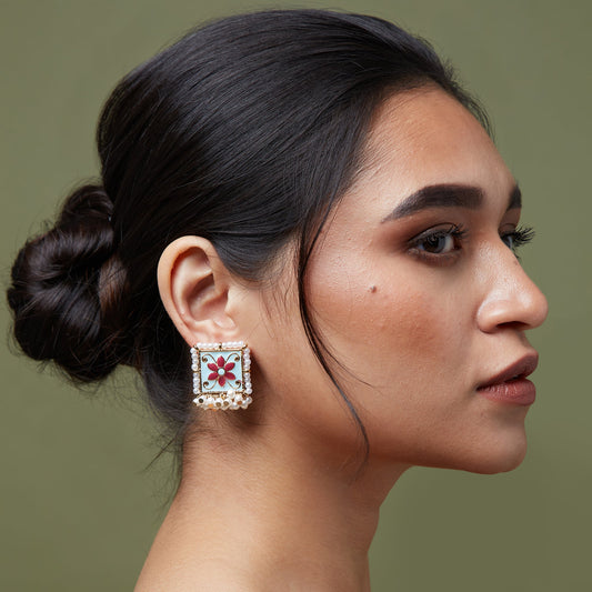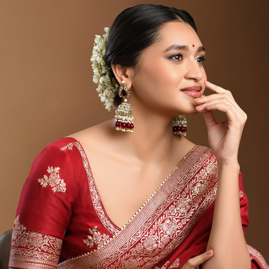 Kundan Jhumka Pearl and Red Beads Drop Earrings