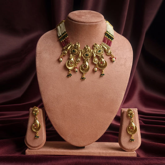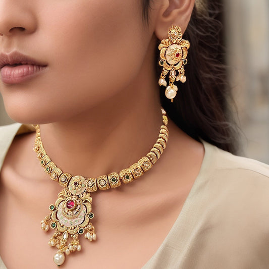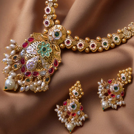 Golden Enamelled Phool Red and Green Stone Embellished Necklace Set