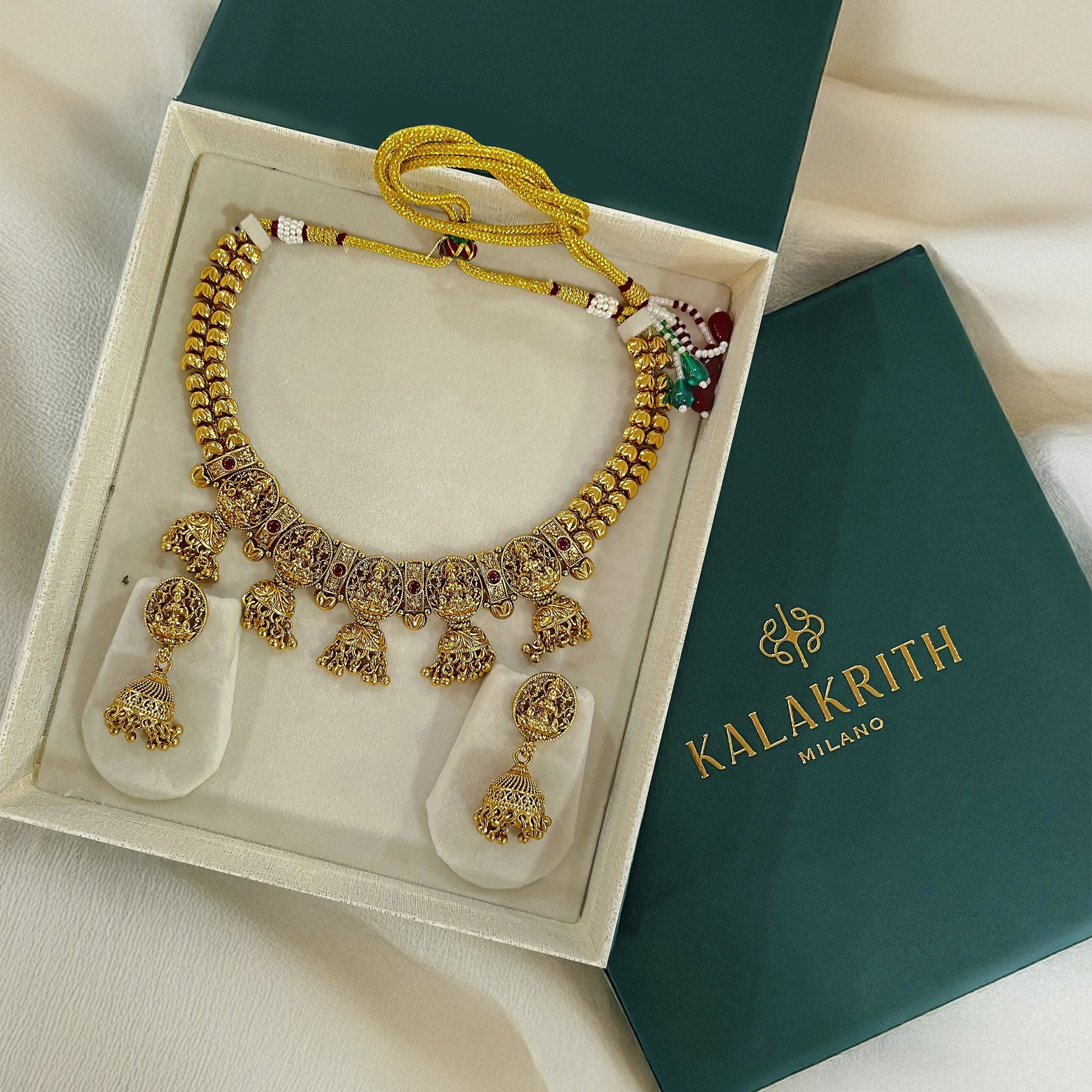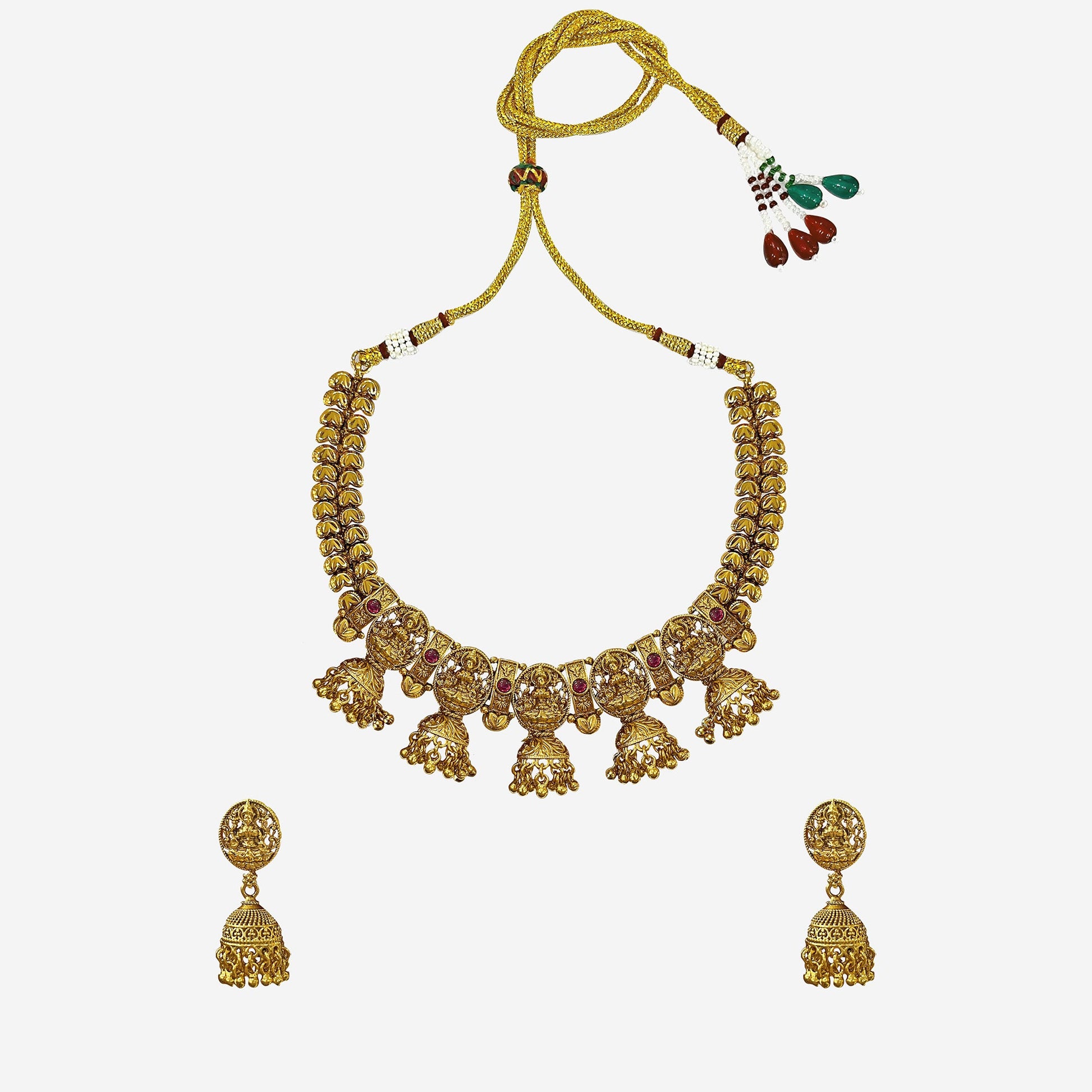 Kalakrith Milano Women temple necklace features five jhumki drops, each crowned with a Lakshmi motif and ruby accents for a divine touch. Paired with matching jhumkis, it is elegantly tied together by a repetitive petal-motif band.