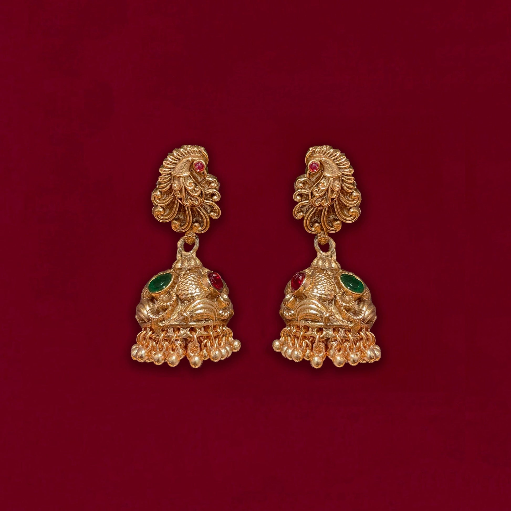 This gold necklace and earring set features a stunning Laxmi temple design, symbolizing prosperity and abundance. The intricate craftsmanship is complemented by a side gold bead chain, enhancing its elegance. Adorned with vibrant green and red beads, this jewelry set is perfect for adding a touch of traditional charm to any outfit, making it an ideal choice for festive occasions or special celebrations.