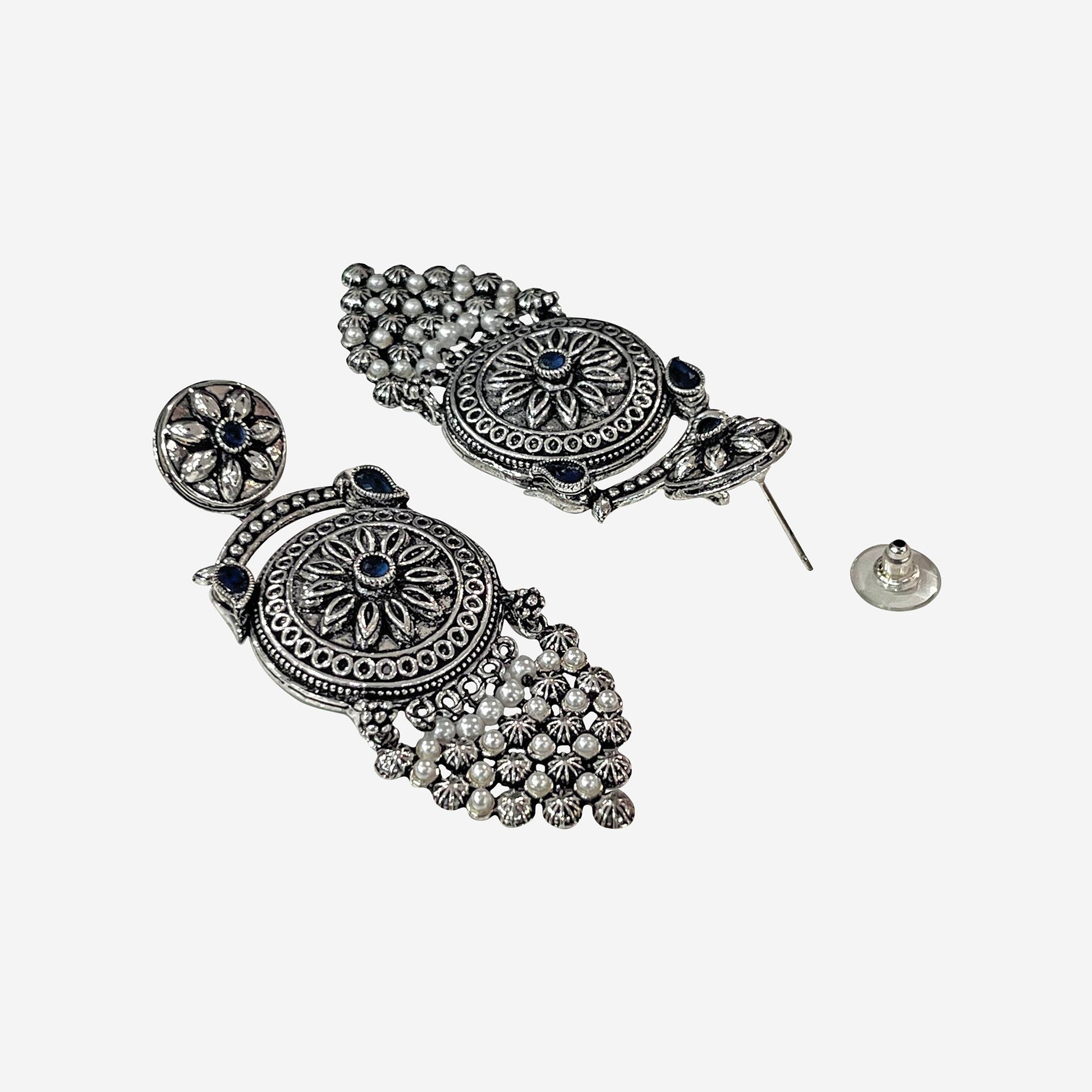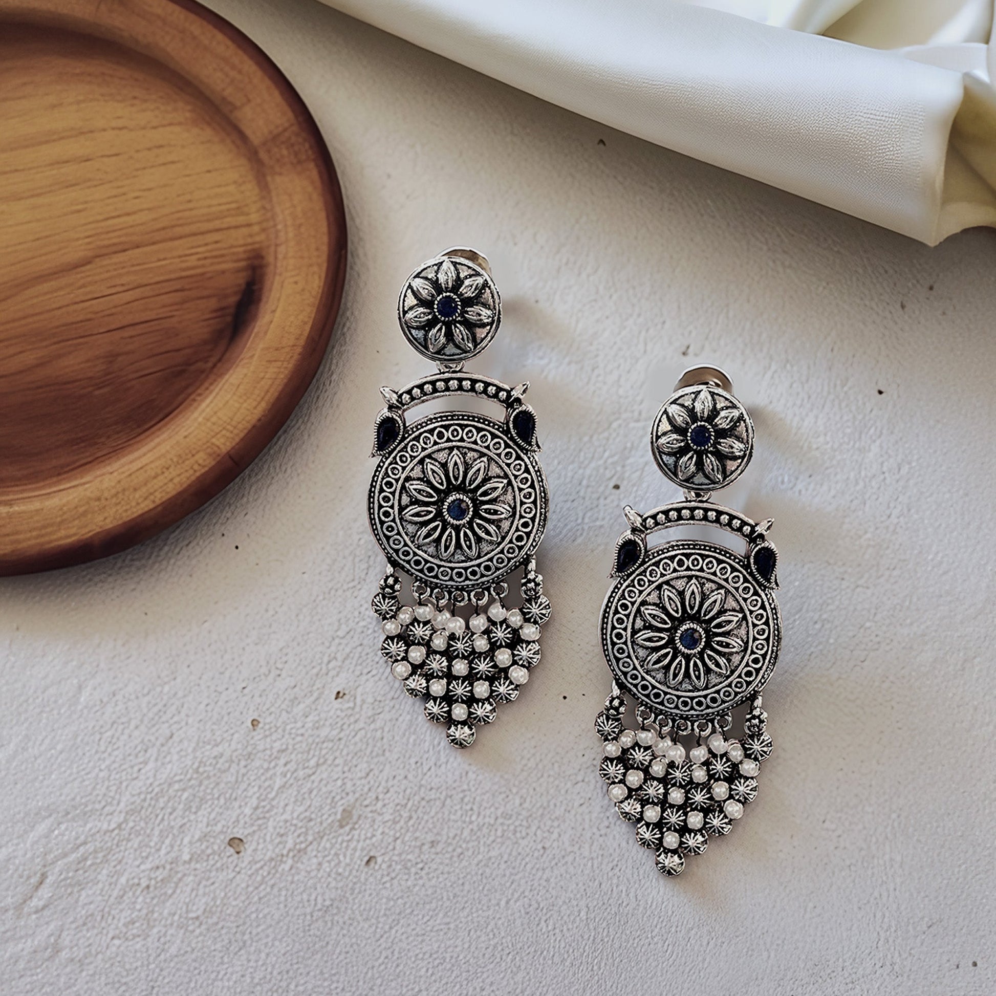 Kalakrith Milano Women Oxidized silver earring with a circular mandala-inspired motif, detailed floral carvings, blue stone accents, and layered ball hangings. The statement design adds a bold ethnic charm. Team it with traditional or Indo-western outfits for festive gatherings or cultural events.
