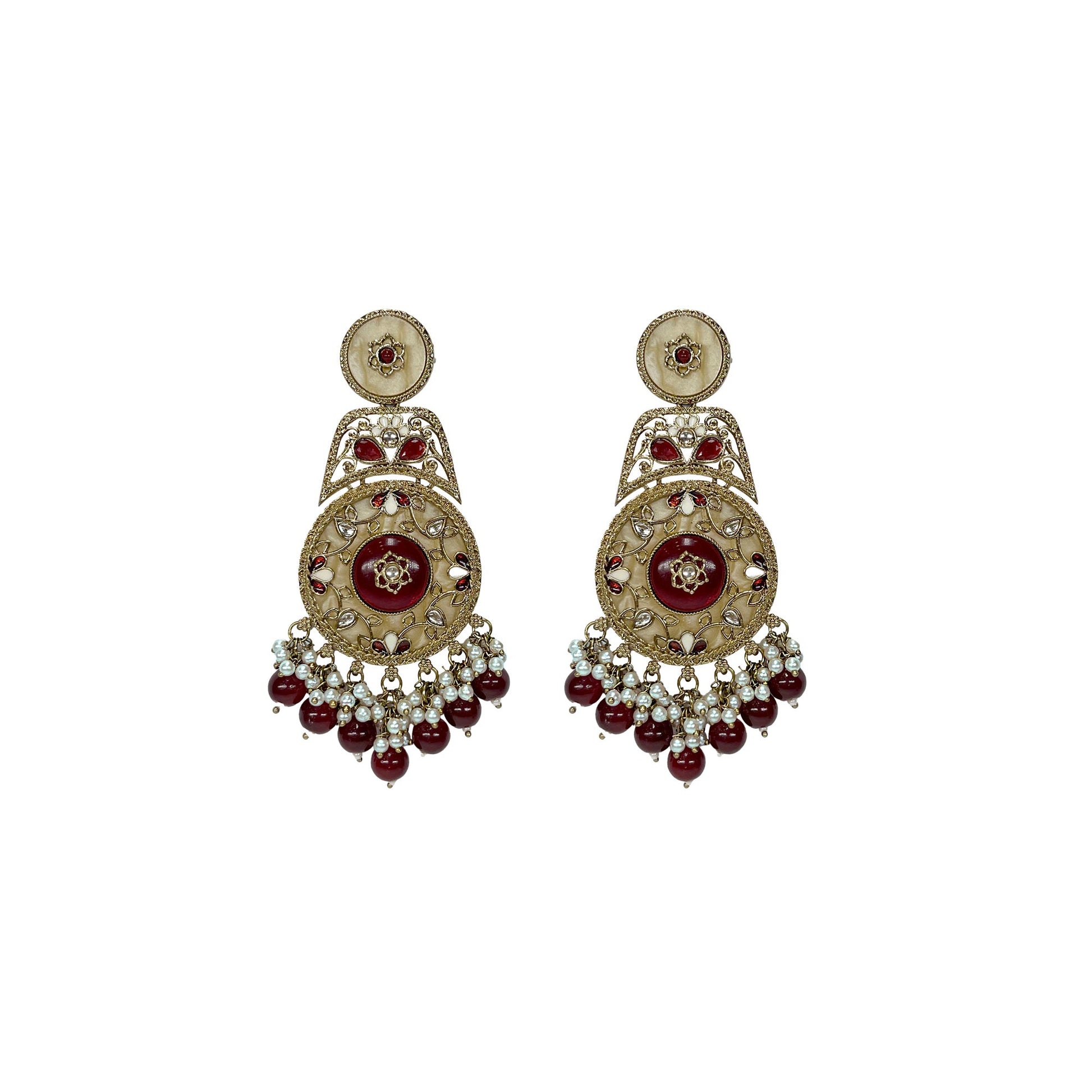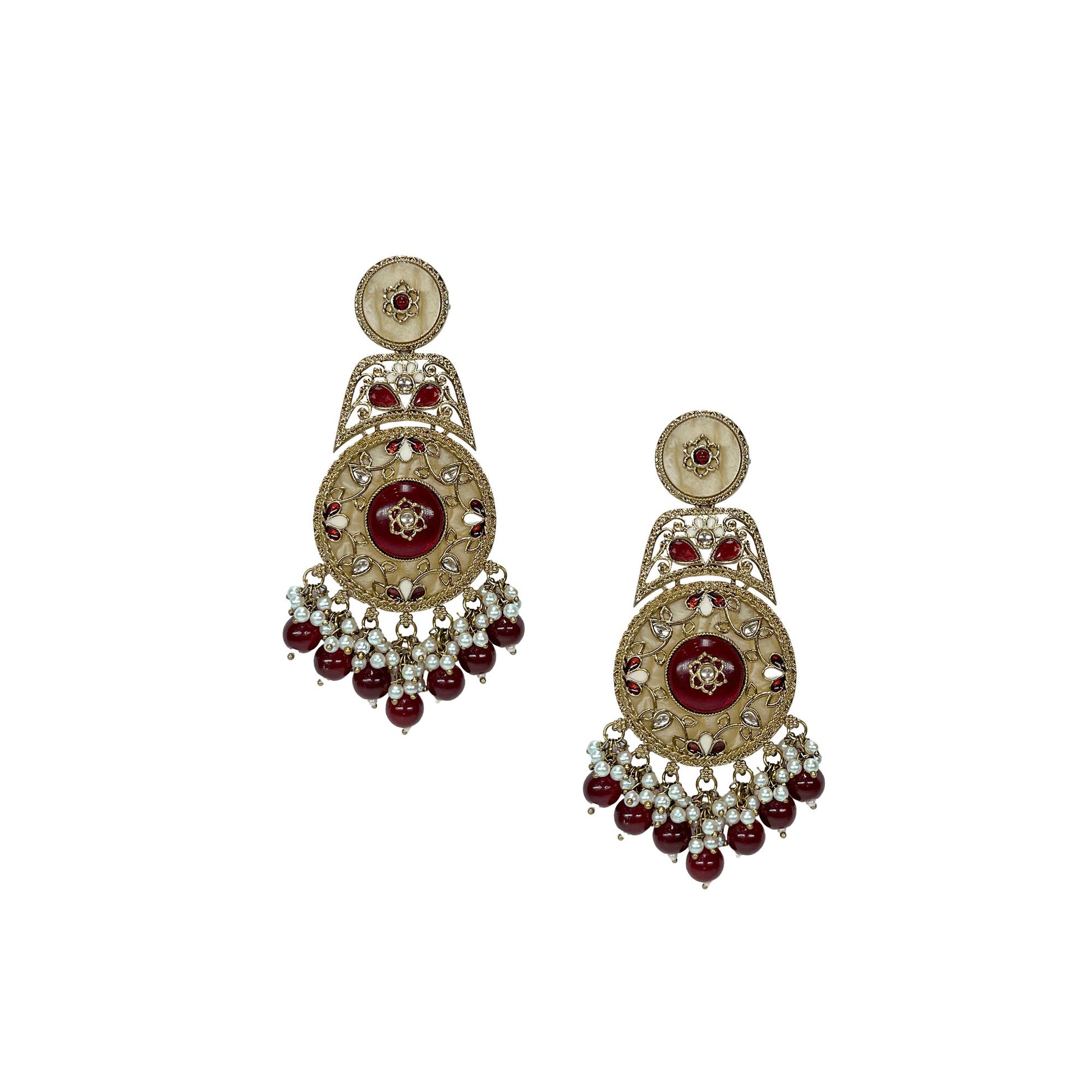 Kalakrith Milano Women Antique finish chandbalis featuring intricate detailing on a MOP stone base, highlighted with a striking orangish-red center stone. Finished with ruby and pearl cluster drops, these are bold statement earrings for festive looks.