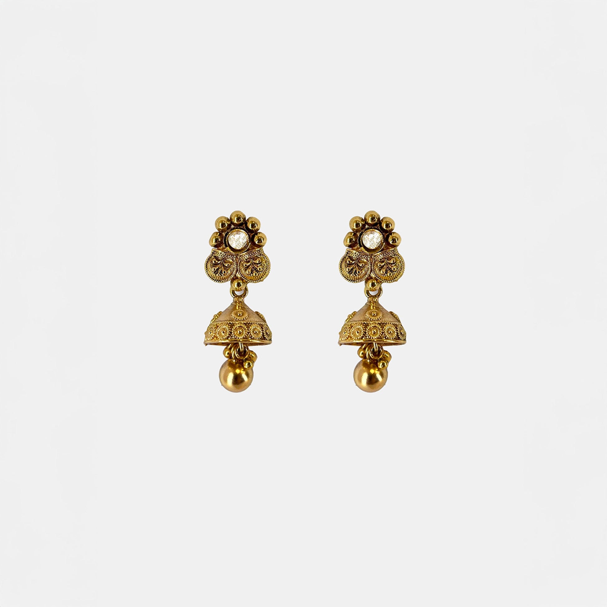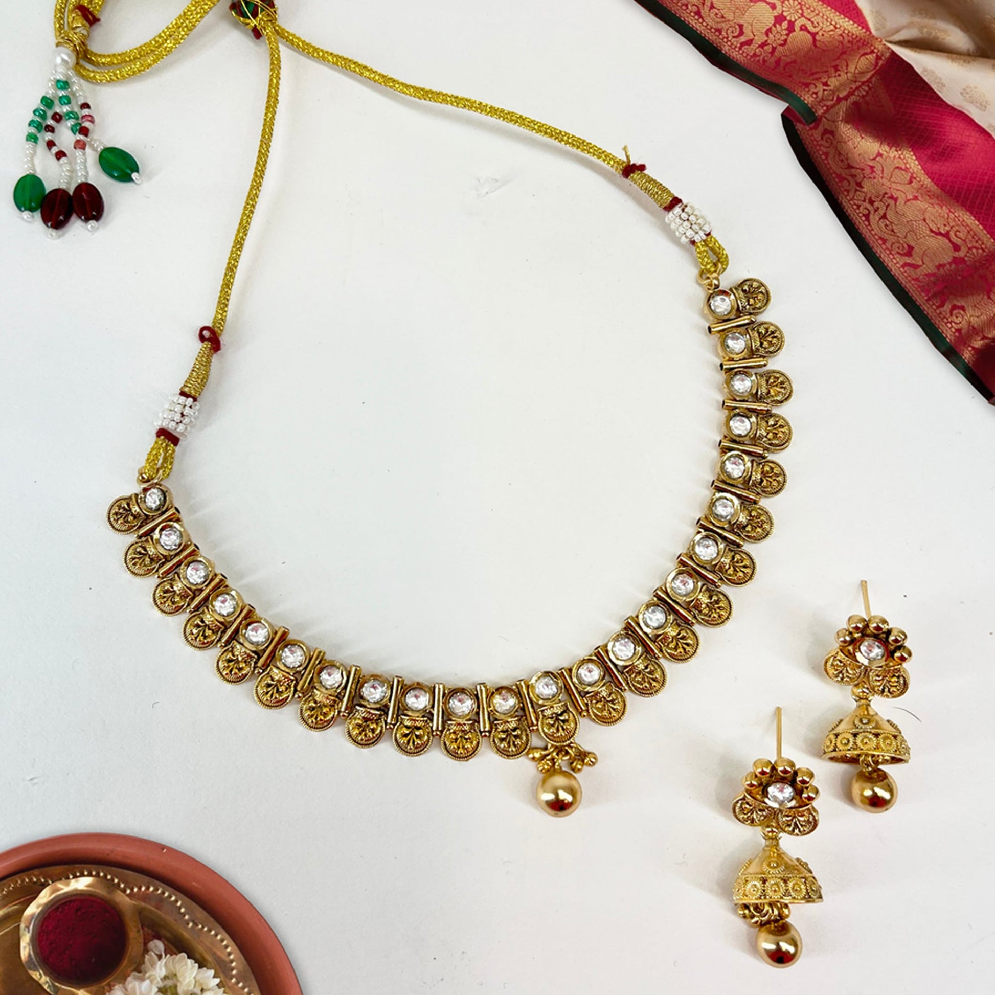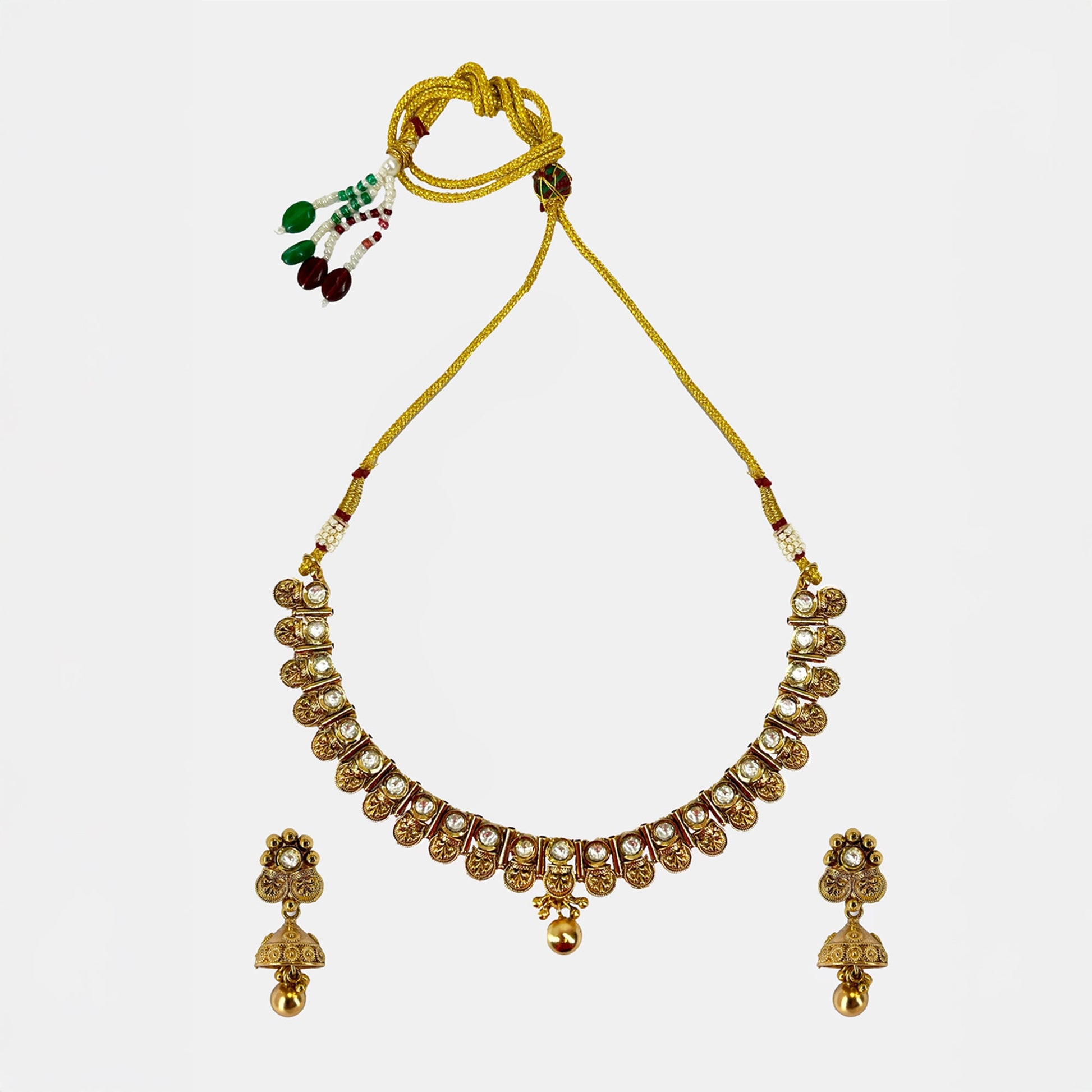Kalakrith Milano Women Gold Chandrika Antique Necklace Setis an antique choker boasts an intricate embossed design, with bezel-set zirconias adding a touch of brilliance, paired beautifully with elegant tiny jhumka earrings for a refined, classic look.