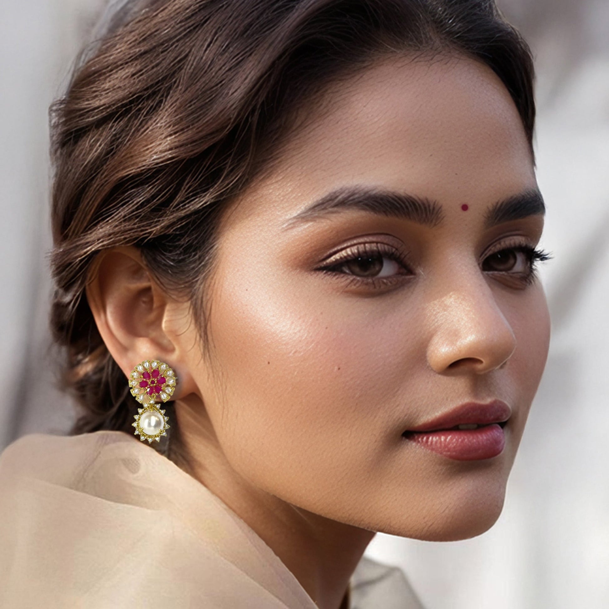 Kalakrith Milano Women classic short drop earring featuring lustrous pearls and radiant ruby stones with AD studded stones exhibiting effortless grace.