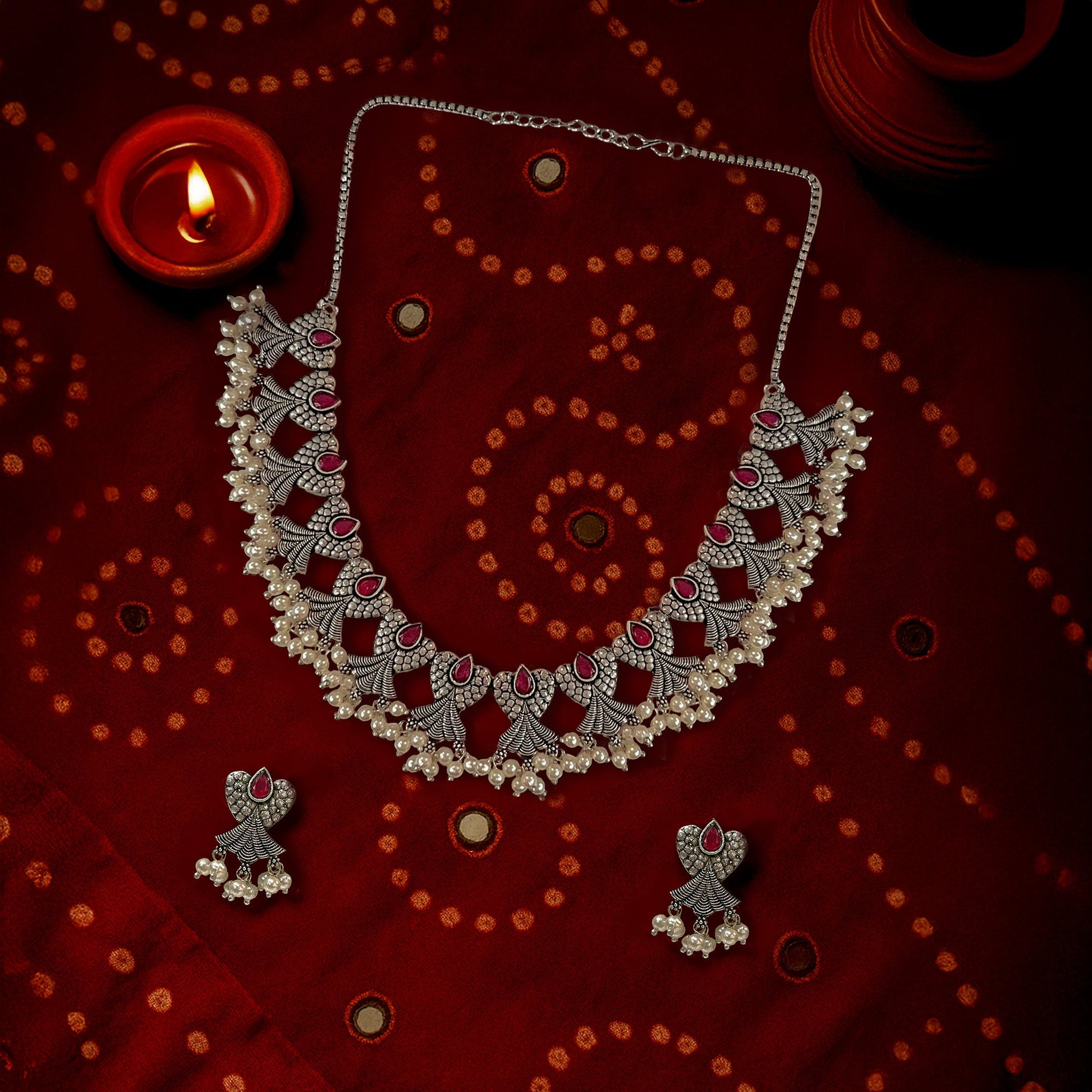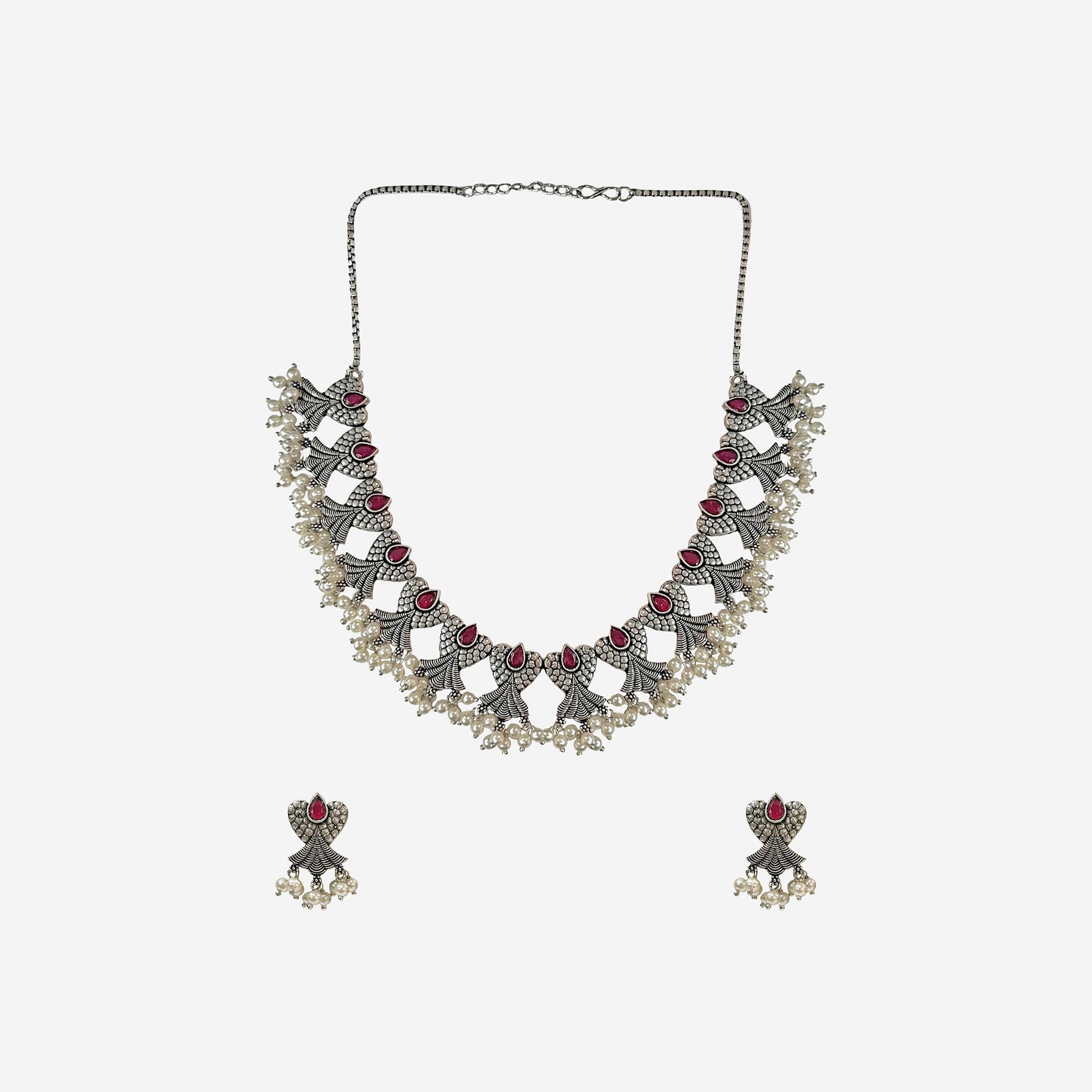 Kalakrith Milano Women oxidised necklace set showcases intricate floral motifs, each finely detailed with petal-like patterns and a bold red stone at the centre. The lower row of motifs resembles a fan-like structure, adding texture and a layered dimension to the piece. Paired with a matching stud that echoes the same design, this set works well with traditional attire, lending a touch of handcrafted elegance.