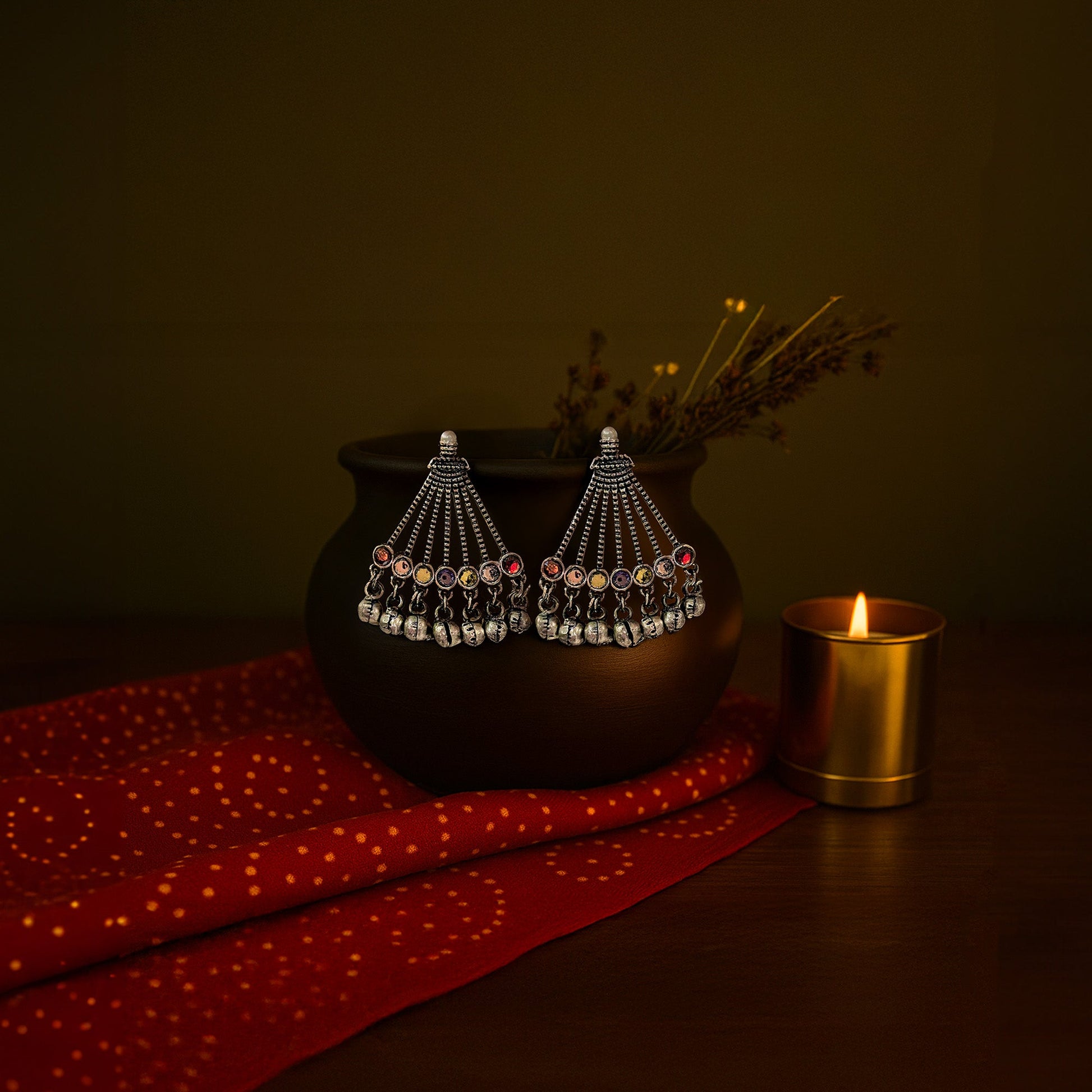 Kalakrith Milano Women Oxidized silver fan-shaped earrings featuring cascading chains, multicolored stone accents, and ghungroo-style danglers. The playful yet traditional design brings a vibrant touch to your accessory collection. Perfect to style with festive wear or to add flair to everyday ethnic looks.