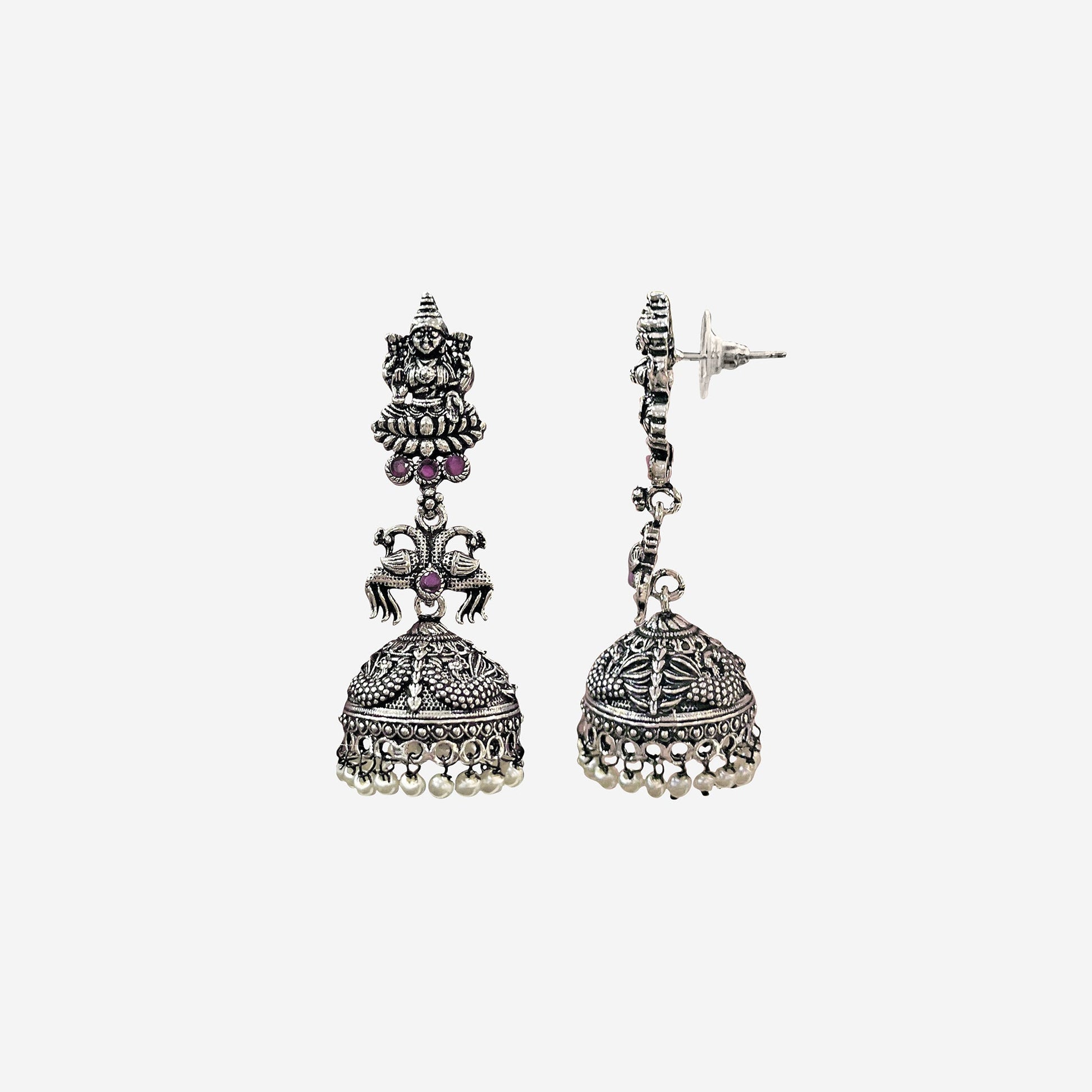 This oxidised jhumka earring from Kalakrith Milano showcases a traditional temple-inspired design with intricate deity and peacock motifs. Accented with small deep pink stones and delicate dangling beads at the base, it combines cultural symbolism with ornate craftsmanship. Best paired with festive or ethnic wear like silk sarees or lehengas.