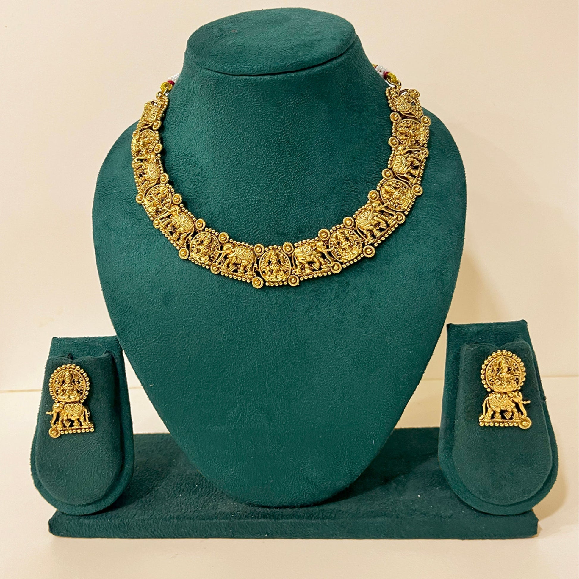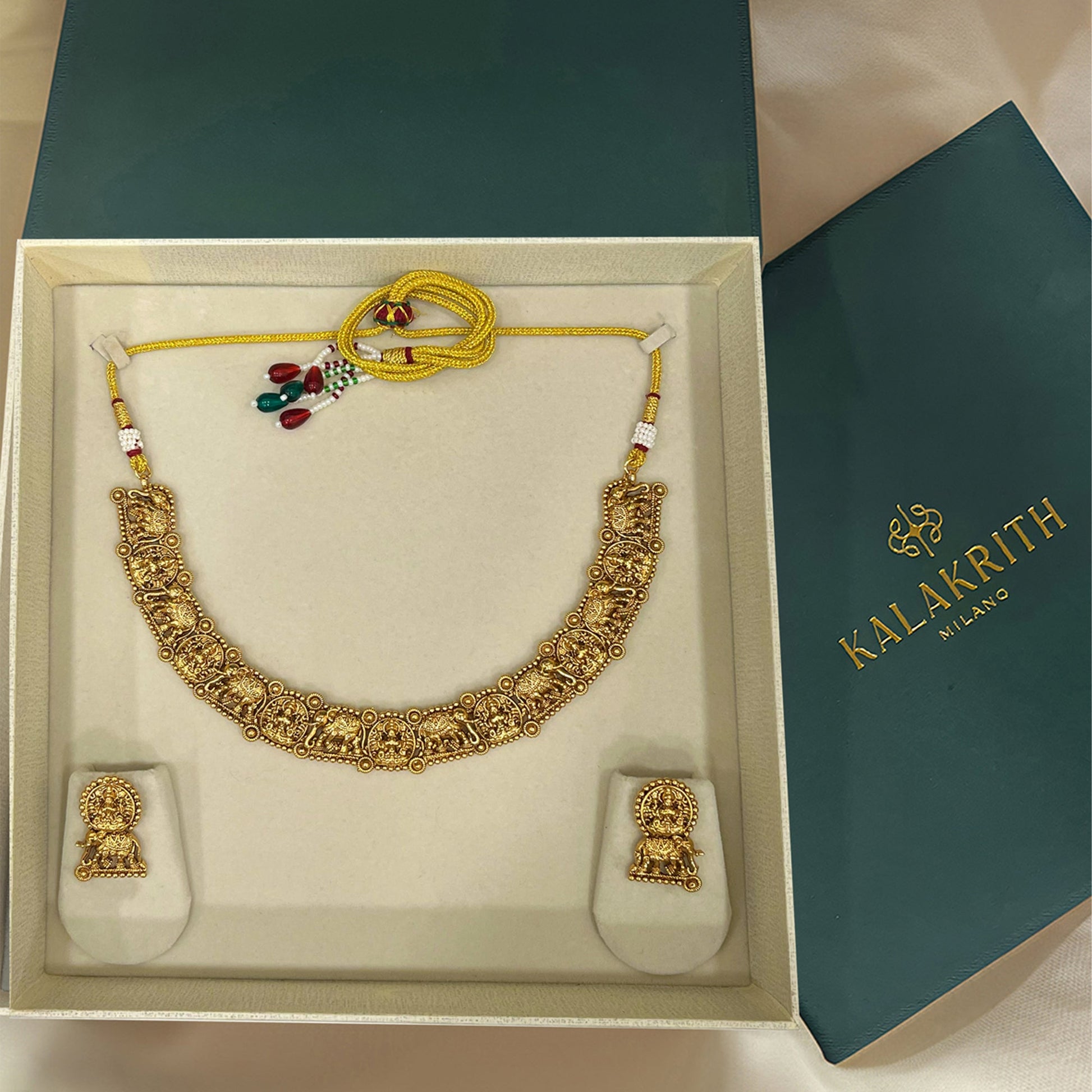 Kalakrith Milano Women Gajalakshmi gold temple necklace set showcases alternating elephant and Lakshmi motifs, symbolizing prosperity and strength. Paired with stud earrings, it weaves mythology into exquisite craftsmanship.