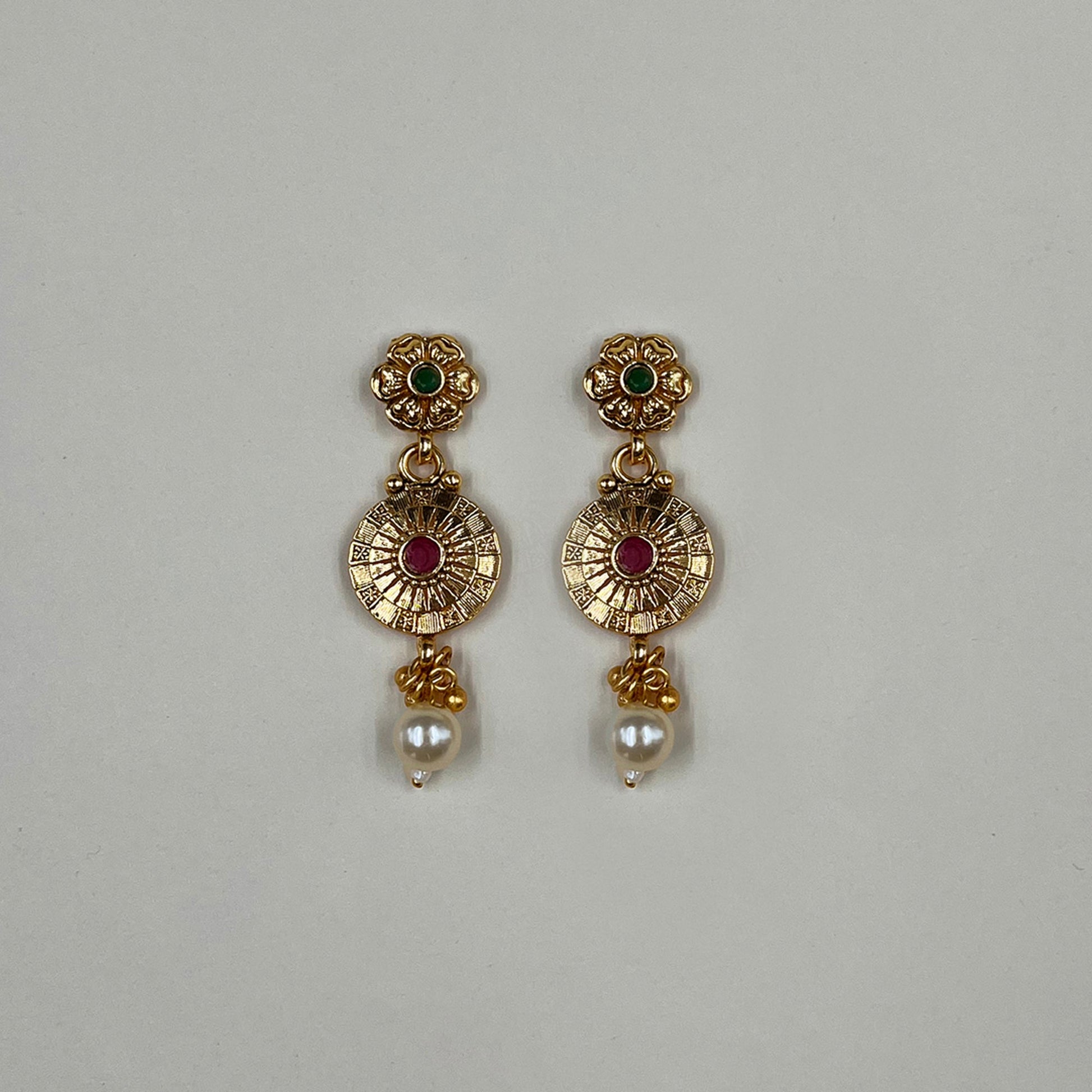 Kalakrith Milano Women antique necklace set features intricate hexagonal gold motifs adorned with red and green gemstones, complemented by a pearl drop, offering a luxurious blend of heritage charm and contemporary elegance.
