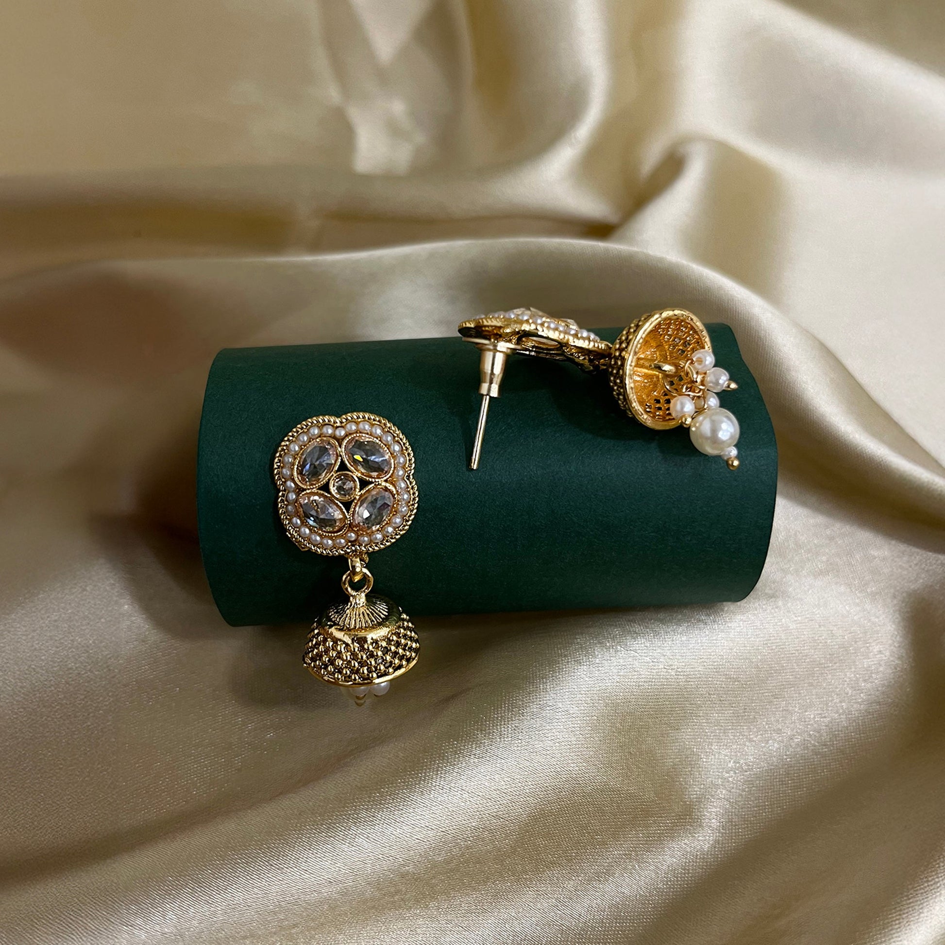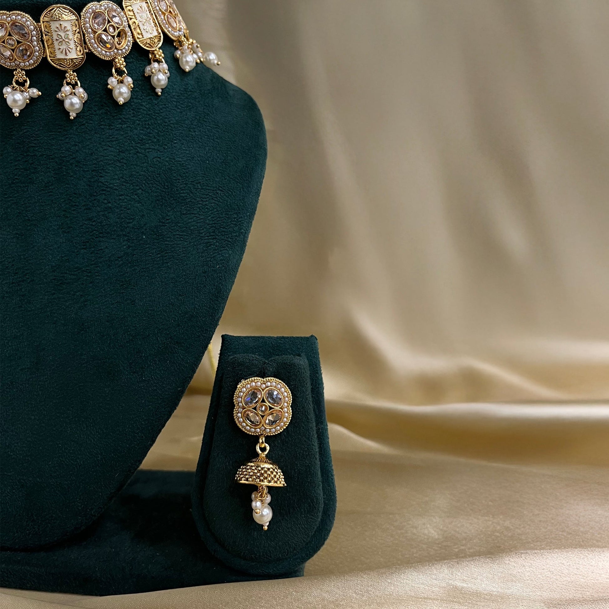 Kalakrith Milano Women antique necklace set showcases intricate enamel work and pearl-encrusted details, adorned with delicate pearl drops and paired with tiny jhumka earrings for a timeless, regal allure.