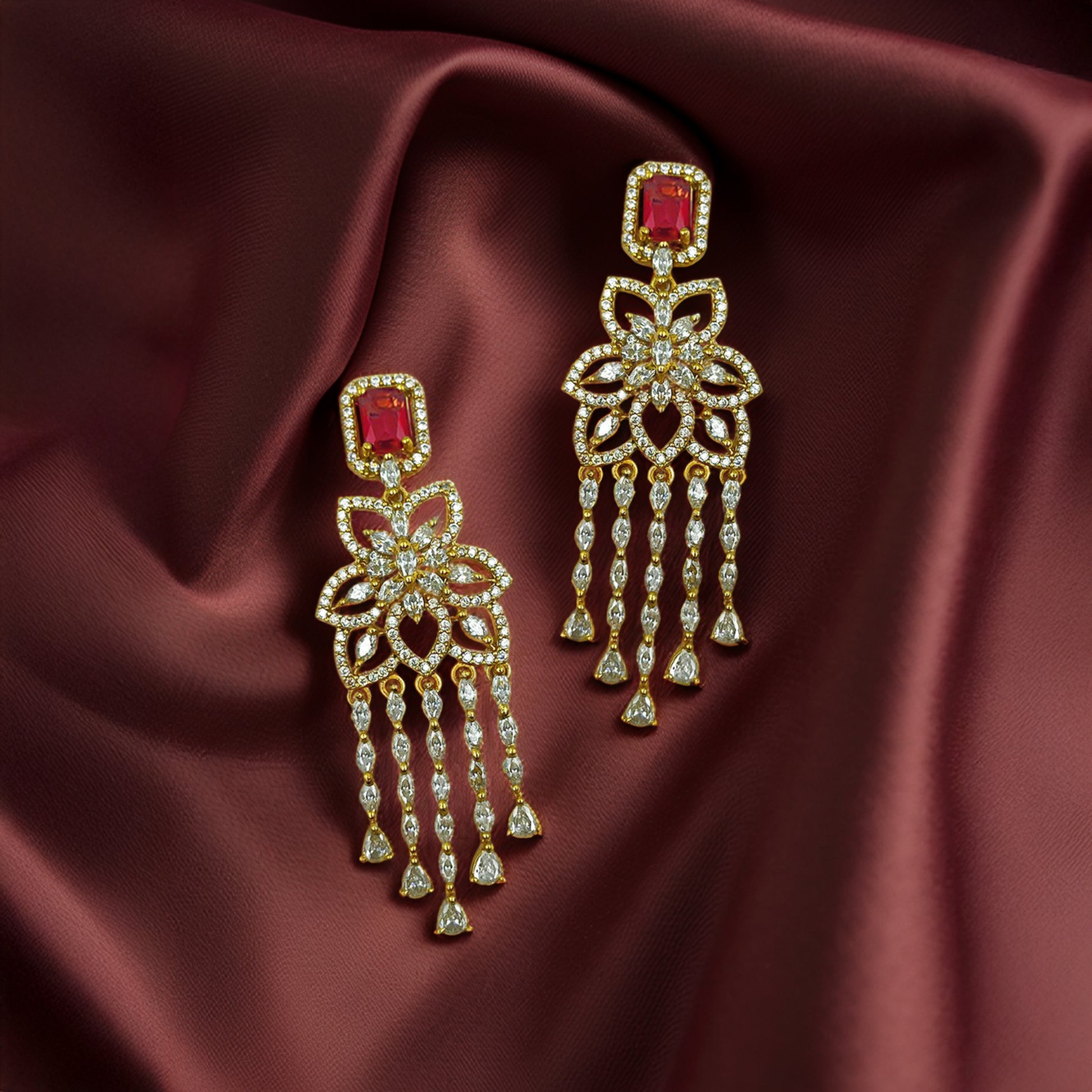 Kalakrith Milano Women Gold-toned AD Studded Coral Flower Danglers are elegant zirconia danglers feature a vibrant coral stone with an intricate flower motif, creating a delicate yet stunning statement piece