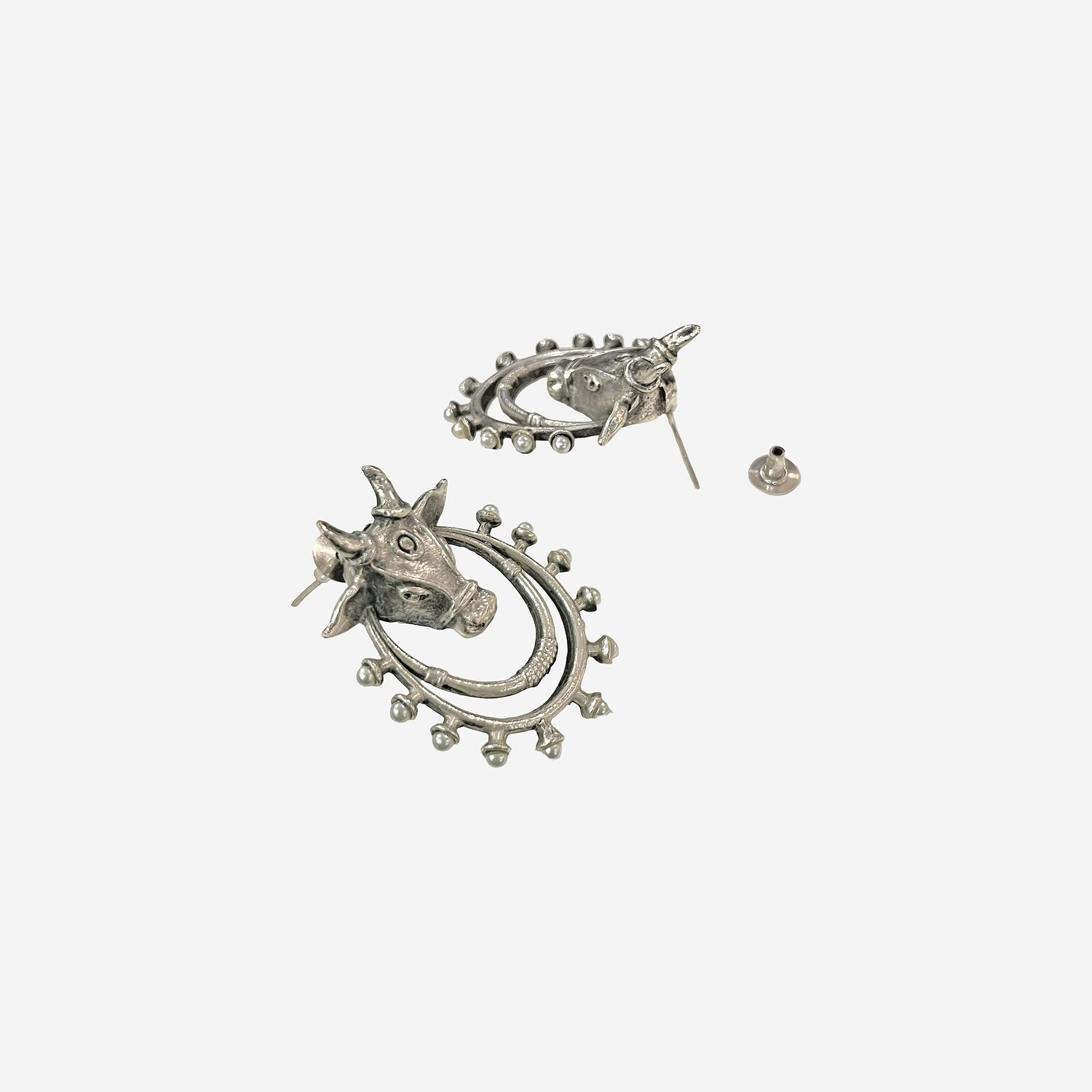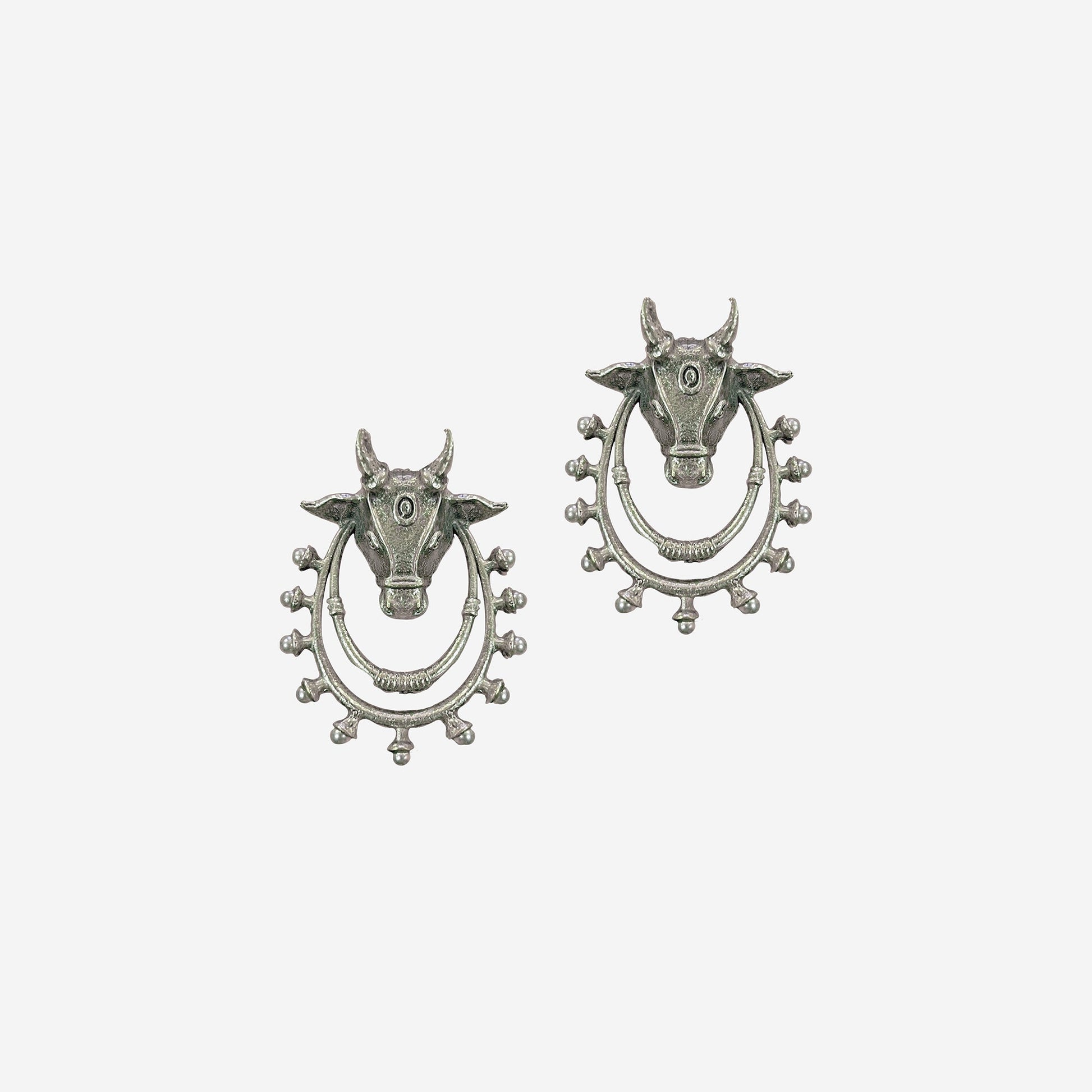 Kalakrith Milano Women striking stud features a Nandi (bull head) motif crafted in oxidised metal, symbolizing strength and divinity in Indian tradition. Its bold, antique finish with intricate detailing and delicate danglers creates a rustic look — perfect for adding a statement touch to both ethnic and fusion ensembles.