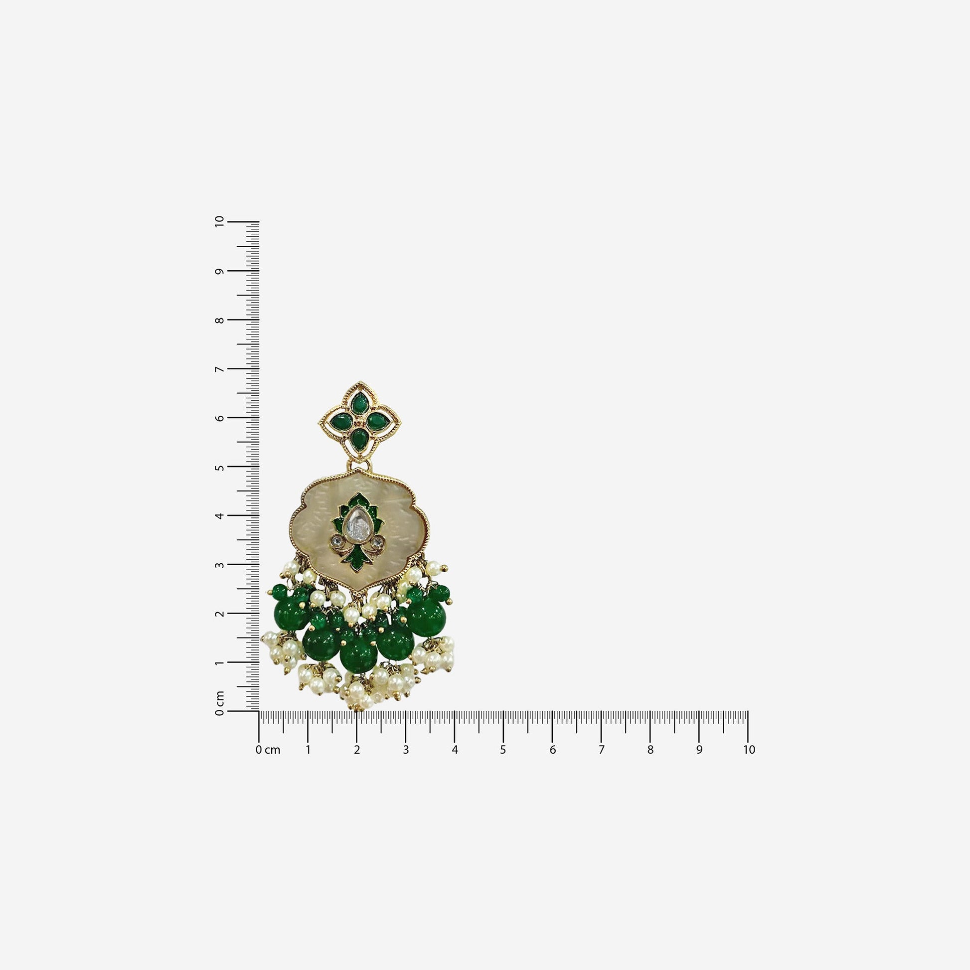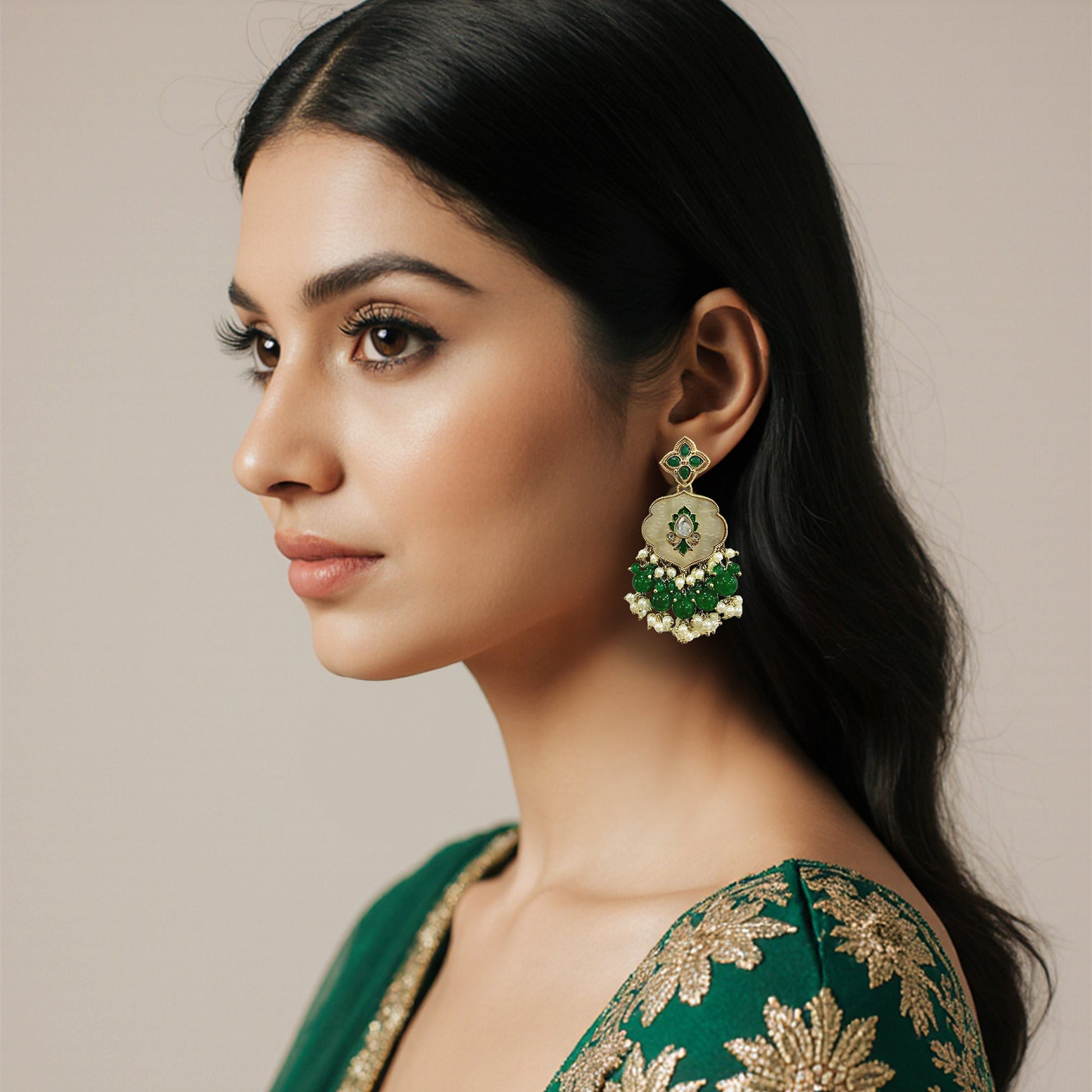 Kalakrith Milano Women traditional small chandelier earrings feature emerald and pearl drops, centered around a jharokha-inspired motif adorned with a kundan centerpiece. Rich in heritage charm, they add a graceful and regal touch to ethnic ensembles.