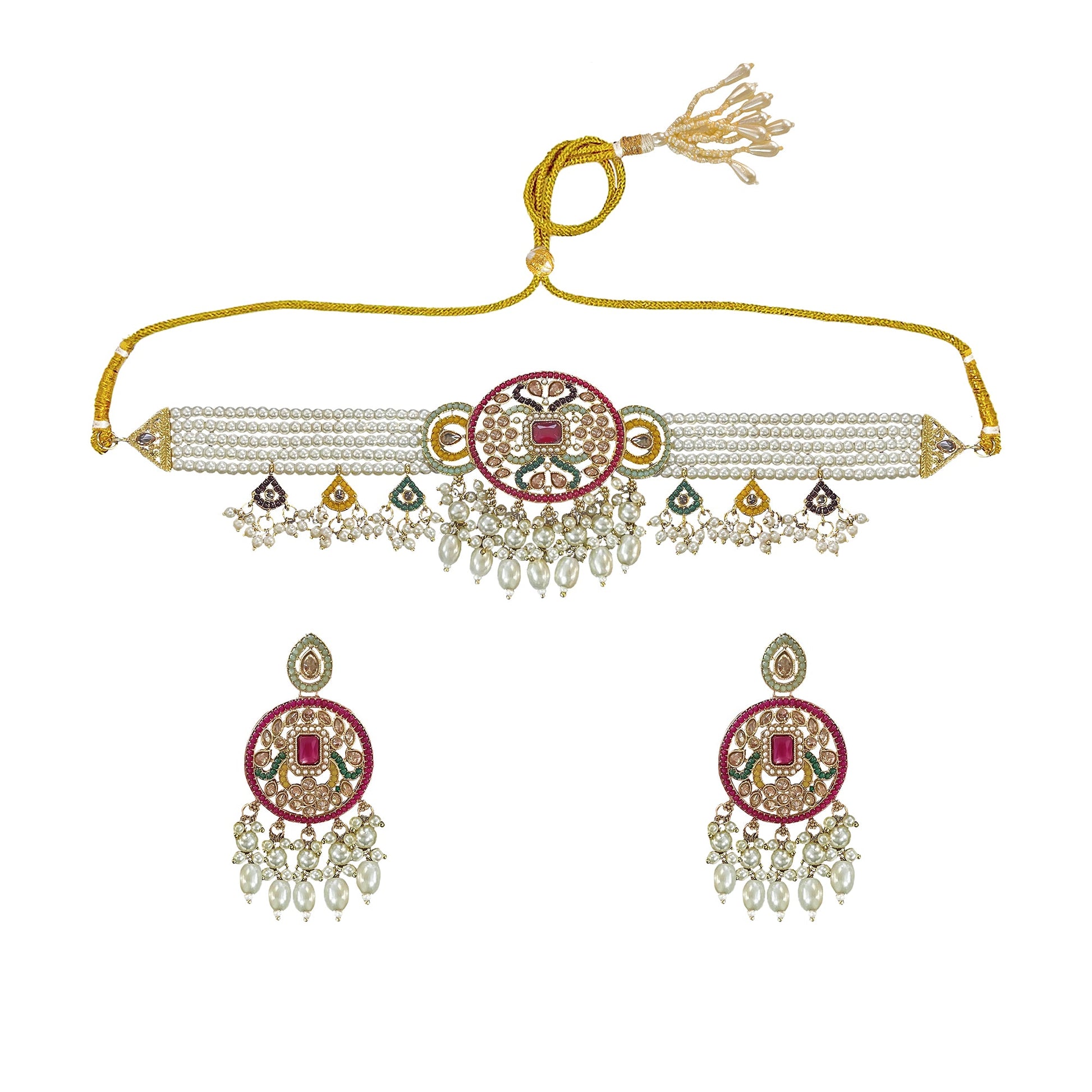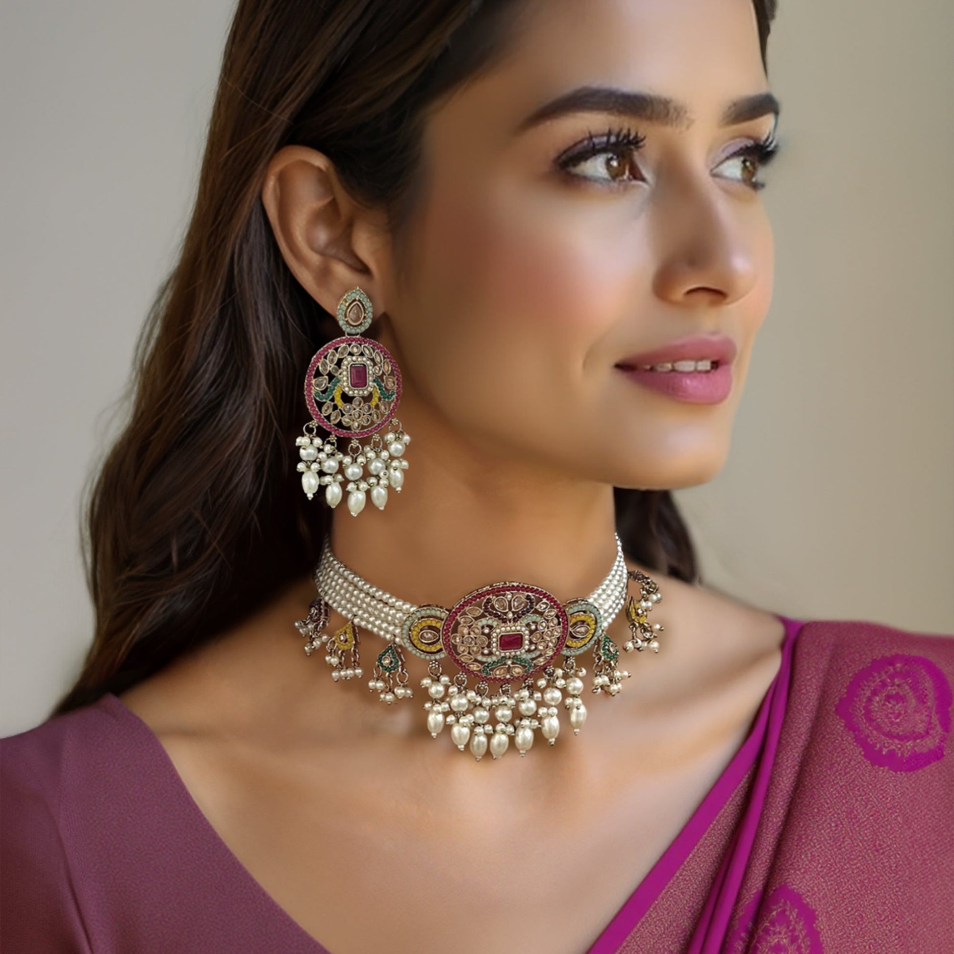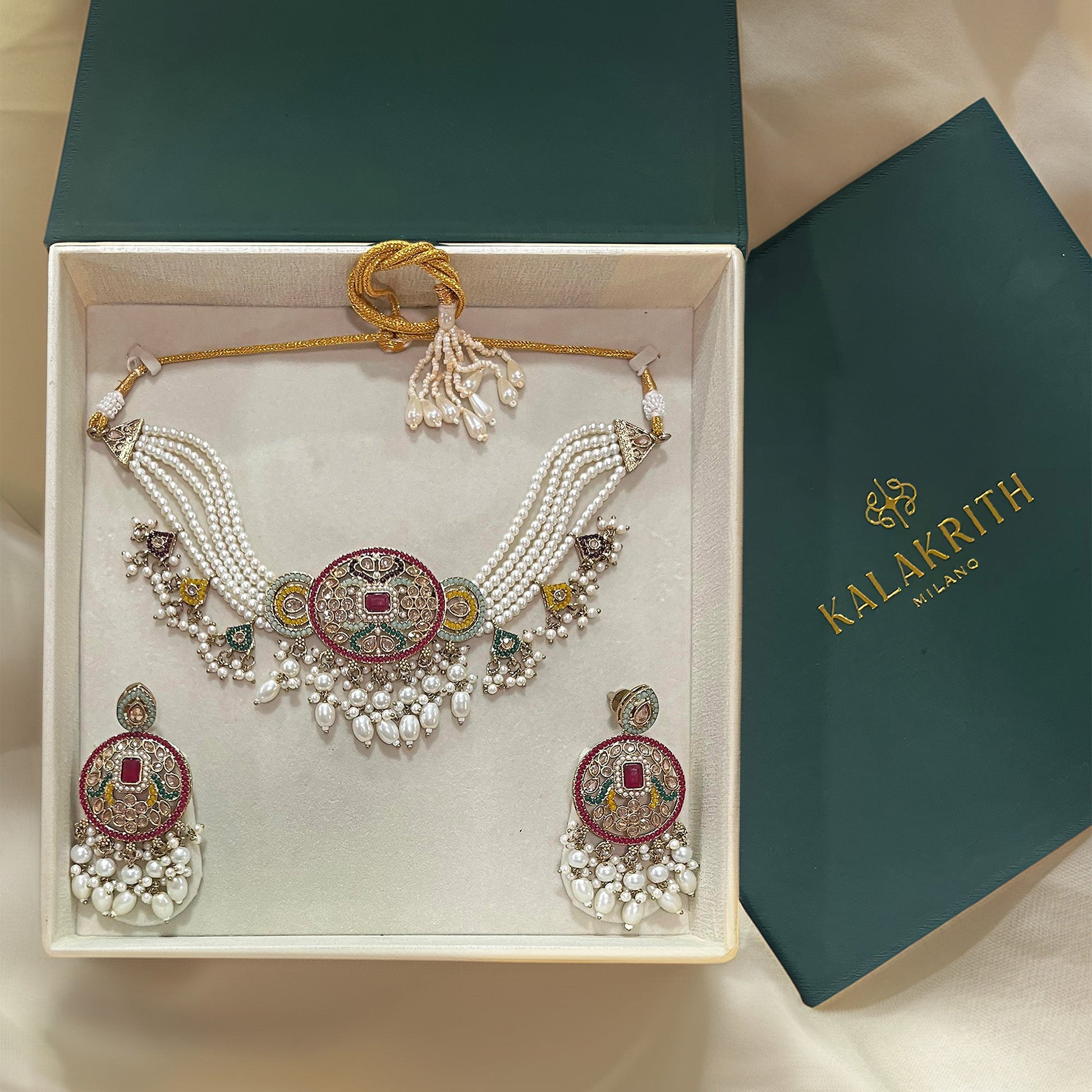 Kalakrith Milano Women pearl choker, adorned with multi-color beads and tiny beaded charm drops, captures the regal opulence of the Mughal era, paired with large, multi-beaded earrings for a bold yet timeless look.