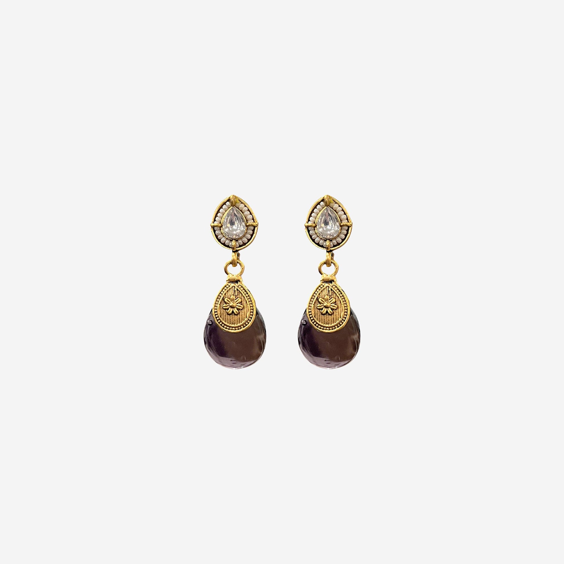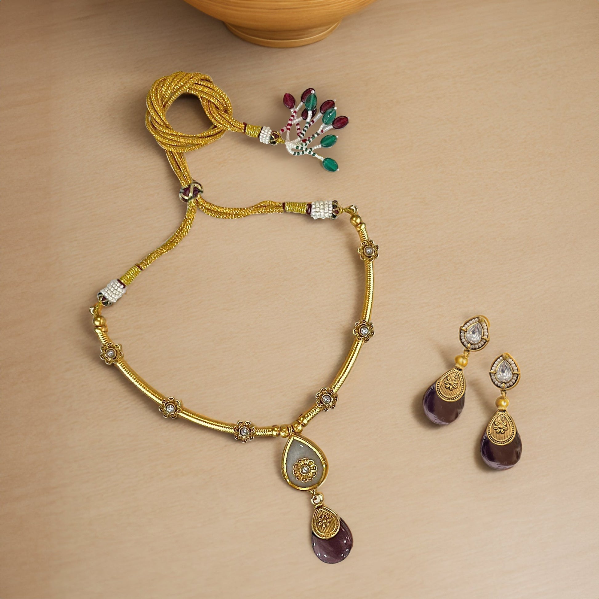 Kalakrith Milano Women antique necklace set features vintage style look adorned with Purple Drop gemstones, complemented by a pearl drop, offering a luxurious blend of heritage charm and contemporary elegance.