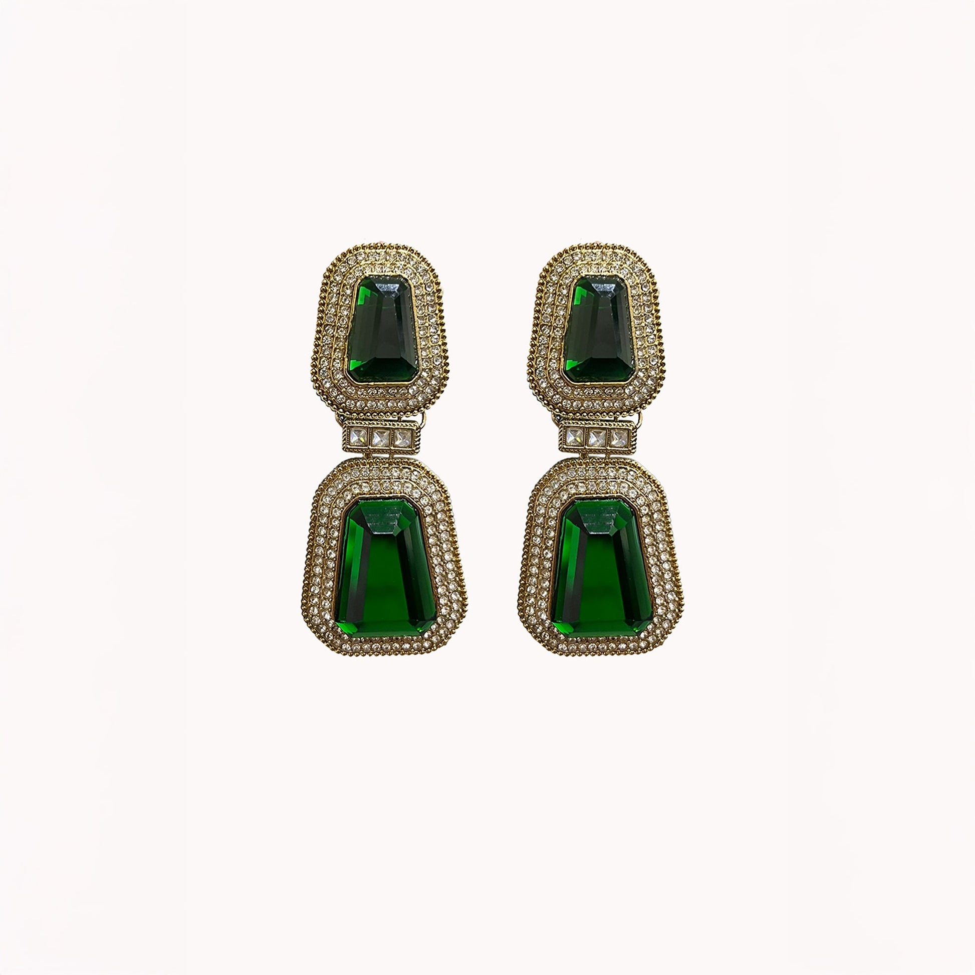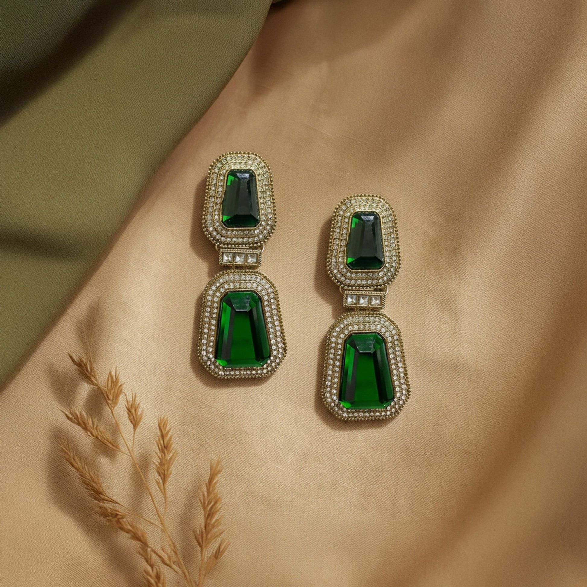 Kalakrith Milano Women a bold statement earring showcasing oversized emerald-green stones framed with shimmering CZ for a modern luxe appeal. Its geometric silhouette and elegant sparkle make it perfect to wear solo as a showstopper, effortlessly pairing with both festive and Indo-Western looks.