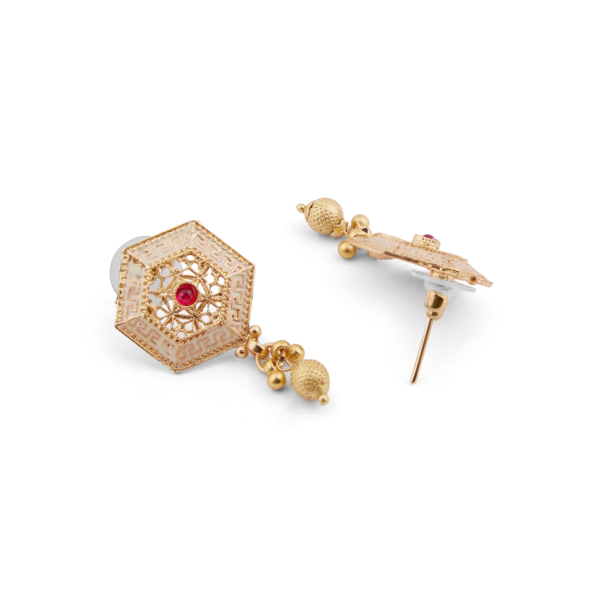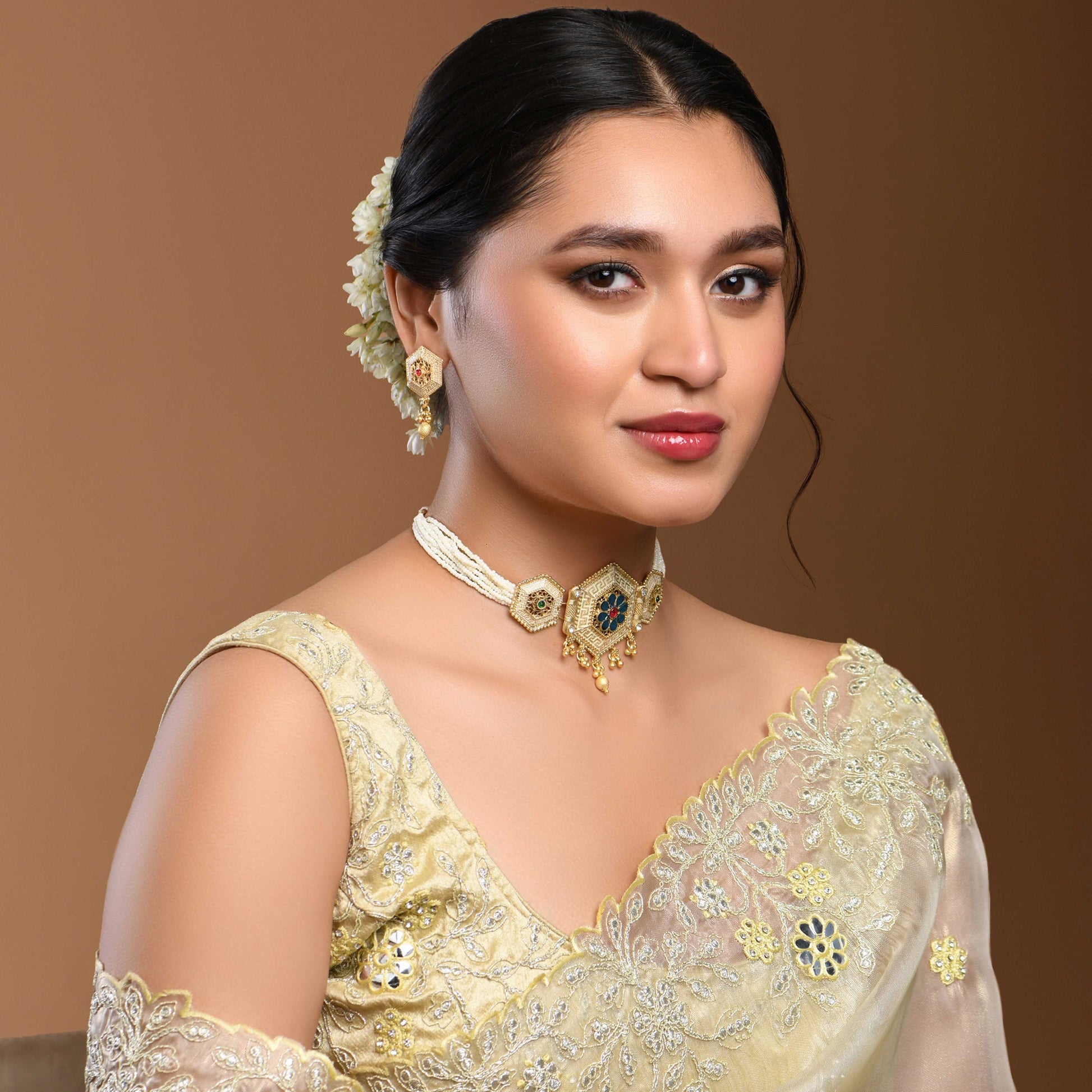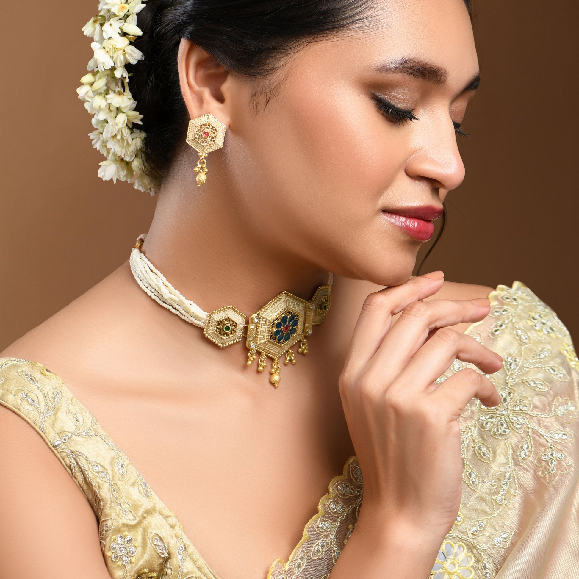 Kalakrith Milano enameled Pearl Choker Set features a stunning beaded enamel choker, adding a touch of sophistication to any outfit. The matching earrings perfectly complement the choker, creating a cohesive and stylish look.