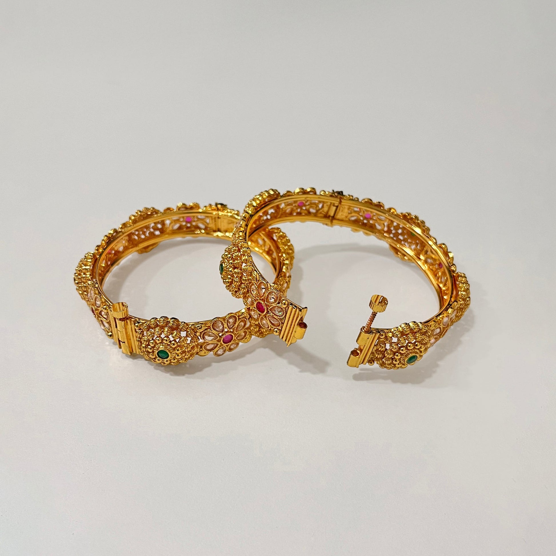 Kalakrith Milano Women a gold-tone floral motif bangle adorned with green and ruby stones, accented by shimmering CZ for a timeless appeal. Lightweight and elegant, it comes with a secure screw closure for easy wear—perfect to style solo or pair with festive ensembles for a regal touch.