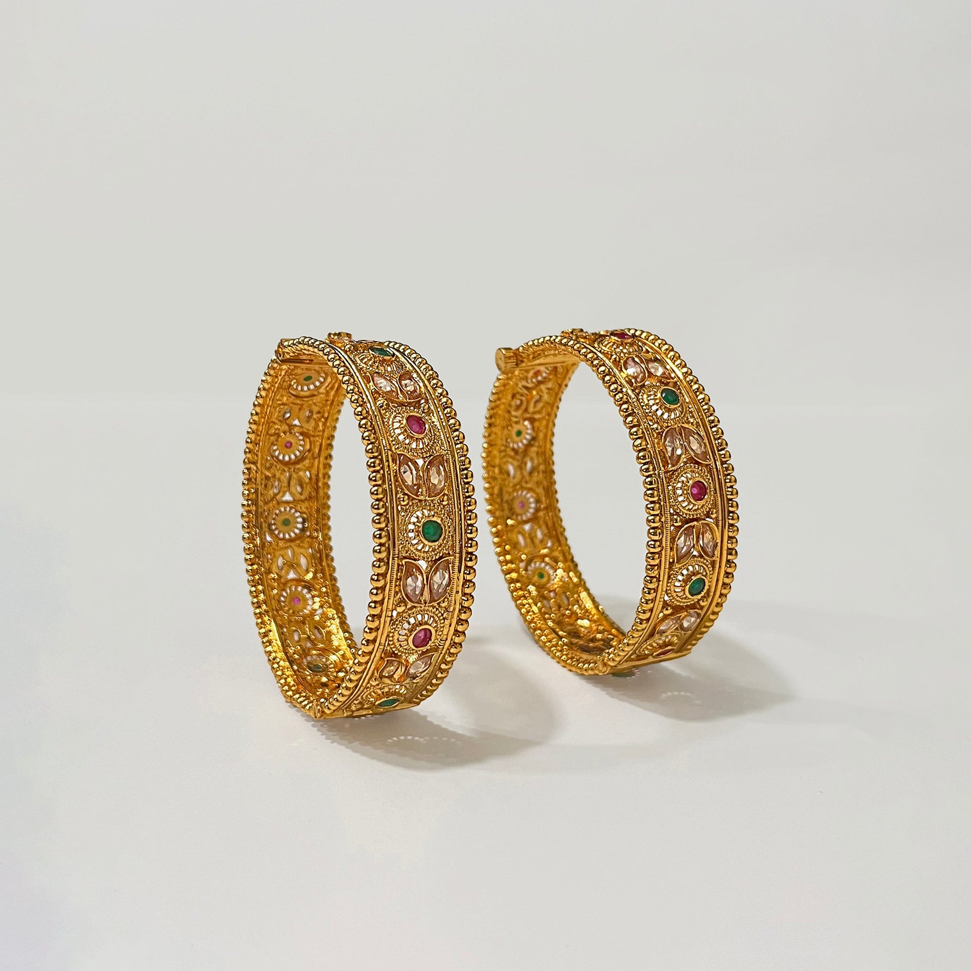 Kalakrith Milano Women a broad gold-tone bangle featuring intricate petal motifs, accented with ruby and emerald stones framed by shimmering CZ. Designed with a secure screw closure for comfort, it blends traditional charm with regal elegance—perfect for festive and wedding looks.
