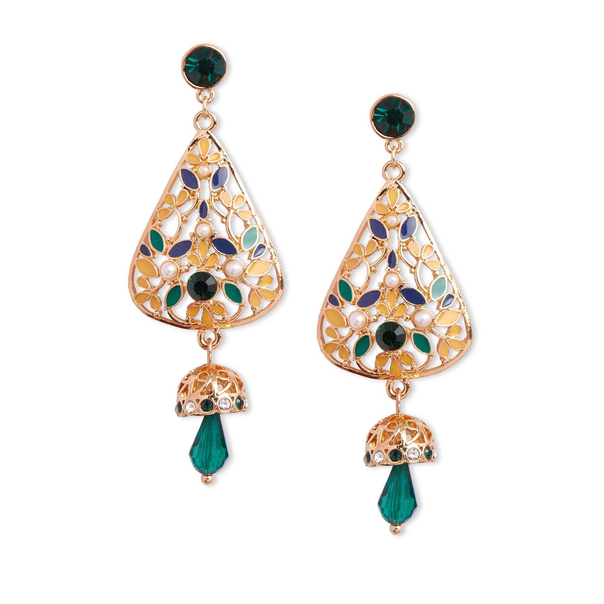 Look your ethnic best with the enameled trend. Embellished with delicate faux pearls placed artistically over gold tone tear drop shape gives unique identity to your modern Indian look.