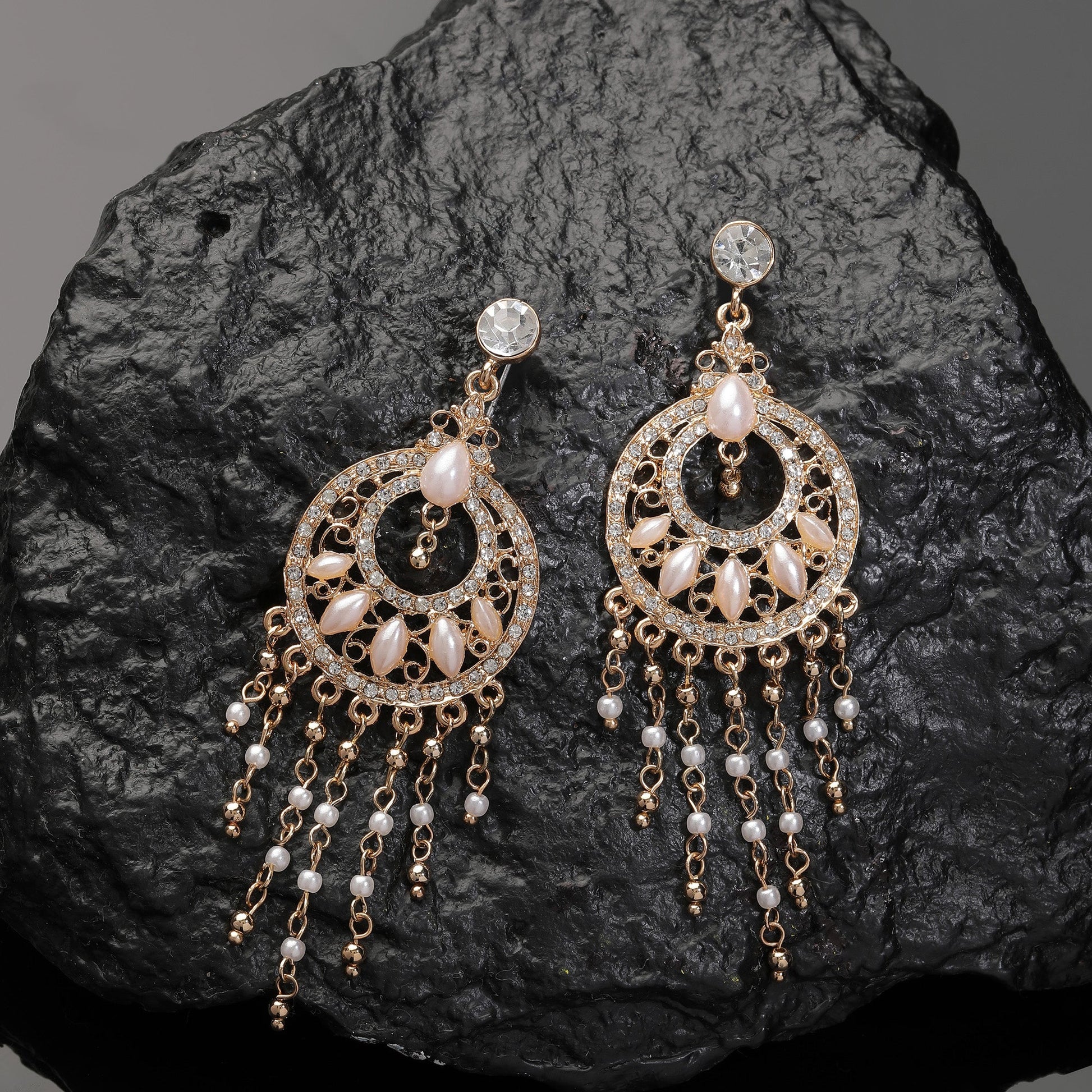 Meet all new chandbalis with modern twist. The perfectly sized drops strung on gold tone metal lend a polished and playful feel.
