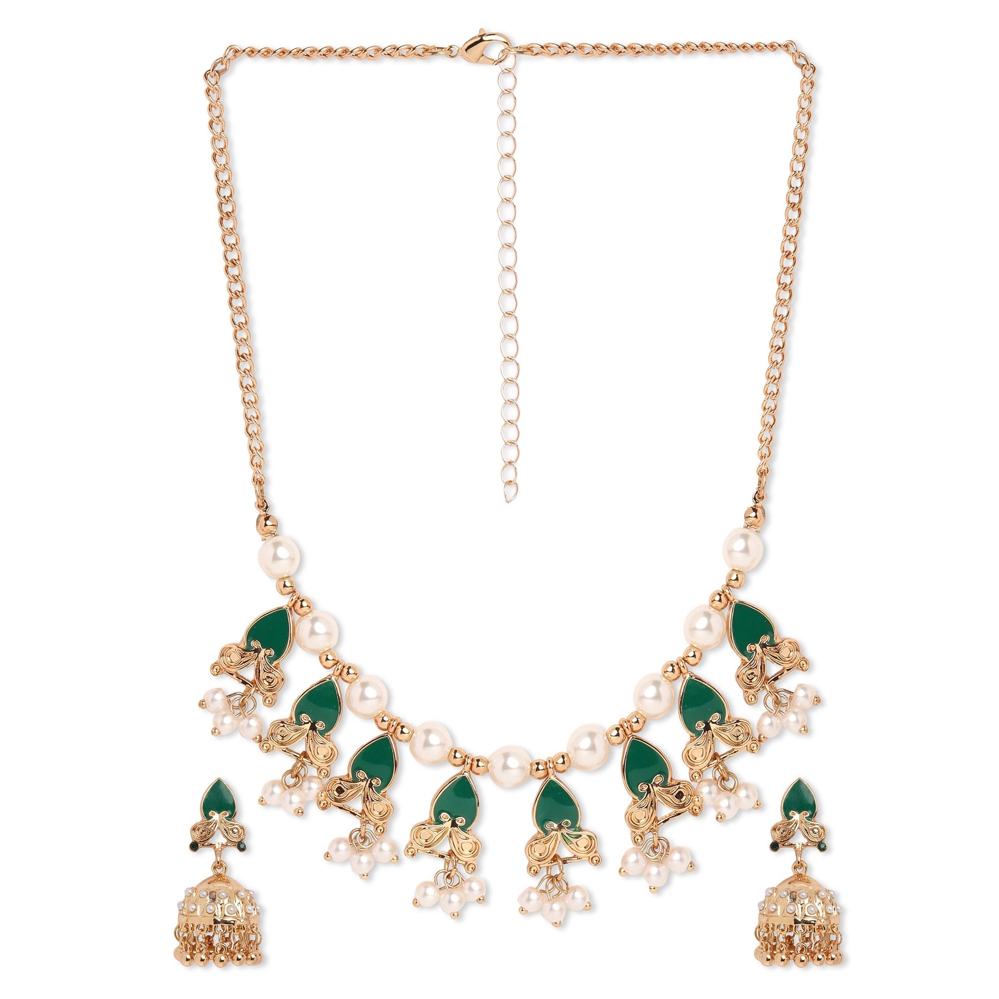 Make a statement with this exquisite jewellery set. Embellished with faux pearls, emerald tone stones and crafted to complement well with your festive look making this matching set a real stunner.