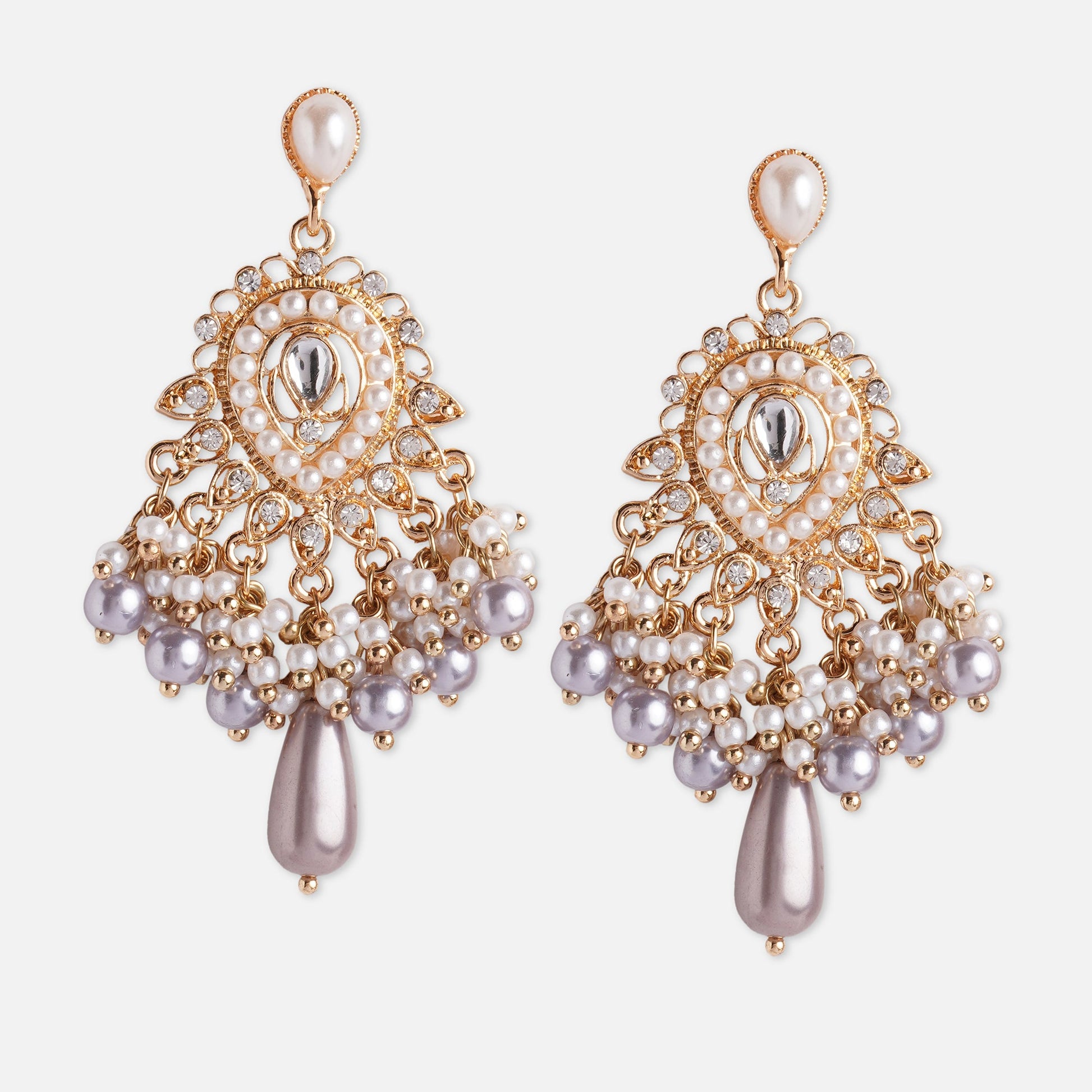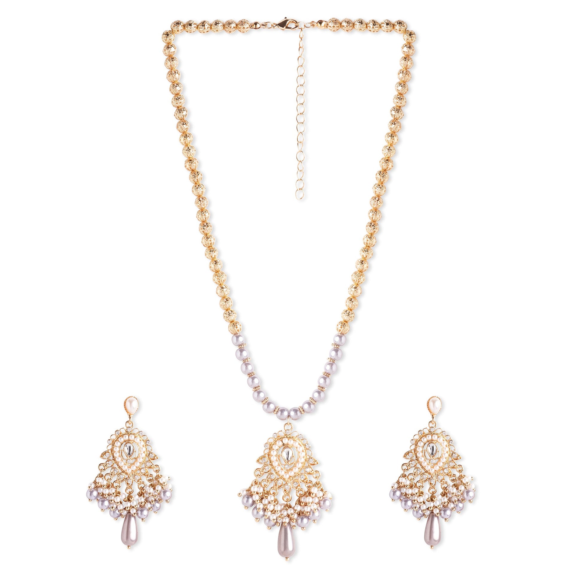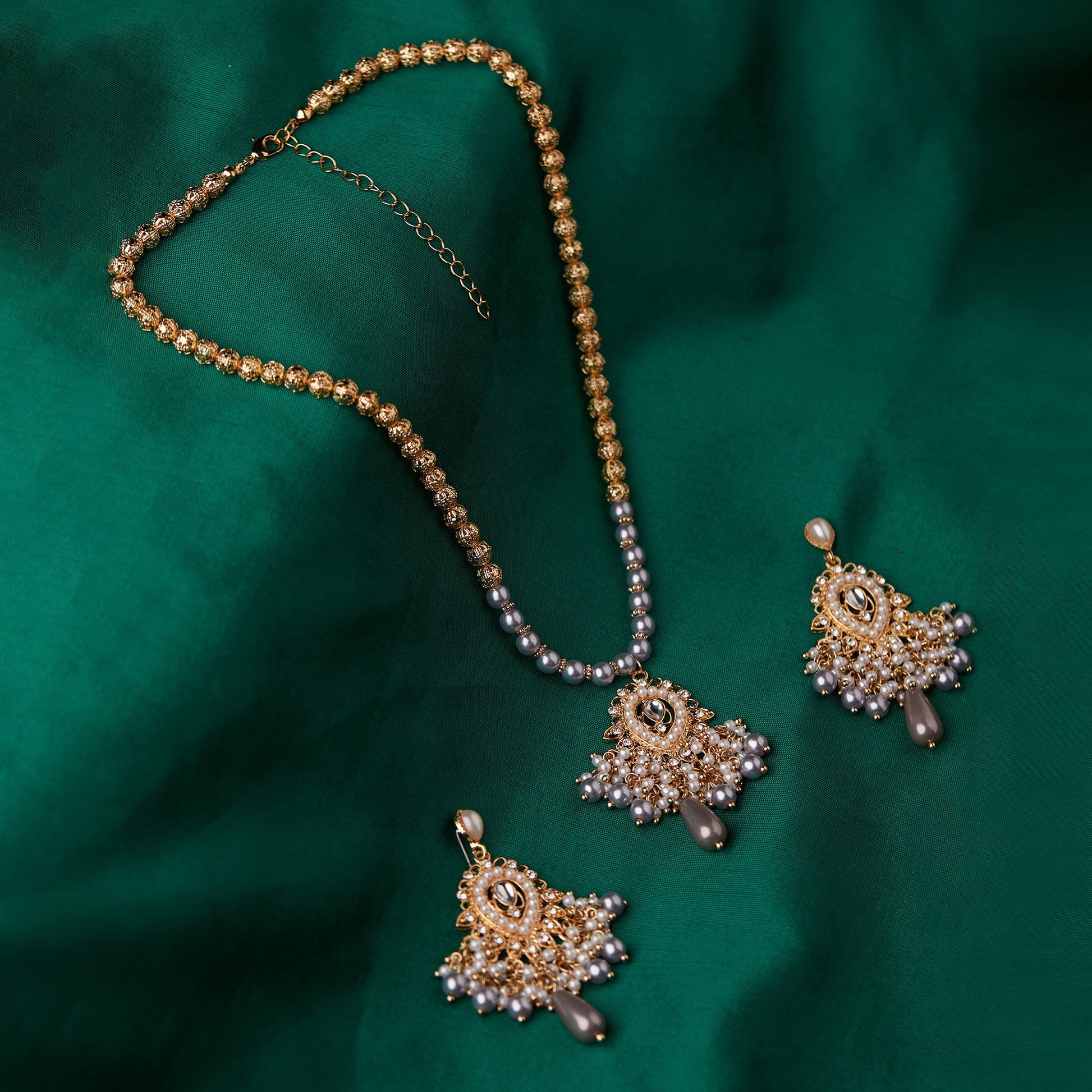 Bring out the best ethnic look with these light weight pearl jewelry set. Perfectly sized grey pearl drops strung on gold tone casing offers a bold statement.