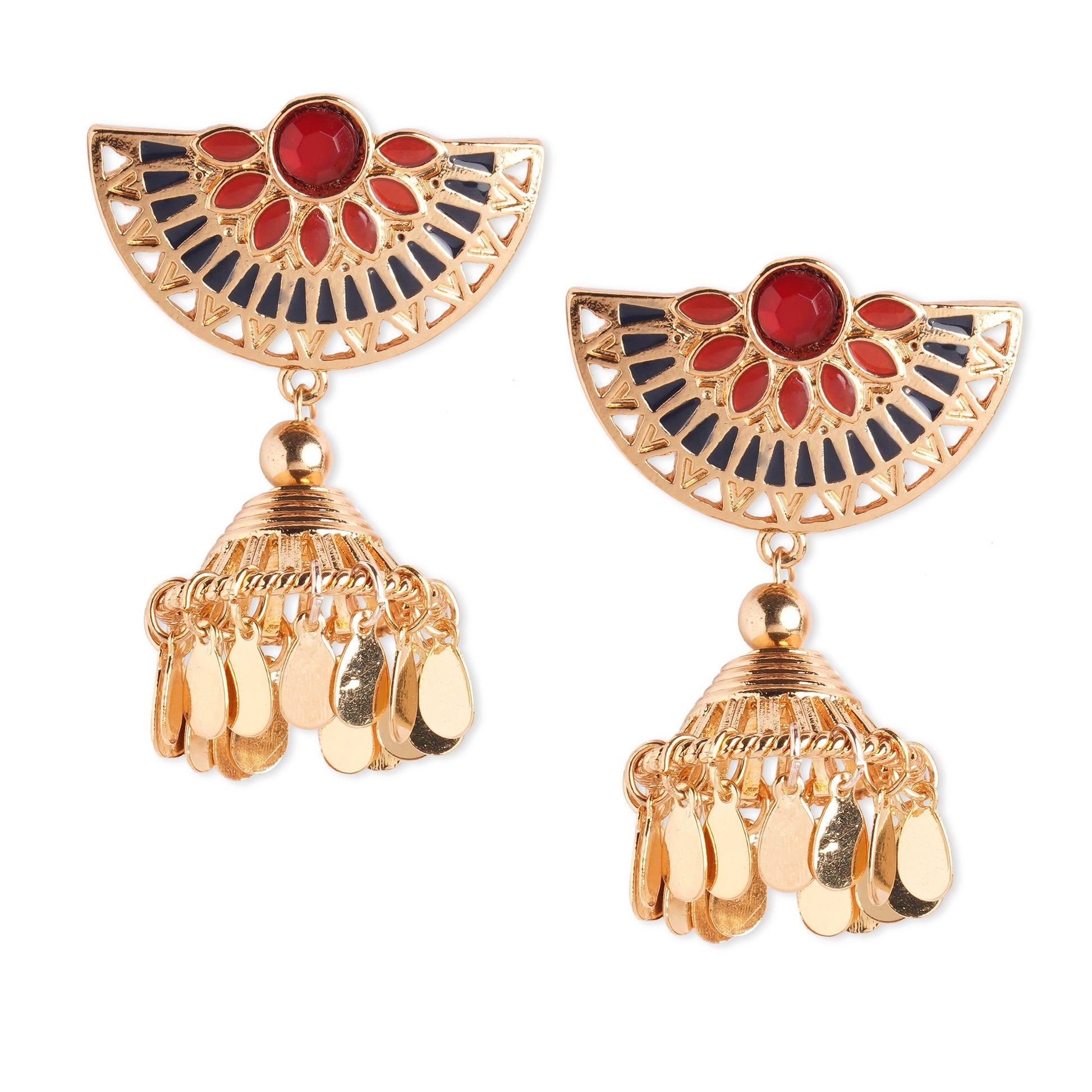 Redefine style with this pair of elegantly geometric design earrings. Make a statement with these long drop earrings in a beautiful gold tone finish and multi color geomtric enamel ceoncept