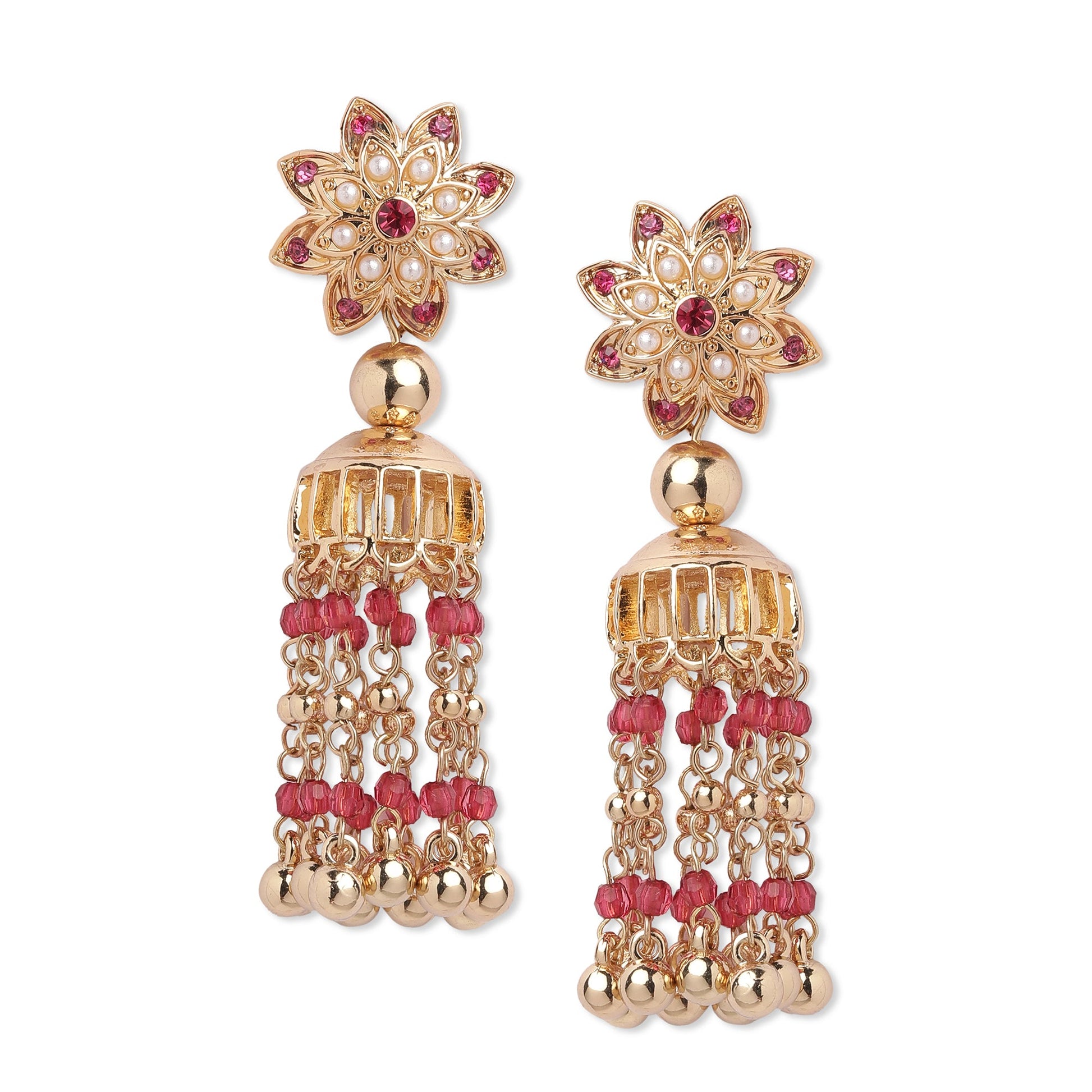 A jhumka that looks like a celebration in itself. This chandelier style earring has pop colour beads swinging from gold tone chain. A statement making piece like this one adds a unique and fashionable character to occasion wear.