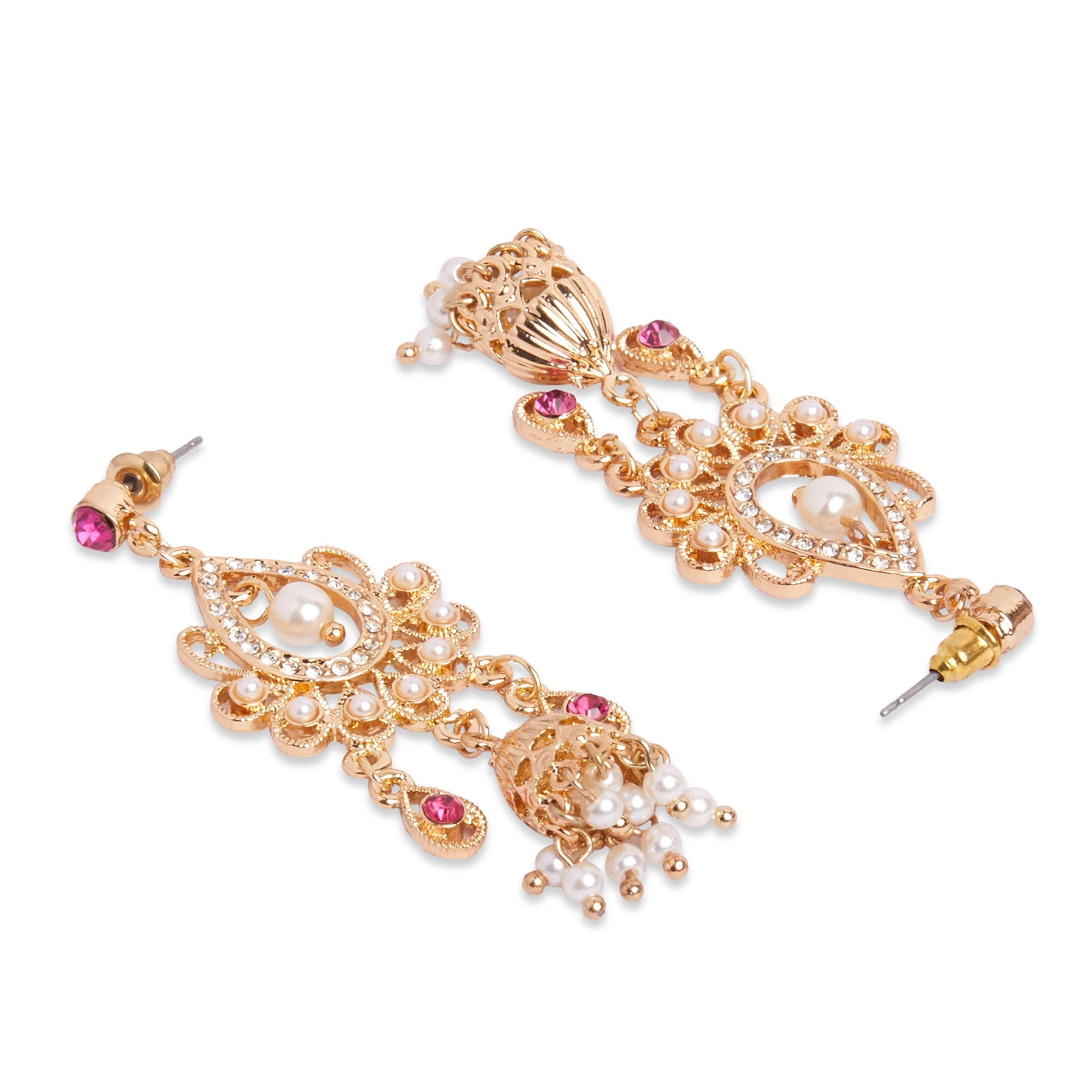 Go bold and stylish with your modern ethnic wear as you style them with this pair of jhumkas. Crafted in gold tone and faux pearls, this is pair of earrings is simply a stunner.