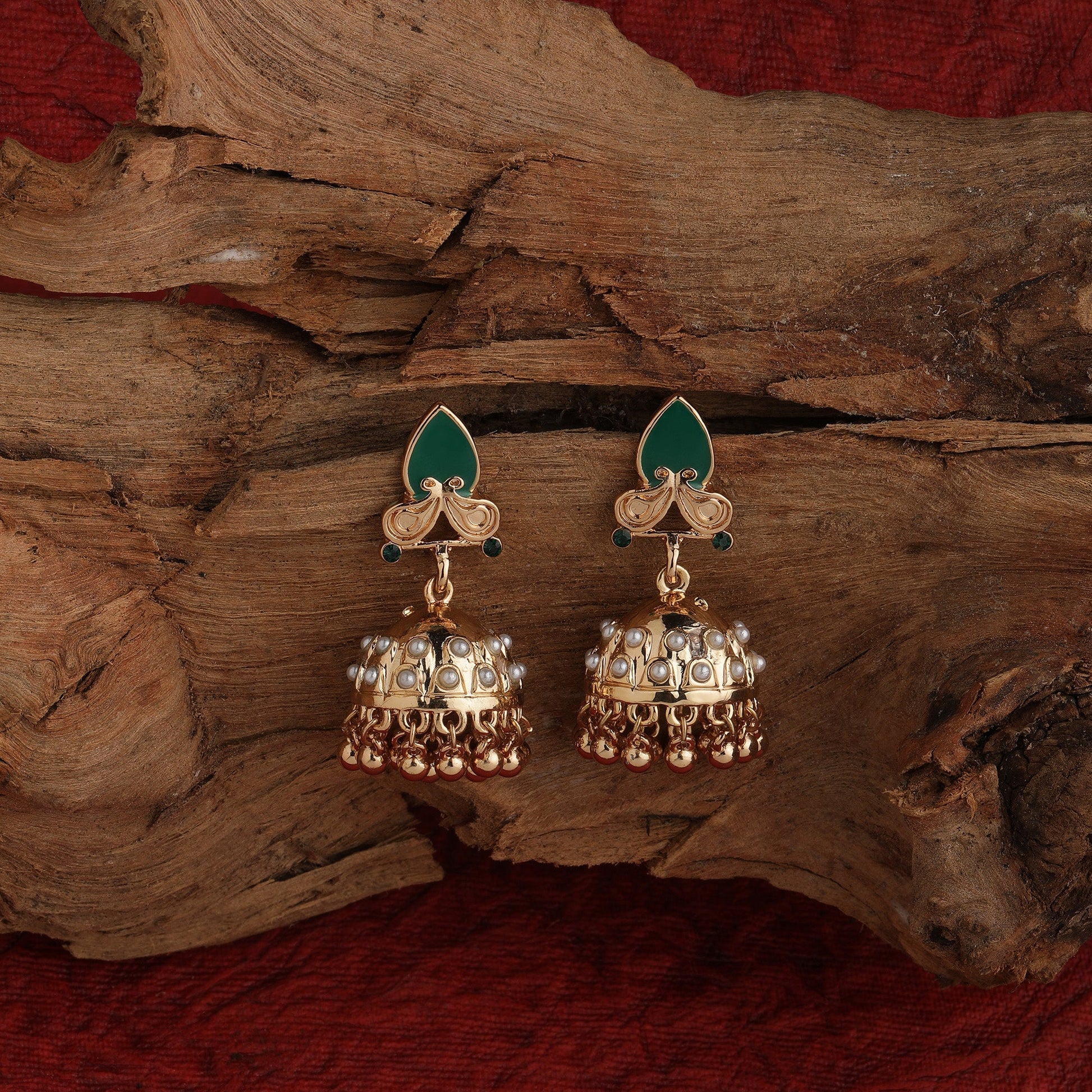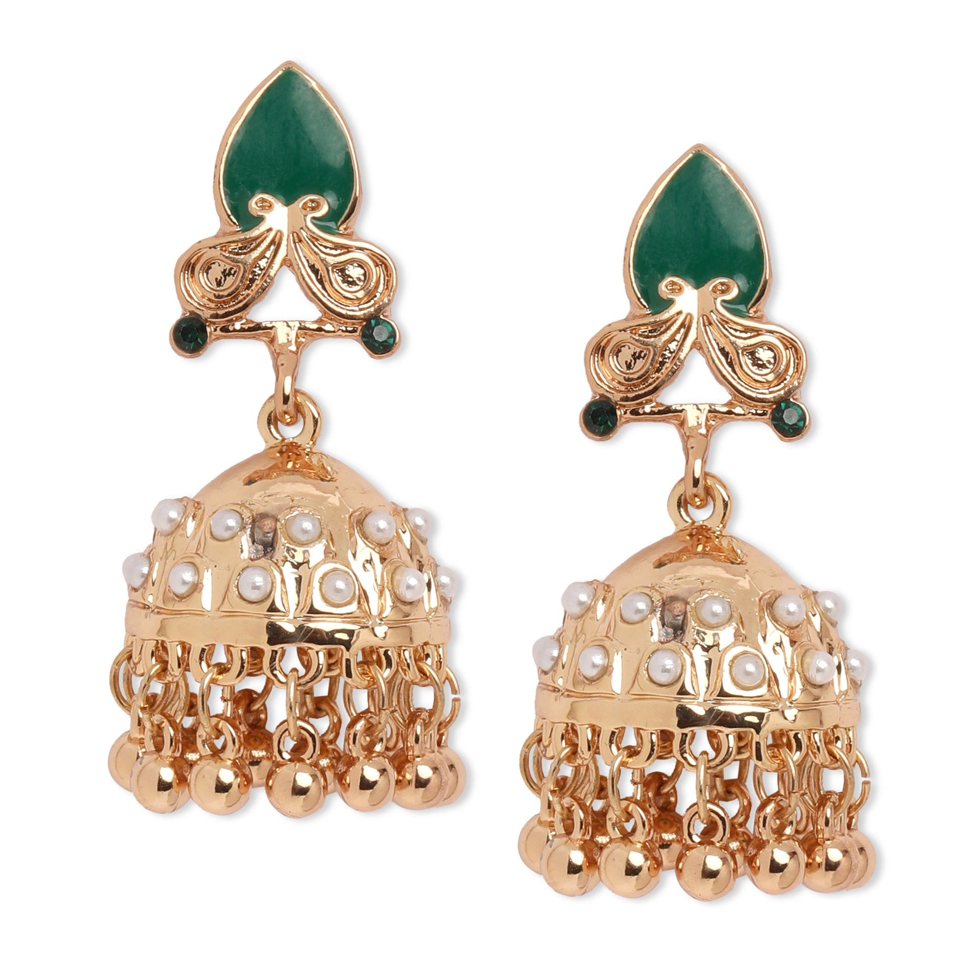 Embellished with faux pearls, emerald tone stones and crafted to complement well with your festive look making these fashion jhumkas a real stunner.