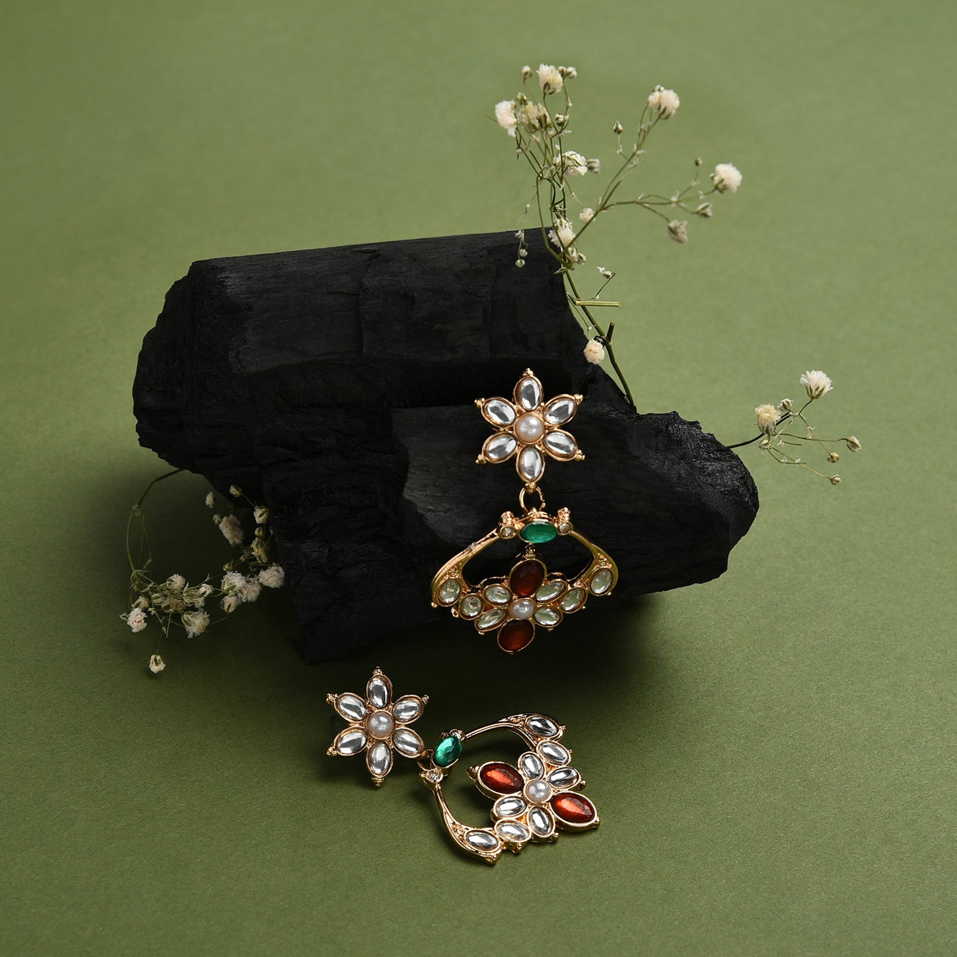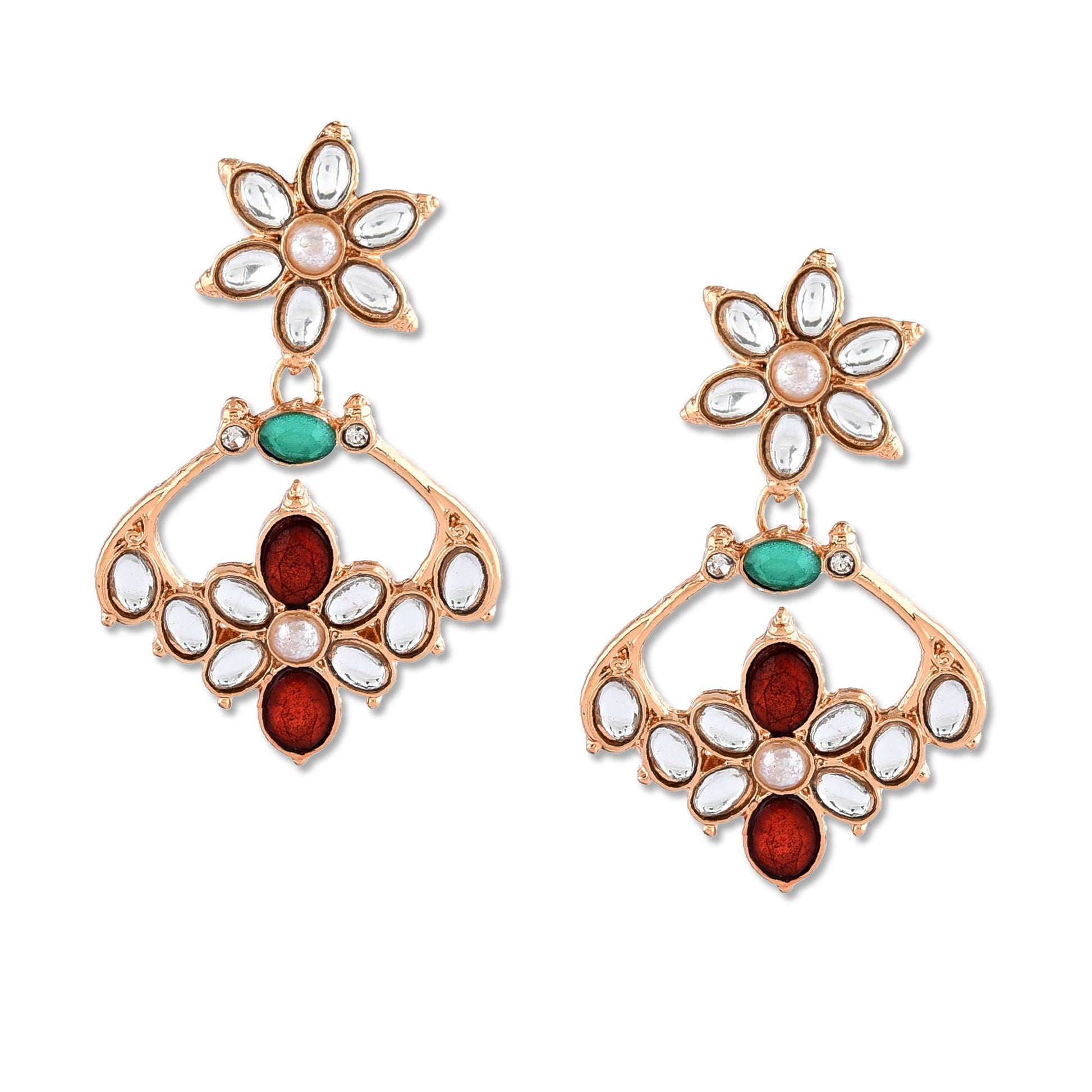 Flaunt off these bold floral earrings with diamante ruby and emerald tone stone setting offered with matching post and back.