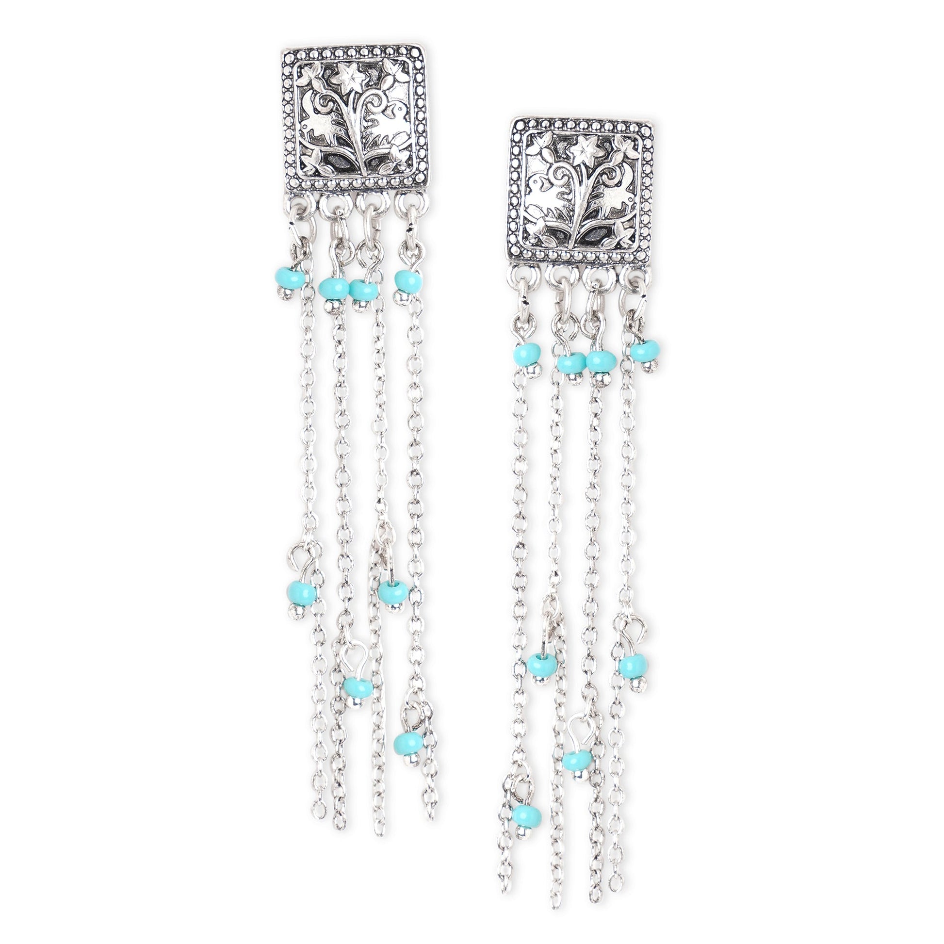 Celebrate the oxidized trend with these earrings made to go along with your chic style. An oxidised sliver finish with a pop of colorful beads makes it a real stunner.