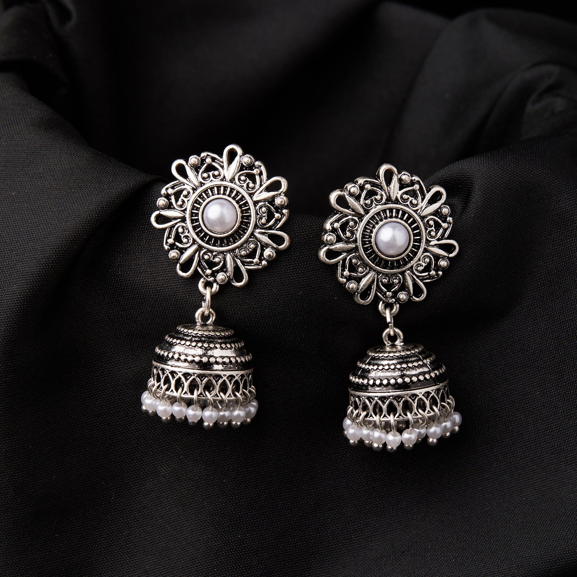 Pearl Oxidized Silver Jhumkas