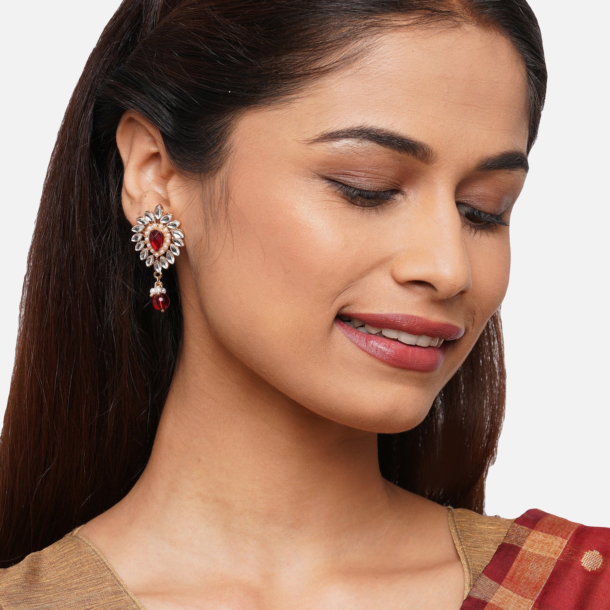 Elevate your festive game with this red kundan short drop earrings. Crafted in kundan and red stone these earrings are a perfect go to accessory for an elegant yet traditional look.