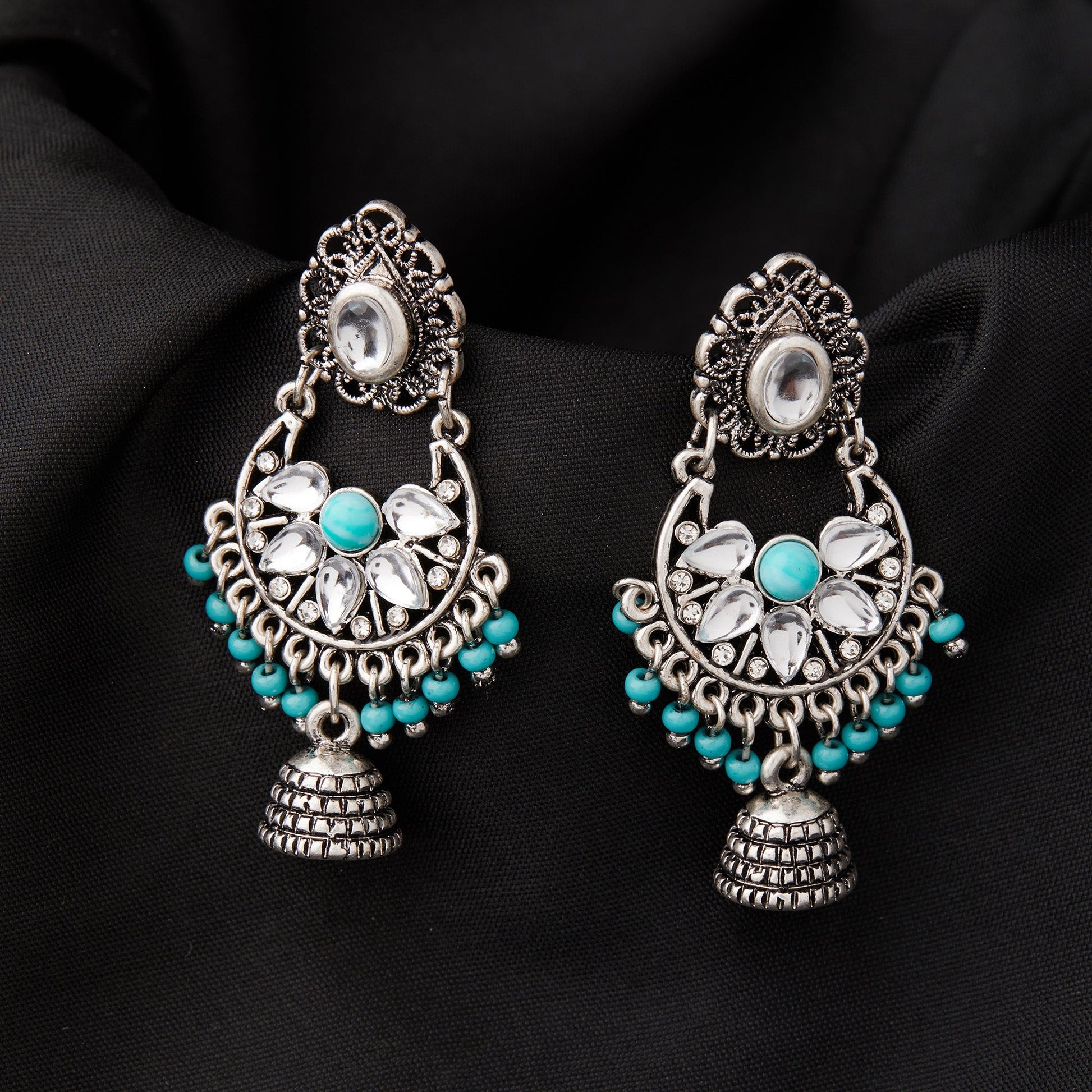 Add these perfectly crafted oxidised jhumkas to your jewellery collection designed with kundan stones and turq beads and an intricate pattern