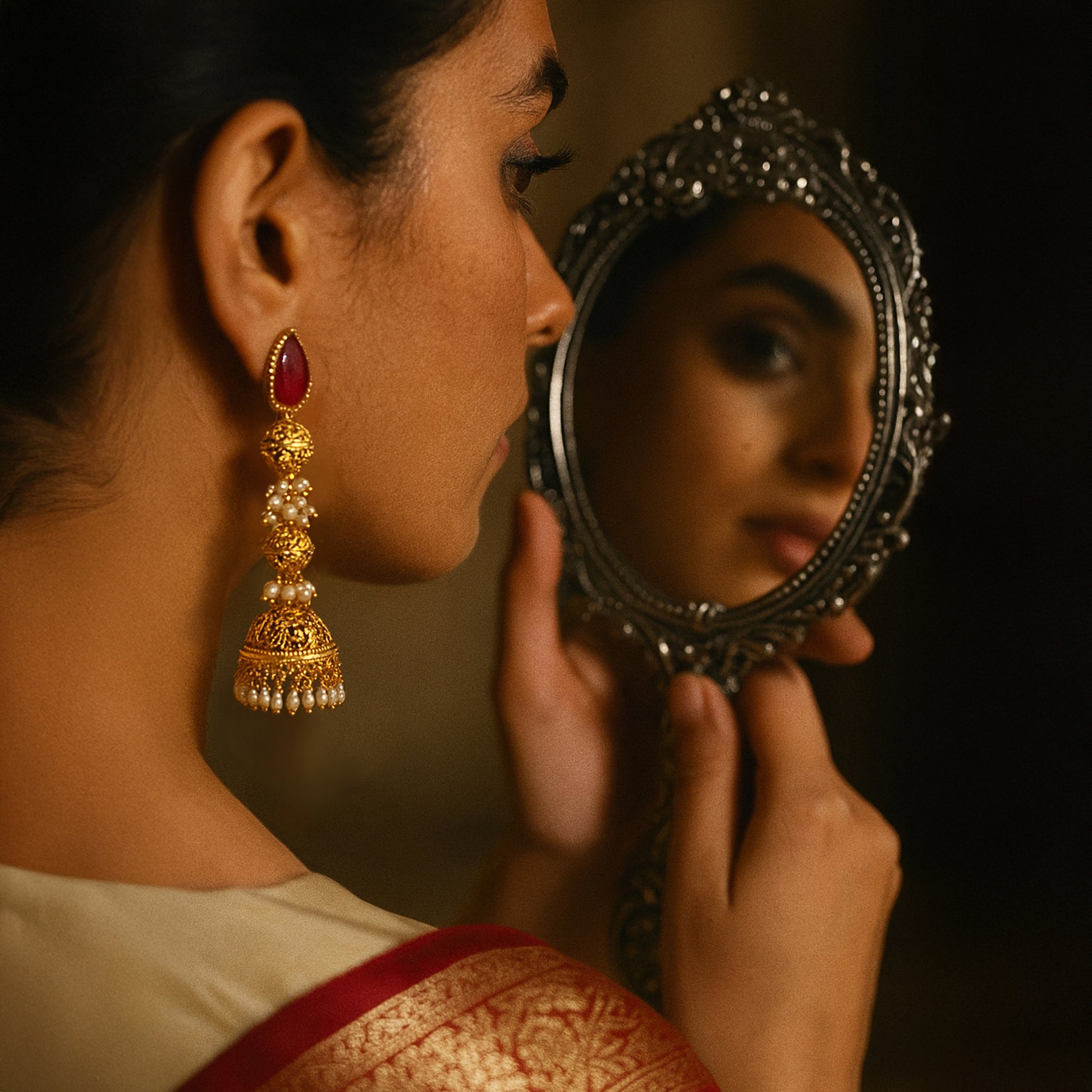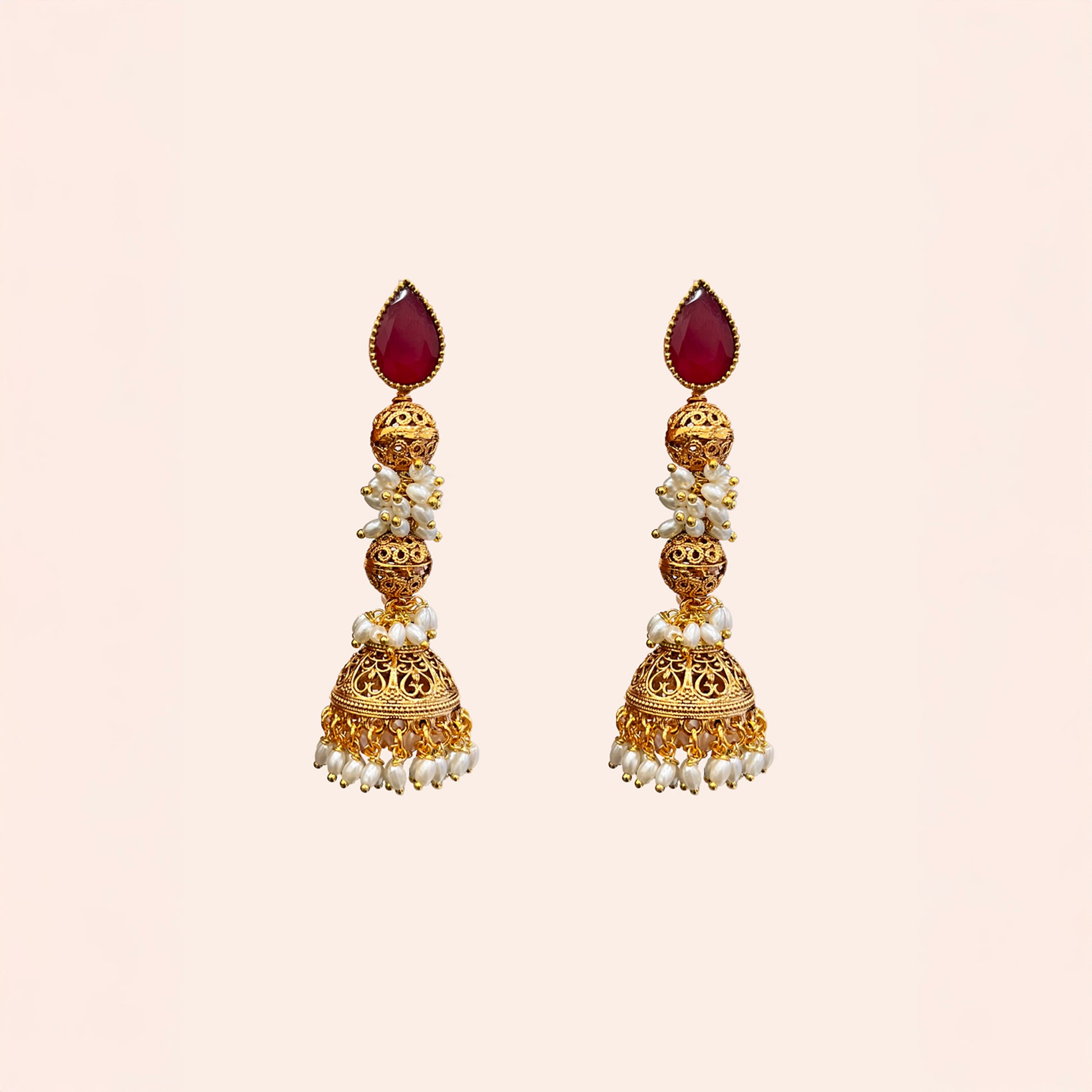 Kalakrith Milano Women long jhumki danglers feature elegant pear-shaped ruby studs paired with delicate pearl drop jhumki for a classic look. Crafted with a mix of pearl and filigree beads, they add vibrant texture and timeless charm to any ethnic outfit. Perfect for festive occasions and traditional celebrations.