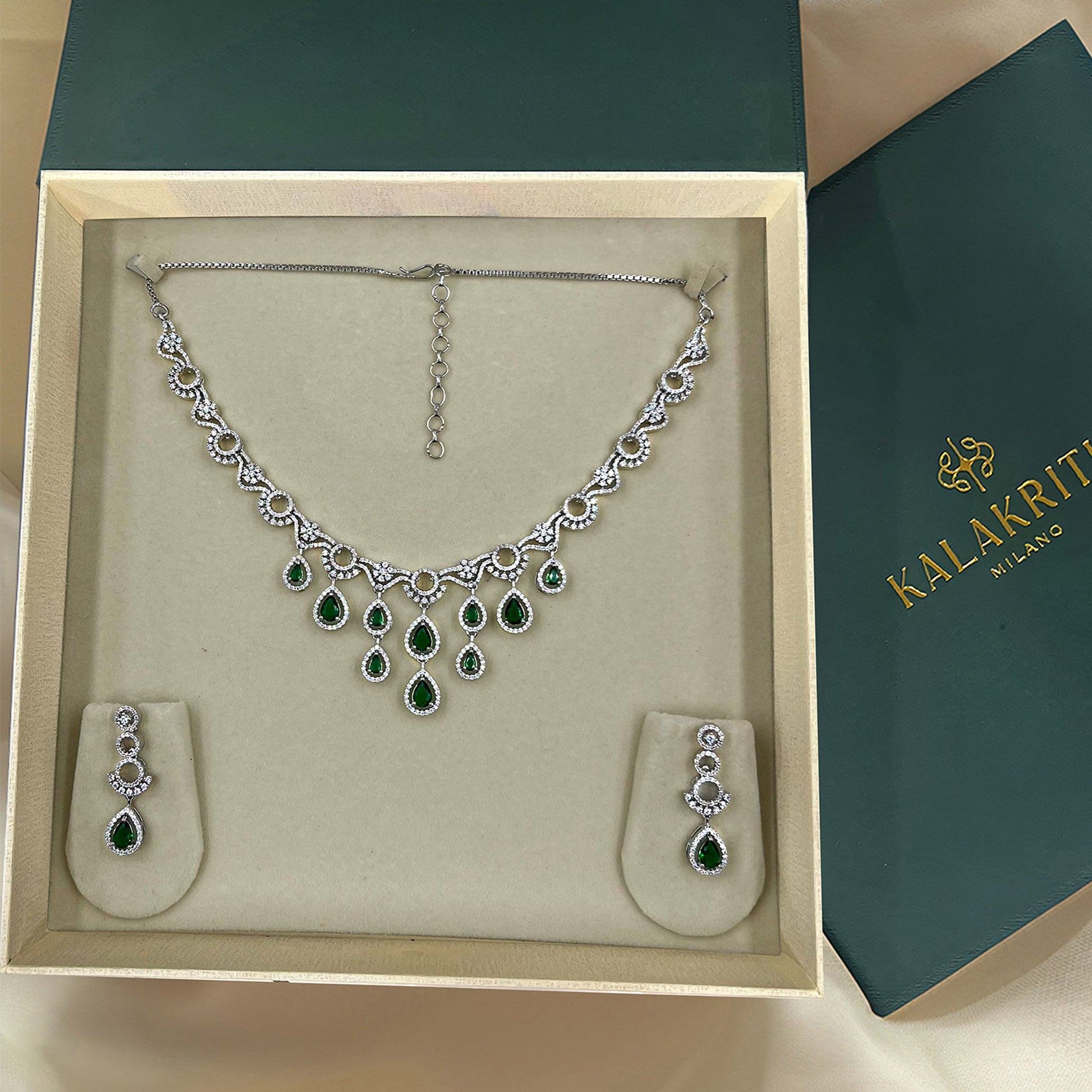 Kalakrith Milano Women magnificent waterfall necklace set, adorned with pear-drop emeralds, radiates a sense of royalty and timeless elegance