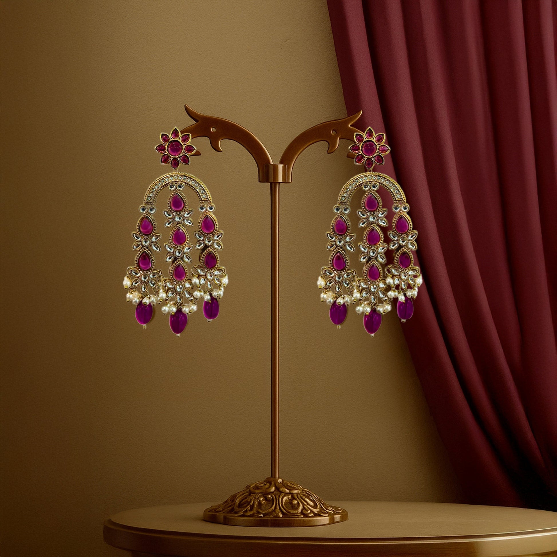 Kalakrith Milano Women Traditional dangler earrings featuring vibrant rani pink Monalisa stones, finished with a rich mehendi polish for an authentic, handcrafted look.