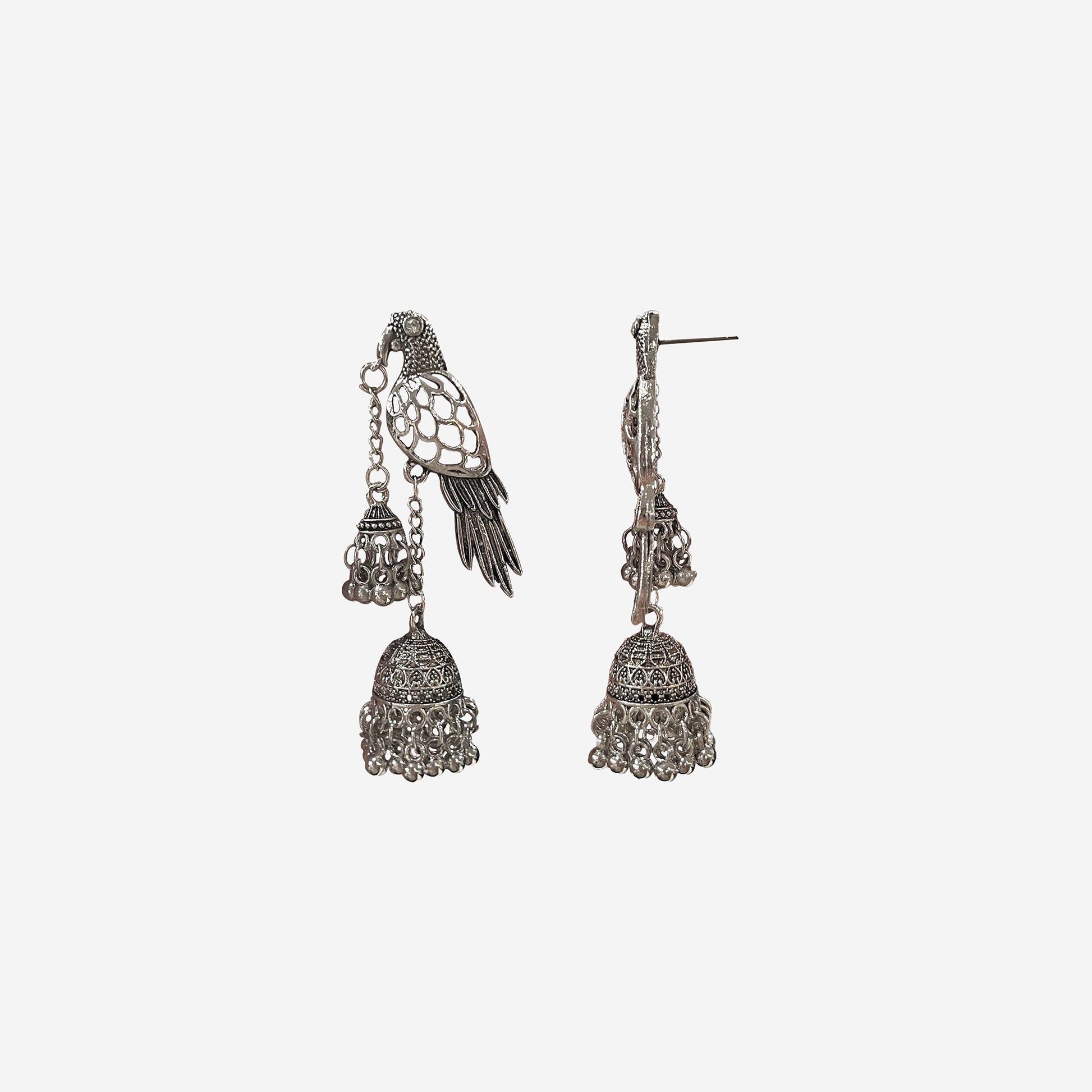 Kalakrith Milano Women oxidised earring features a parrot motif at the top, with two intricately carved jhumka-style danglers suspended from its beak. The design balances whimsy and tradition, with fine filigree detailing adding texture throughout. Style it with cotton sarees or lehengas for a charming folk-inspired accent.