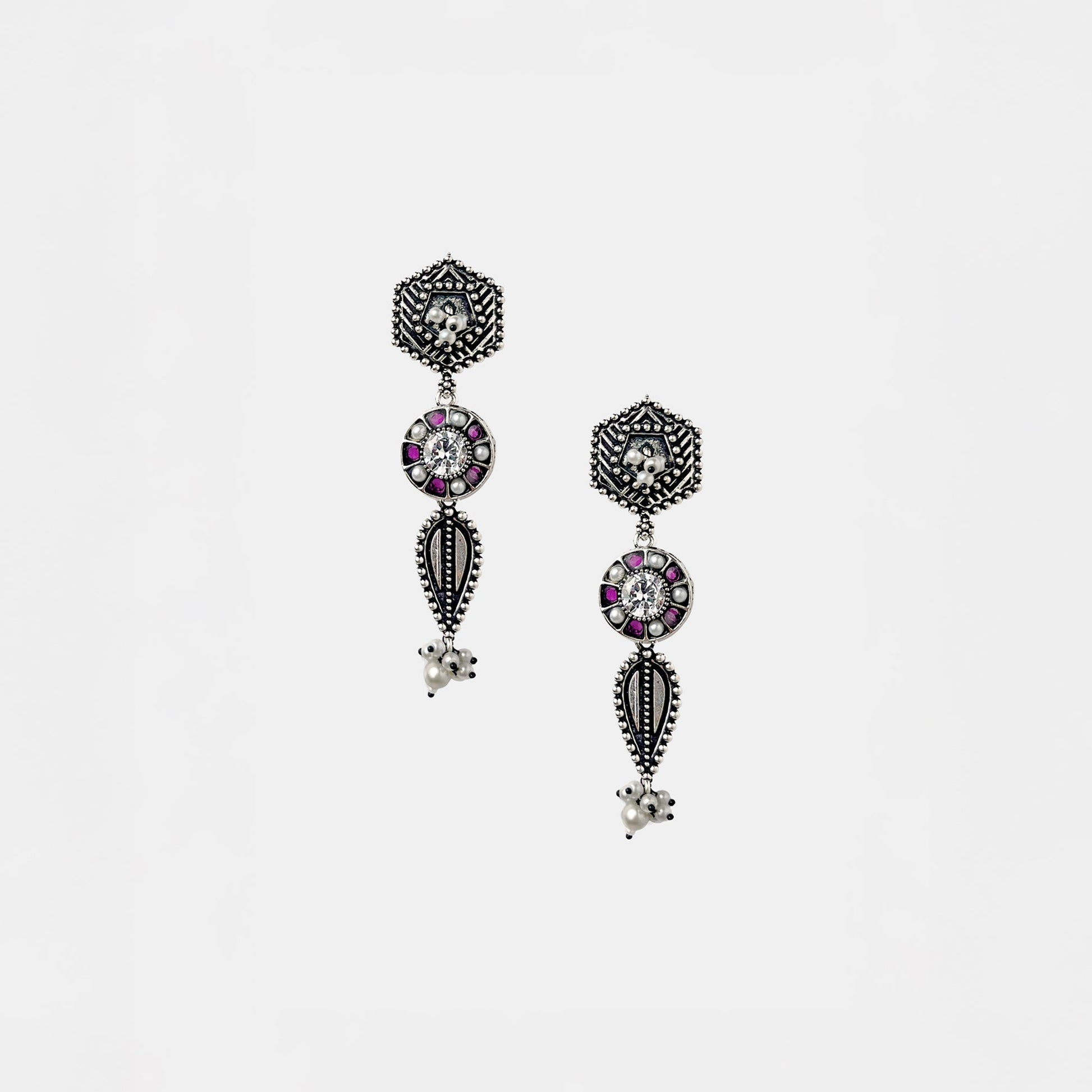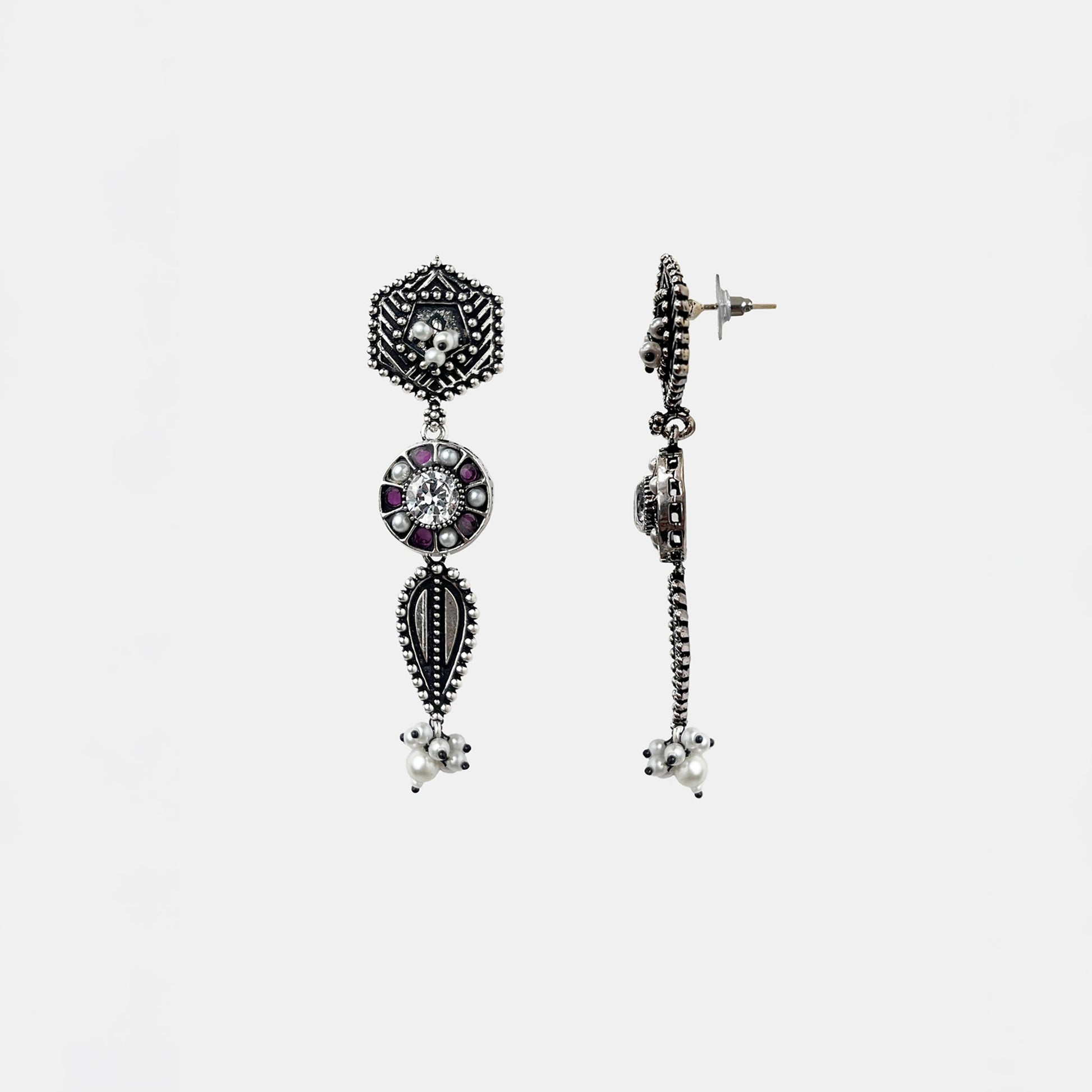 Kalakrith Milano Women Oxidized silver earring with a multi-tiered design featuring a hexagonal stud, pearl accents, maroon enamel work, and intricate bead detailing. The elongated silhouette gives it a refined ethnic appeal. Pair it with festive ensembles for an elegant touch.