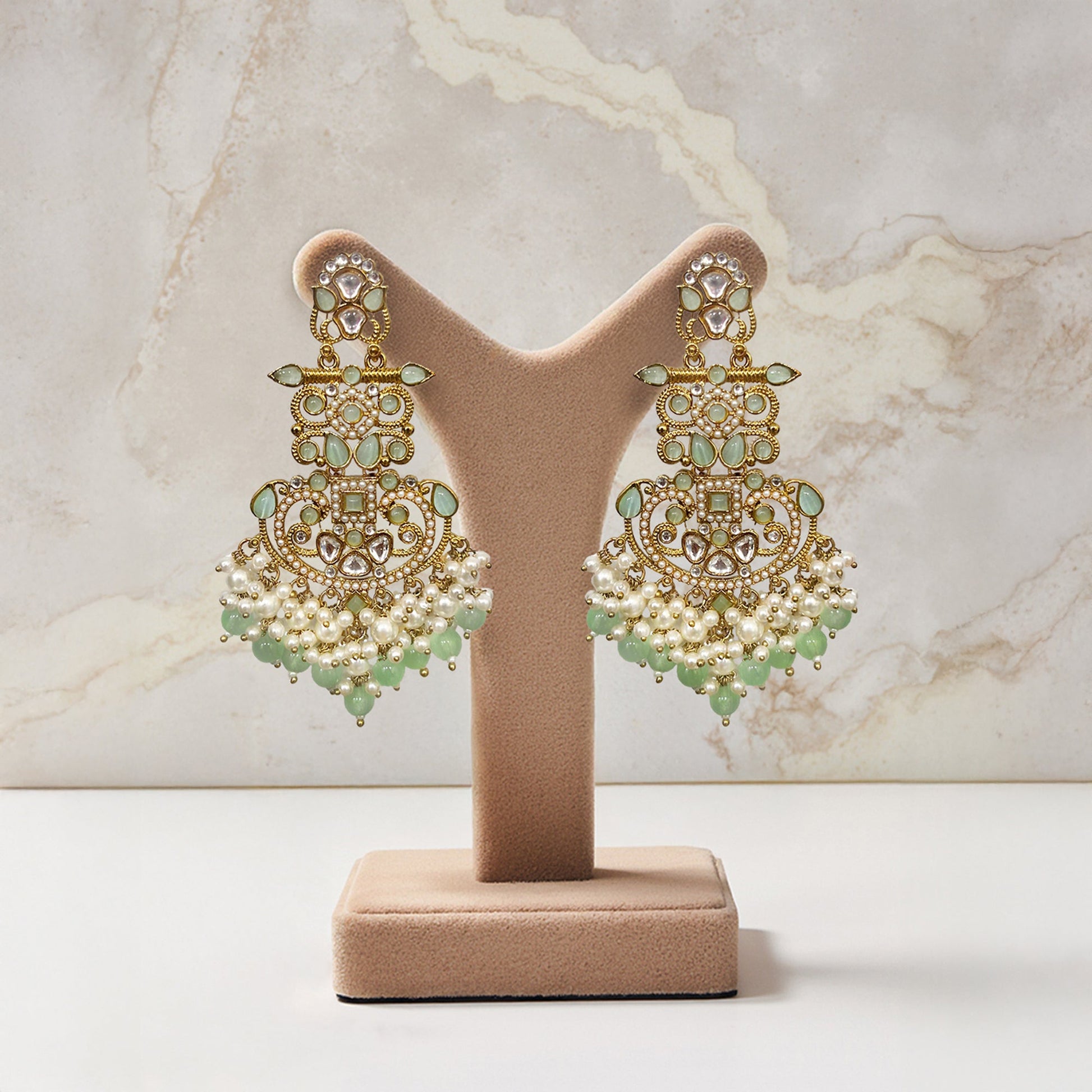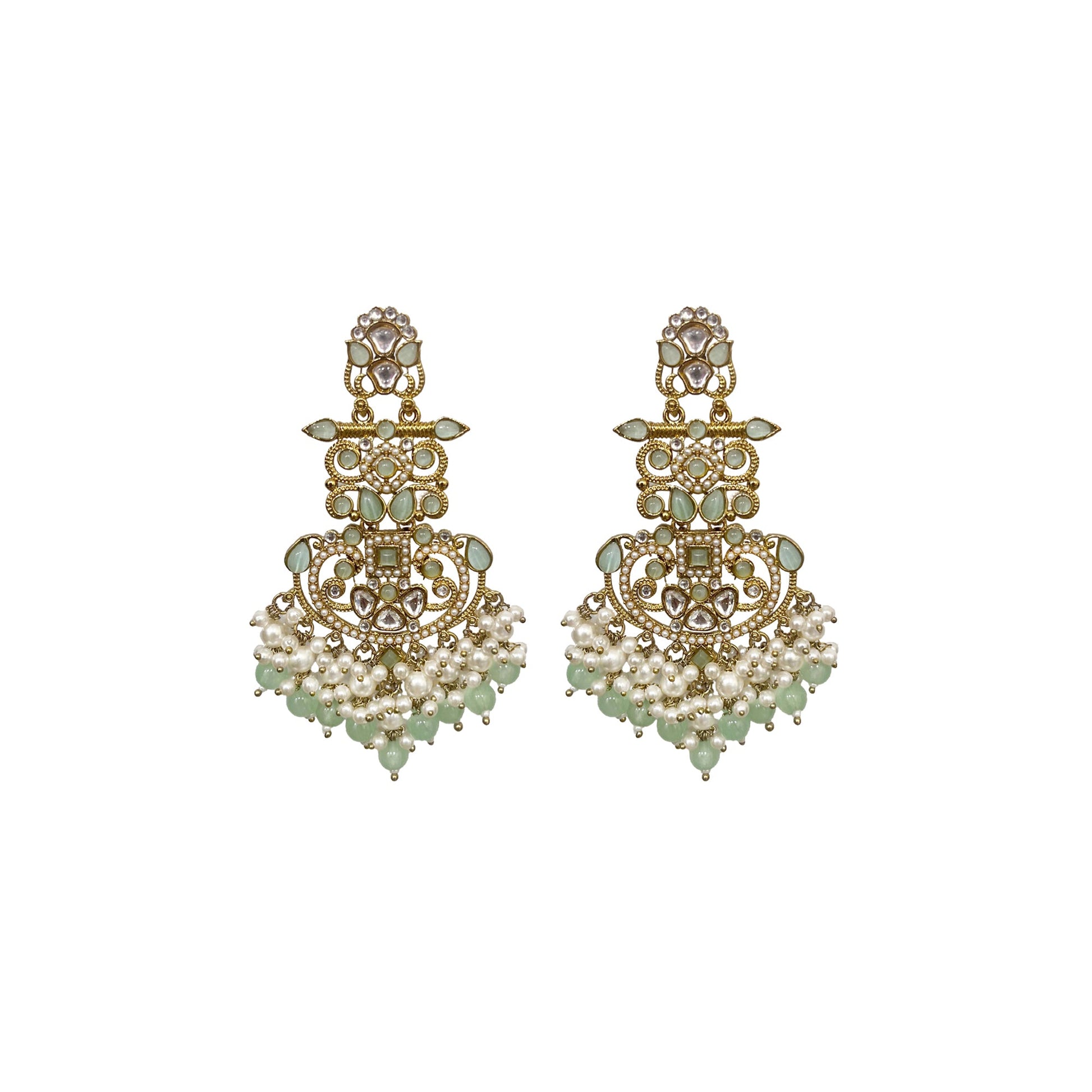 Kalakrith Milano Women Chandelier earrings in a refreshing mint green shade, featuring elegant Monalisa stones and pearl-studded details. Finished with delicate cluster drops of pearls and beads for a graceful, eye-catching look.