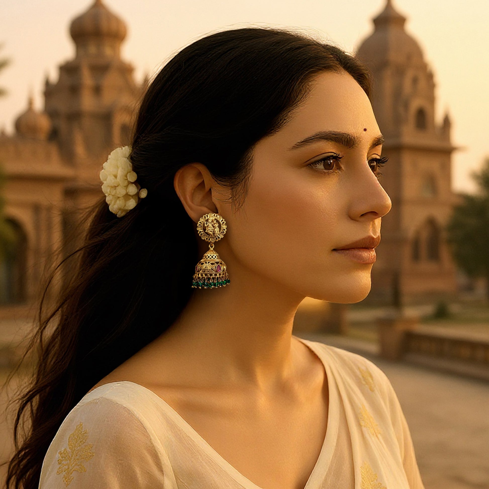 Kalakrith Milano Women temple-style jhumkis featuring a Radha Krishna embossed design and elegant green emerald-colored drops. Lightweight and versatile, they’re perfect for everyday ethnic wear. The intricate detailing adds a spiritual and graceful touch to your daily look.