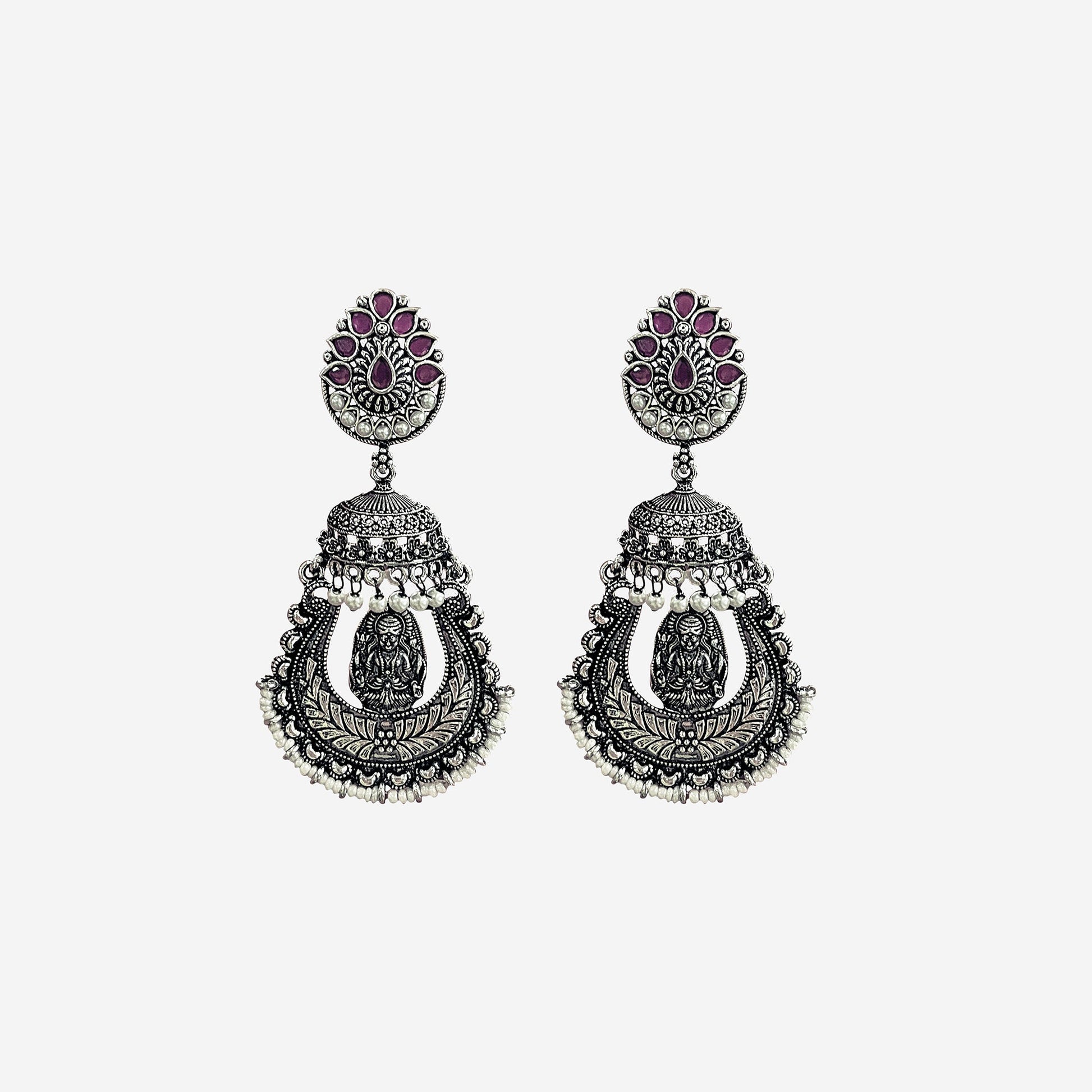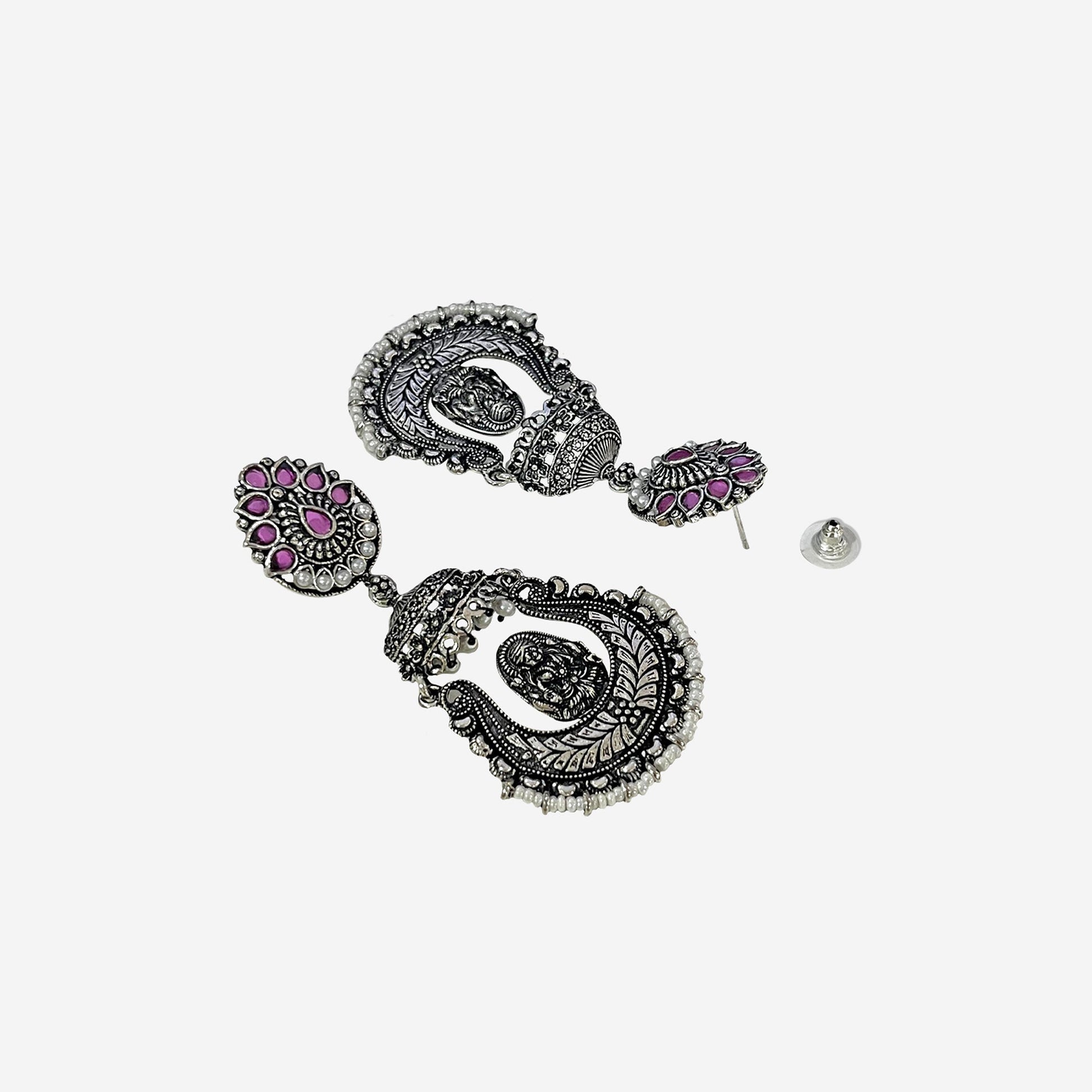 Kalakrith Milano Women Oxidized silver-tone earring featuring a deity motif in a teardrop frame, embellished with intricate carvings, pearl detailing, and magenta stone accents on the stud. The design blends spiritual elegance with vintage charm. Style it with traditional attire for festive occasions or temple visits.
