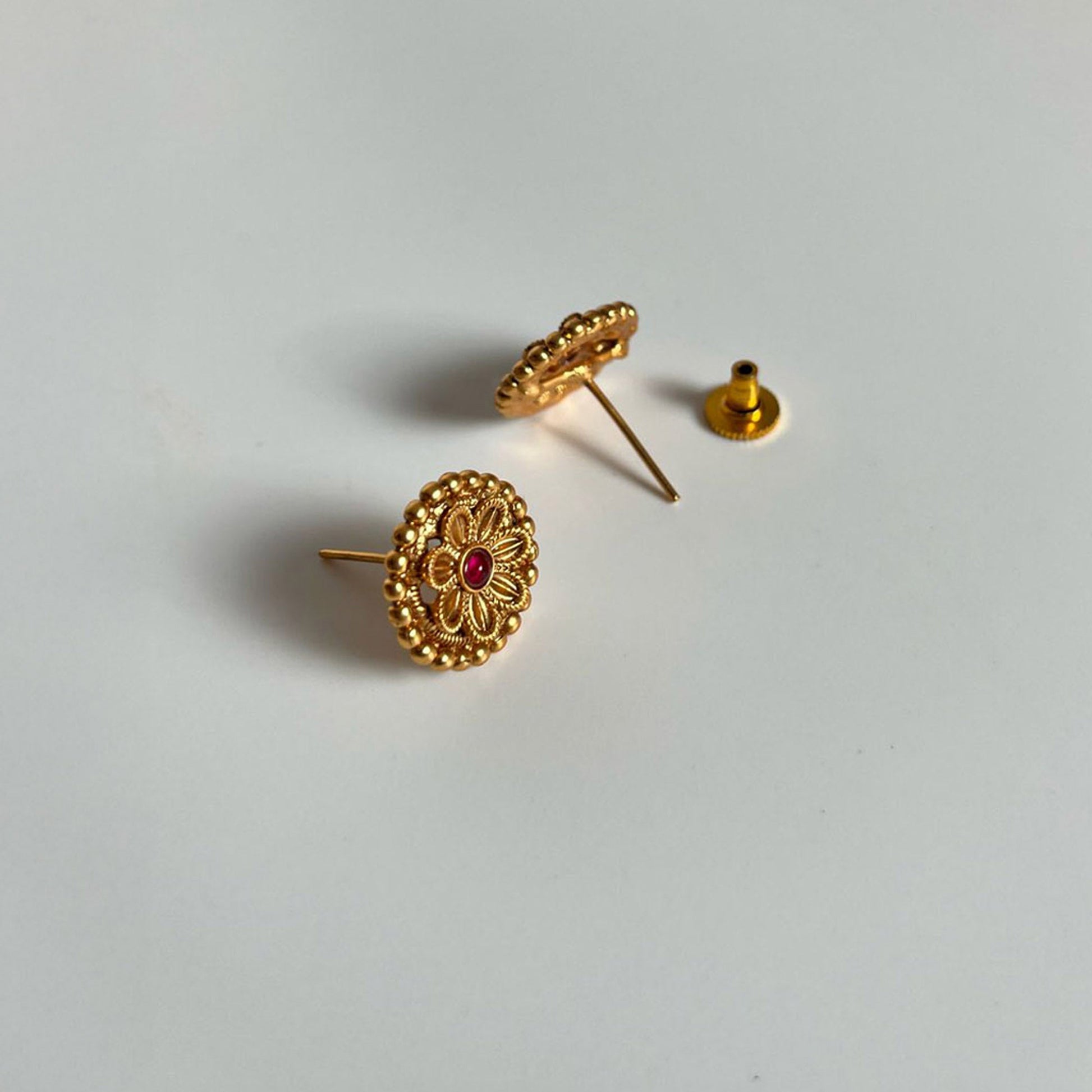Kalakrith Milano Women vintage-inspired necklace set features a circular gemstone pendant, ruby-toned beads, and intricate gold detailing, paired with matching stud earrings for a traditional look.