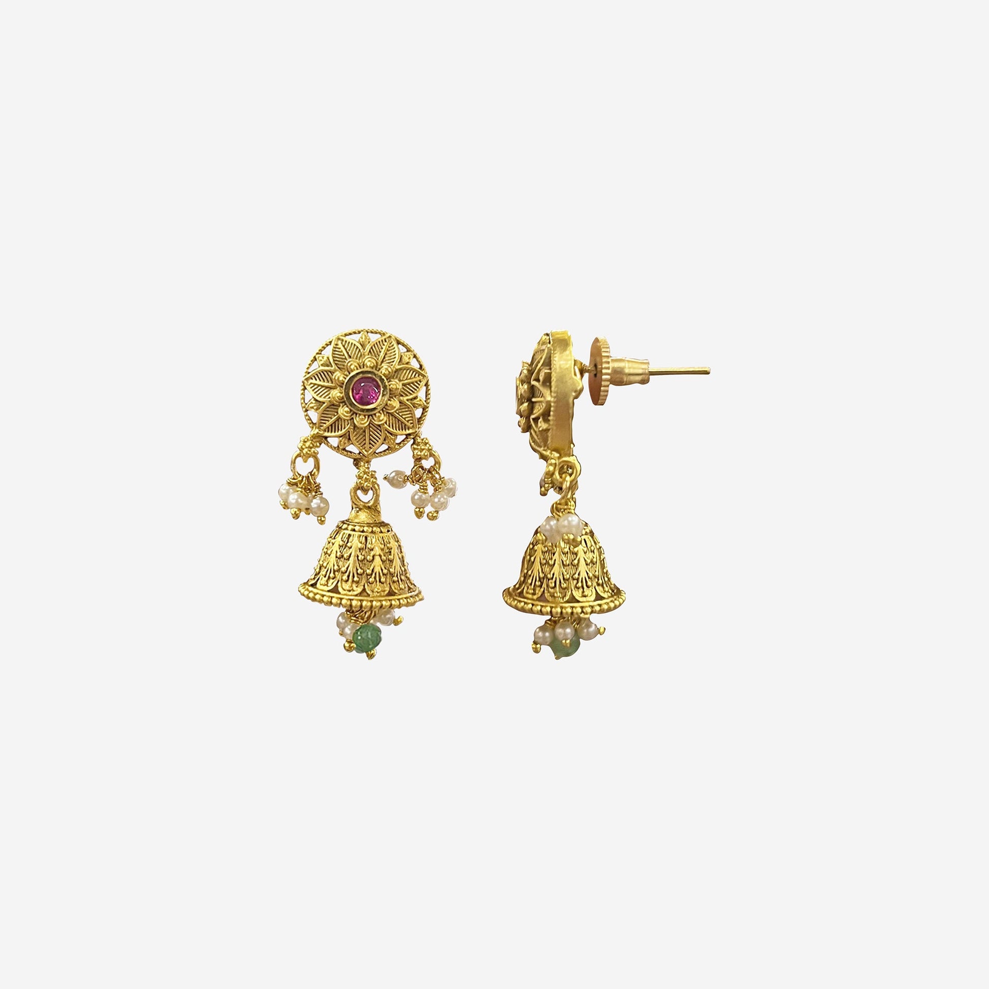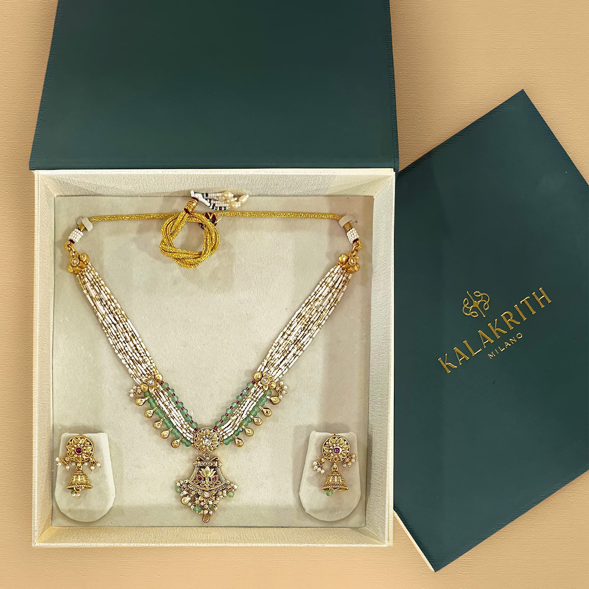 Kalakrith Milano Women featuring delicate mint green beads, tiny pearls, and golden accents this necklace is an example of the grace of royalty. A stunning centerpiece, complemented by small stations and tiny jhumkis, creates a princess-like aura that blends tradition with timeless elegance.