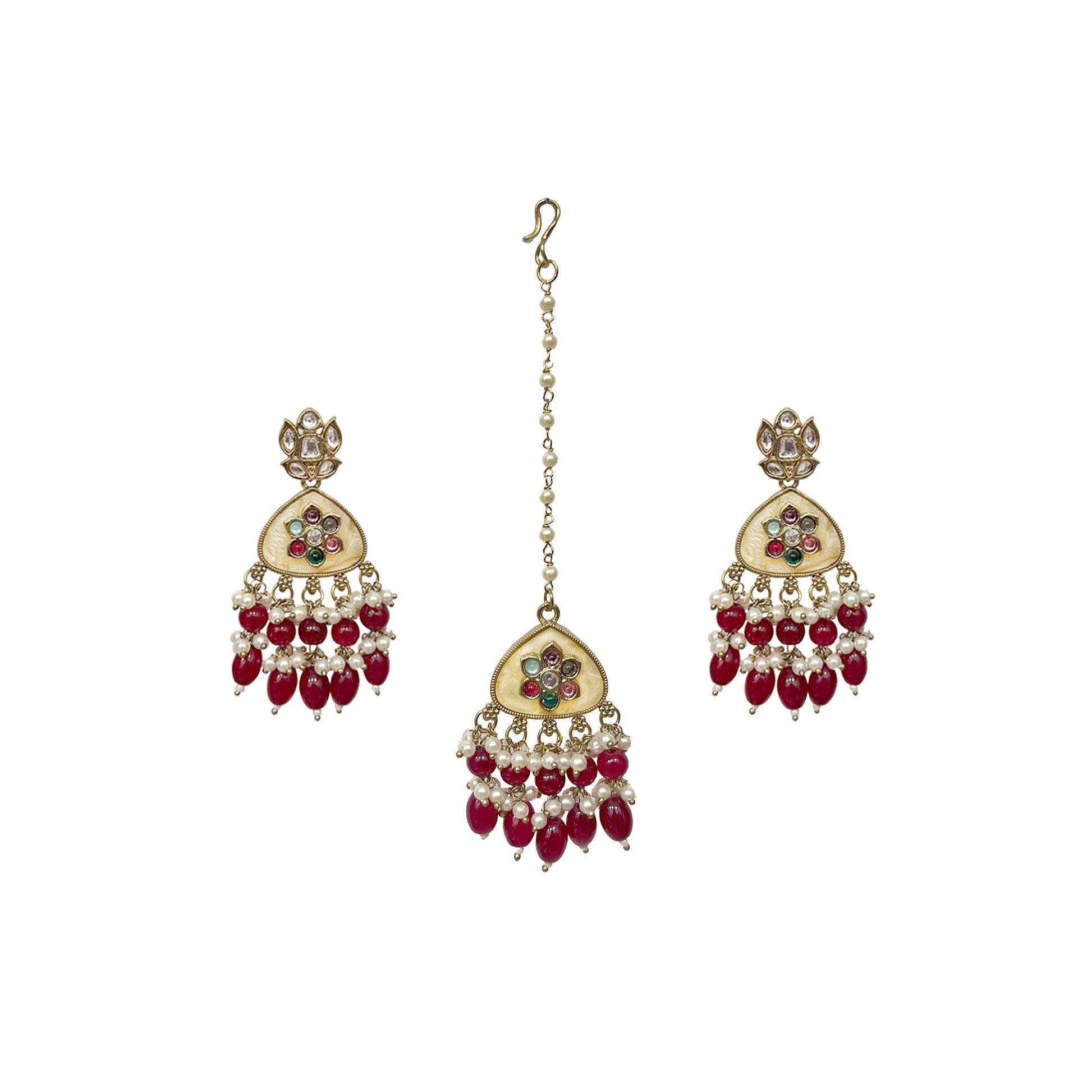 Kalakrith Milano Women exquisite multi strand beaded necklace features delicate beads, lustrous pearls, and a beige Mother of Pearl center, enhanced with vibrant ruby drops. Paired perfectly with short drops and a matching maangtikka, it beautifully complements traditional sarees, adding an elegant and timeless touch to any ethnic ensemble.