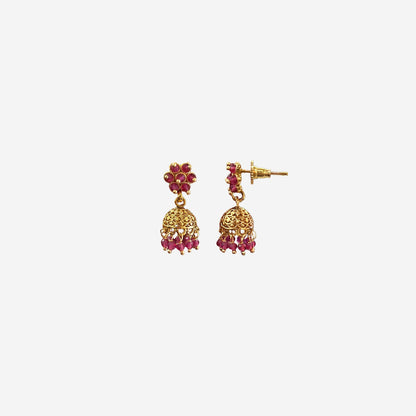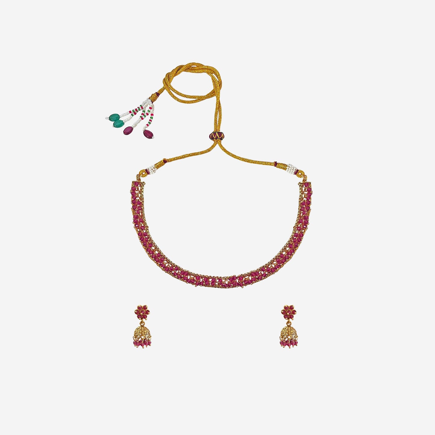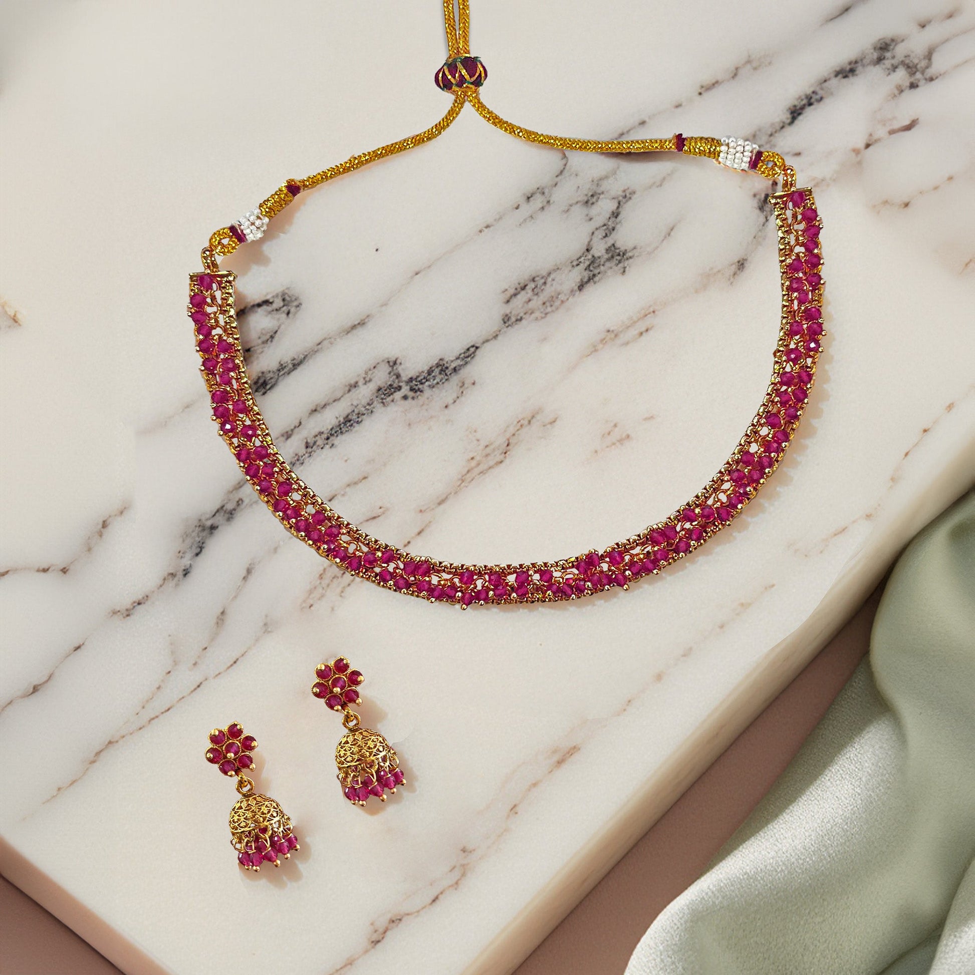 Kalakrith Milano Women elegant single-line choker features pinkish ruby stones studded on a golden base, offering a graceful and sophisticated look. Paired with tiny jhumkis, it’s perfect for everyday wear and can effortlessly complement both ethnic and western outfits. Lightweight and versatile, it adds a subtle touch of antique to any occasion.