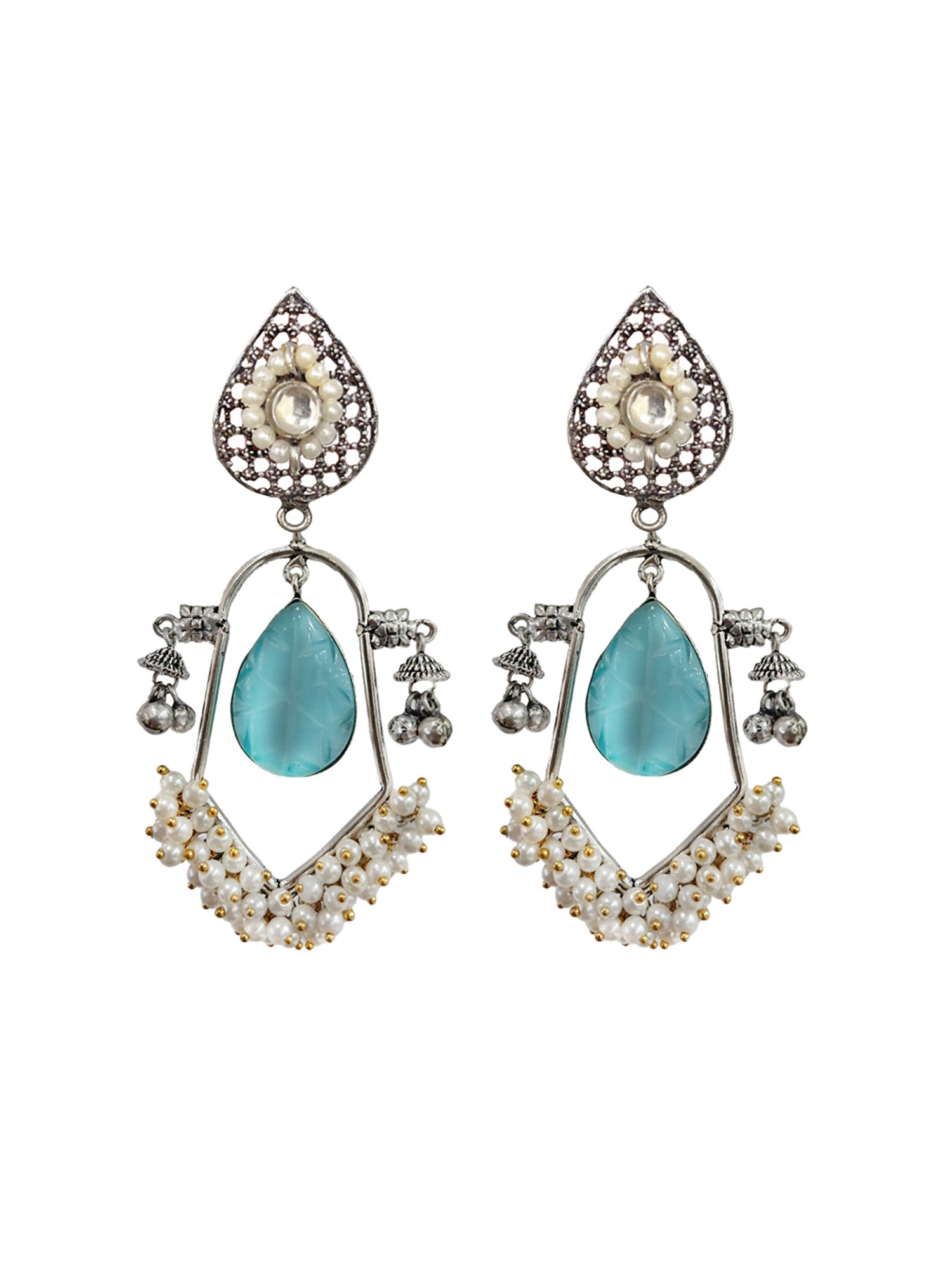 Kalakrith Milano Women oxidised earring features a prominent aqua blue teardrop stone suspended within an arched frame, adorned with clusters of pearl danglers and tiny oxidised ghungroo-style beads. The stud is set with a sparkling white stone adding character. The overall design gives off an antique, handcrafted charm with hints of nomadic influence. Style it with layered ethnic wear for a bold, artistic touch.