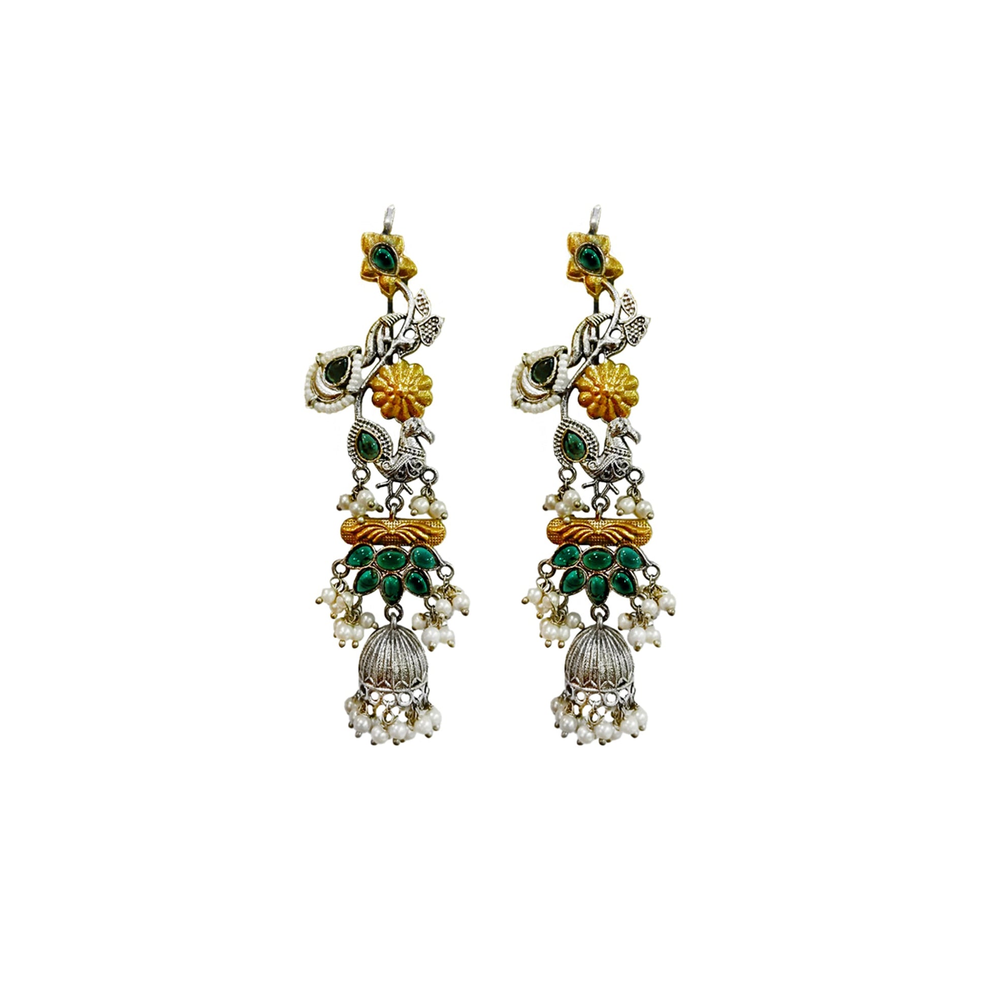 Kalakrith Milano Women oxidised earcuff earring features a layered design with intricate floral and bird motifs, accented by green stones and gold-tone highlights. The piece begins with an earcuff at the top, leading into a cascading structure that ends in a jhumka adorned with pearls. Ideal for traditional or fusion wear making a bold and elegant statement.